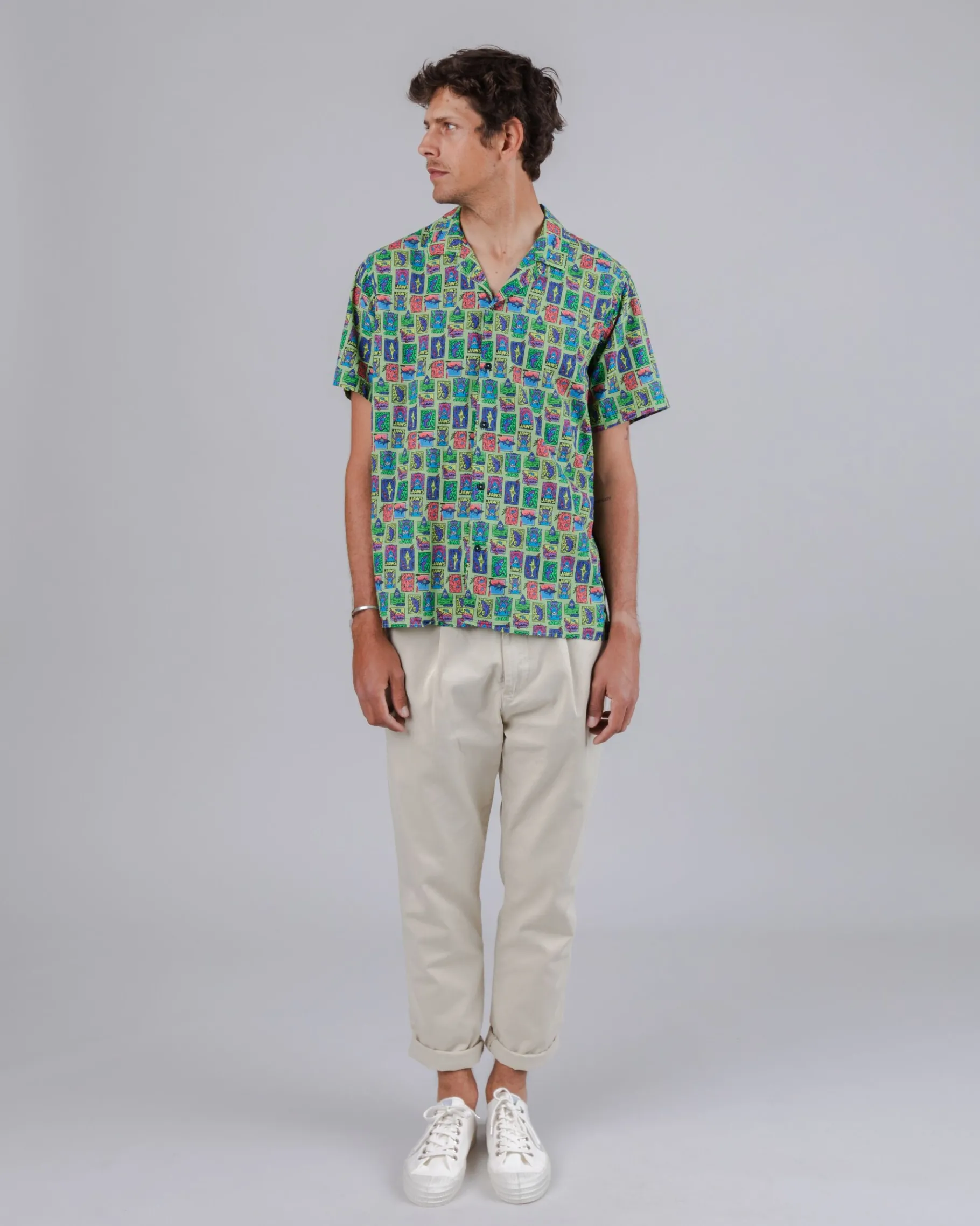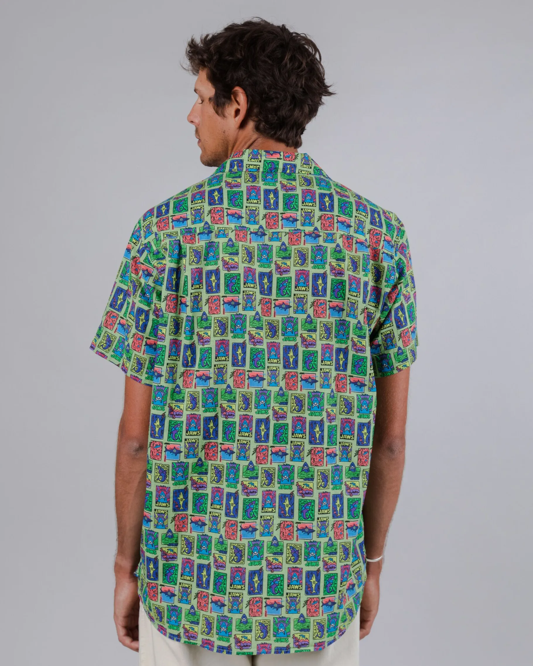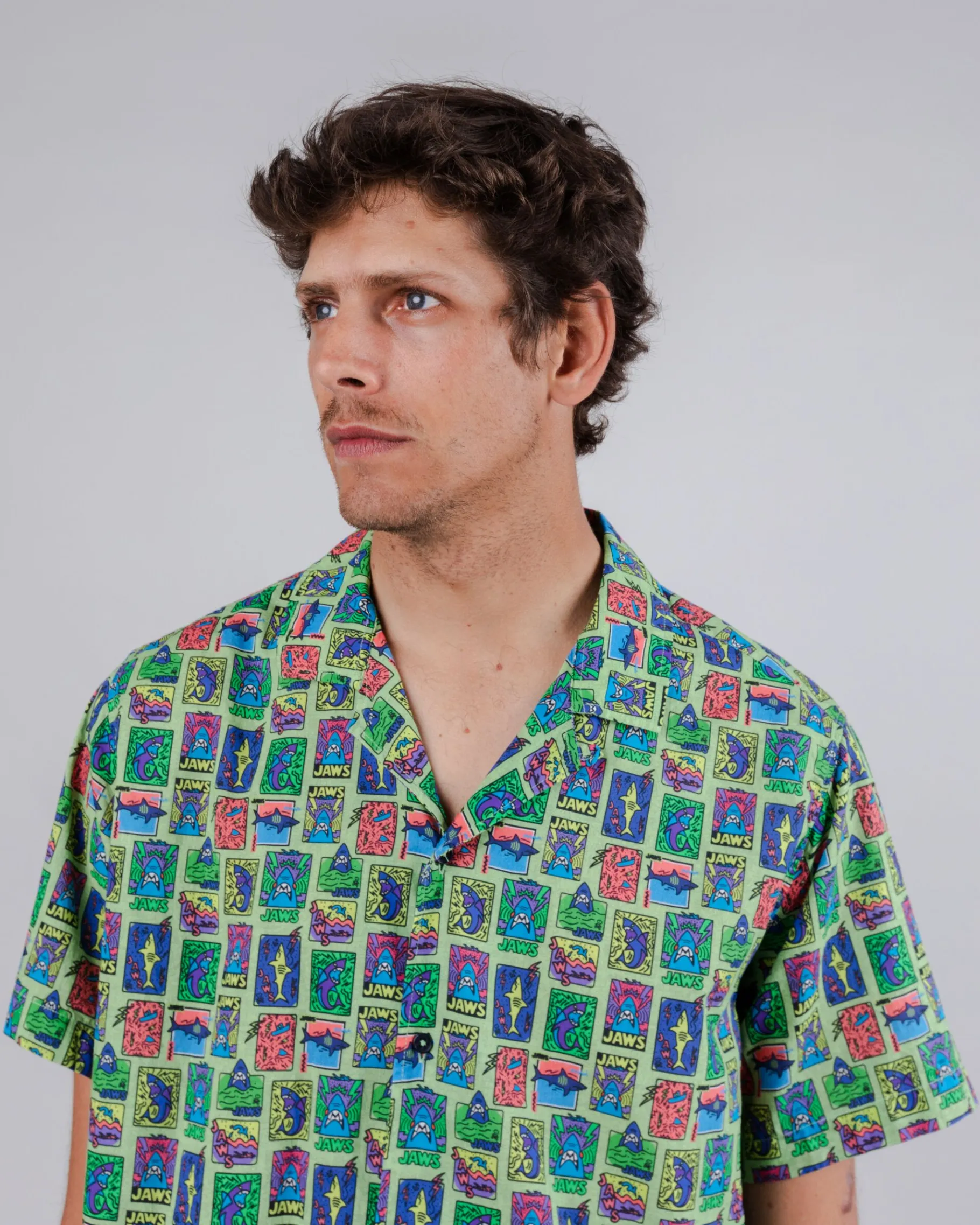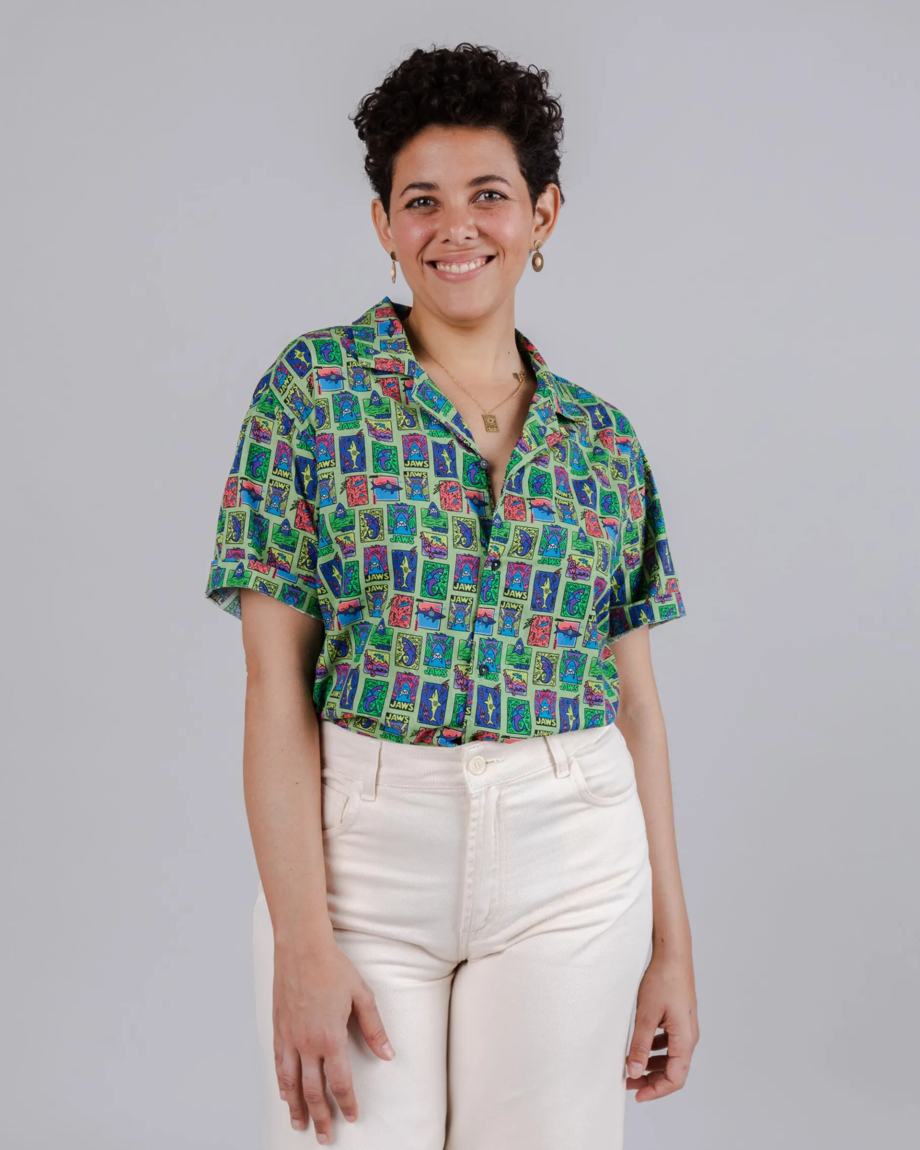 Kurzärmeliges Aloha-Shirt mit Jaws-Aufdruck in entspannter Passform. Es hat eine leicht überschnittene Schulter, einen geraden Saum, einen Reverskragen und einen Knopfverschluss. Ethisch hergestellt aus biologischer Baumwolle.| Waschhinweise