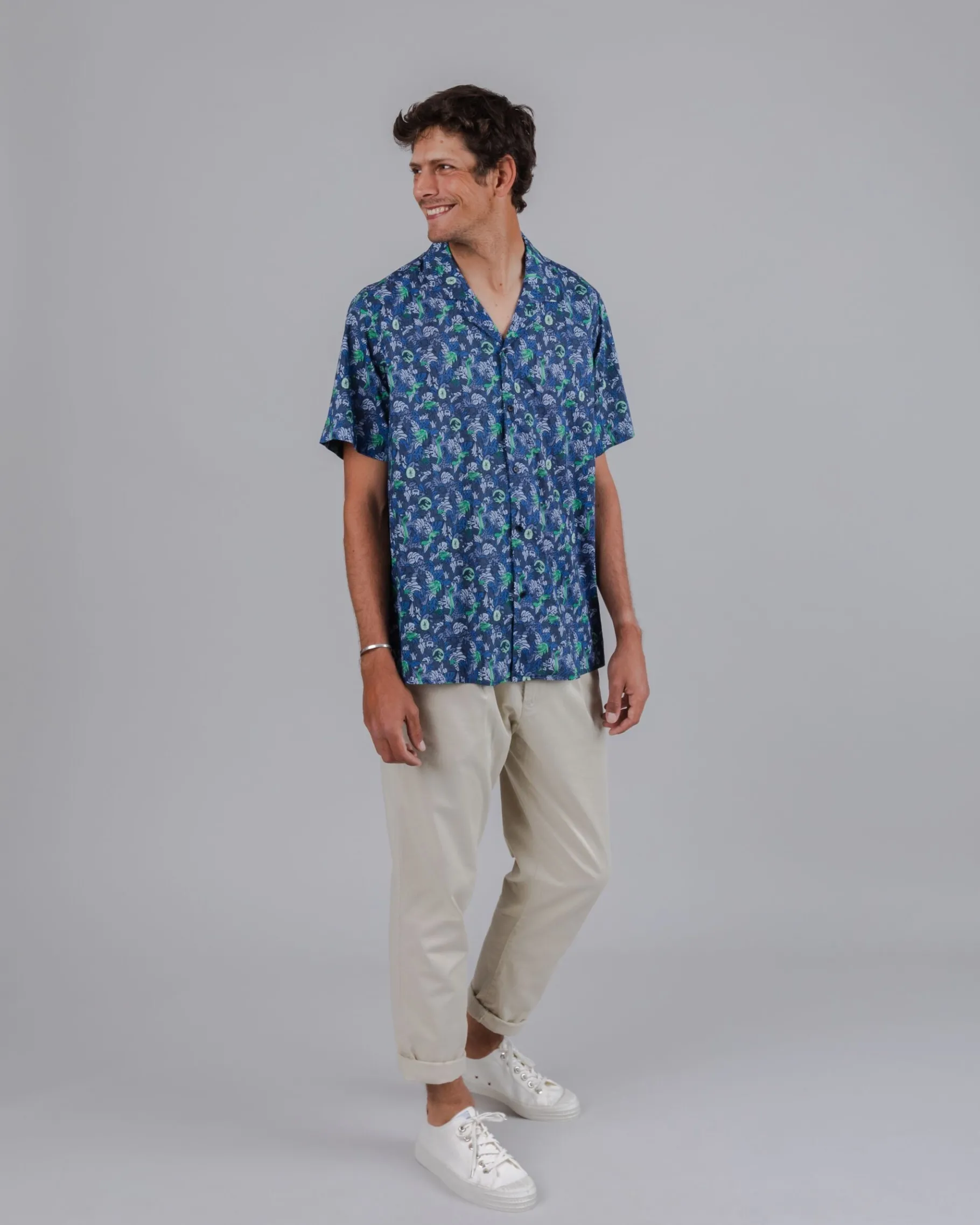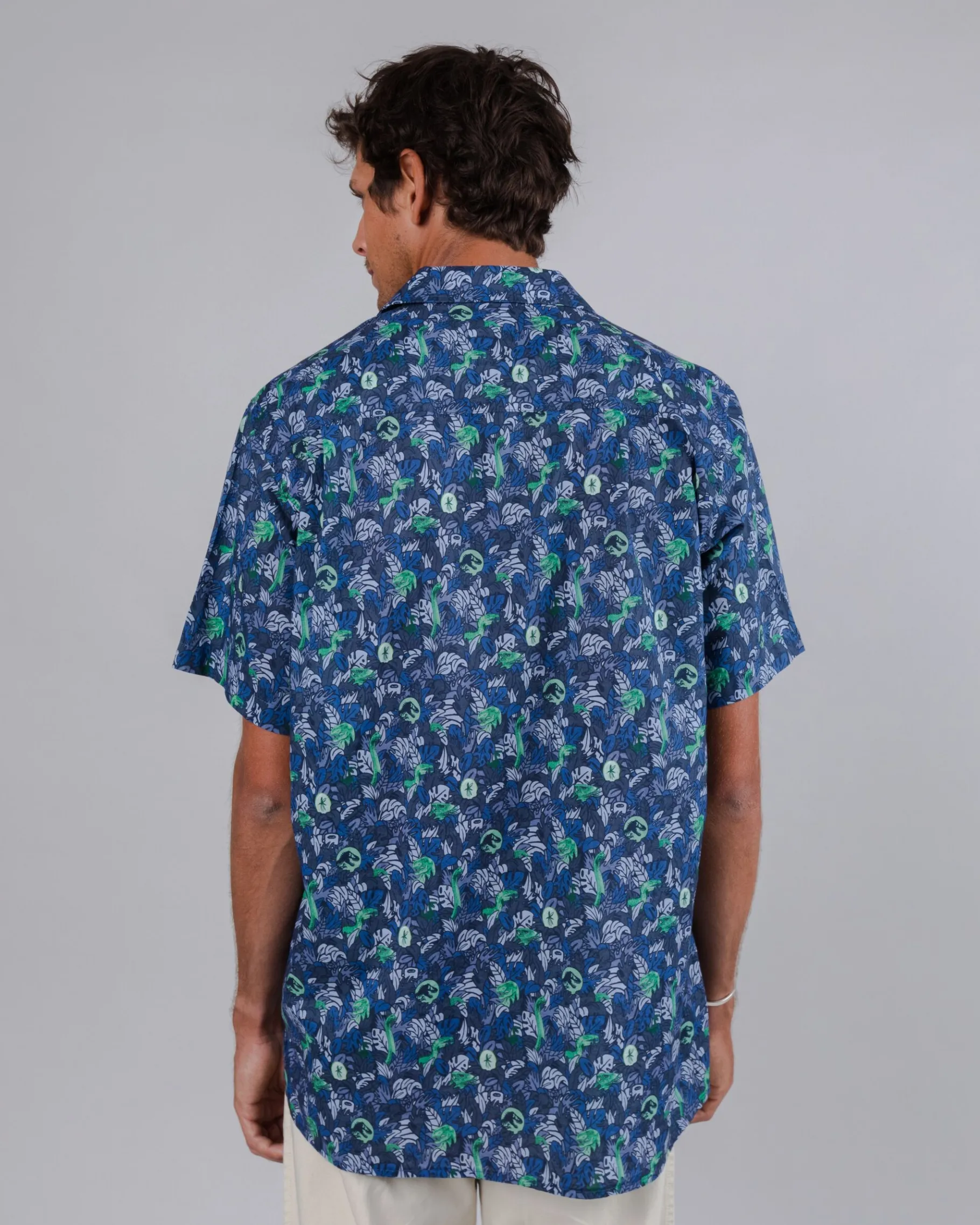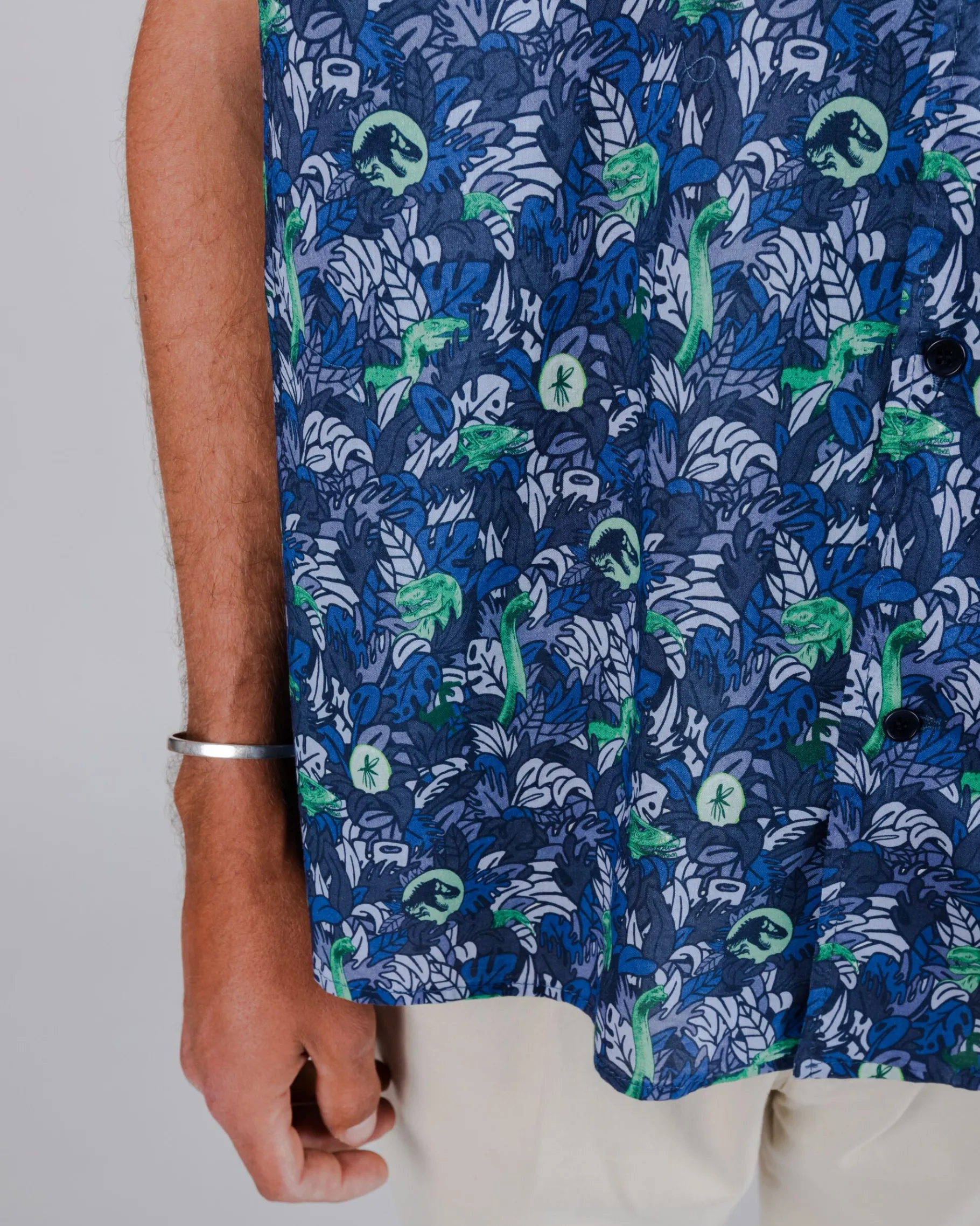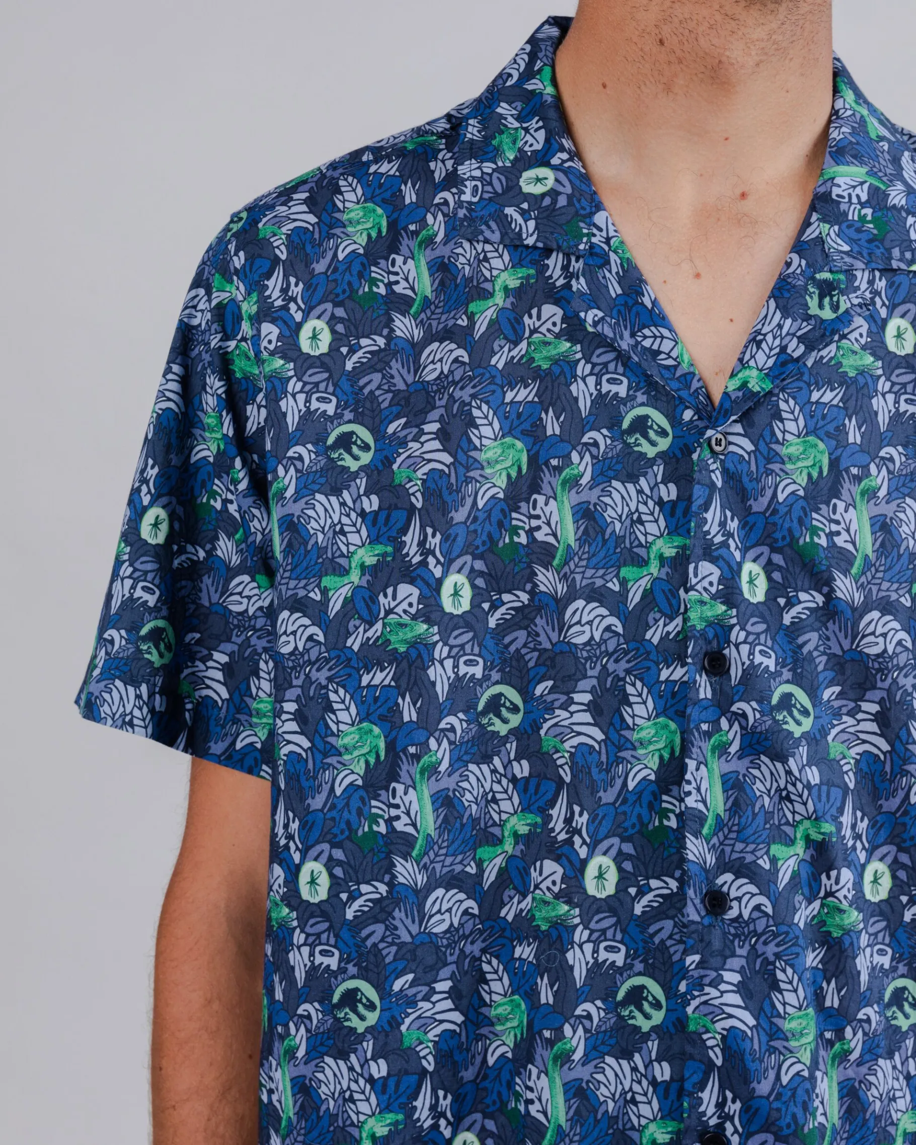 Kurzärmeliges Aloha-Shirt mit Jurassic Park-Aufdruck in entspannter Passform. Es hat eine leicht überschnittene Schulter, einen geraden Saum, einen Reverskragen und einen Knopfverschluss. Ethisch hergestellt aus biologischer Baumwolle.| Waschhinweise