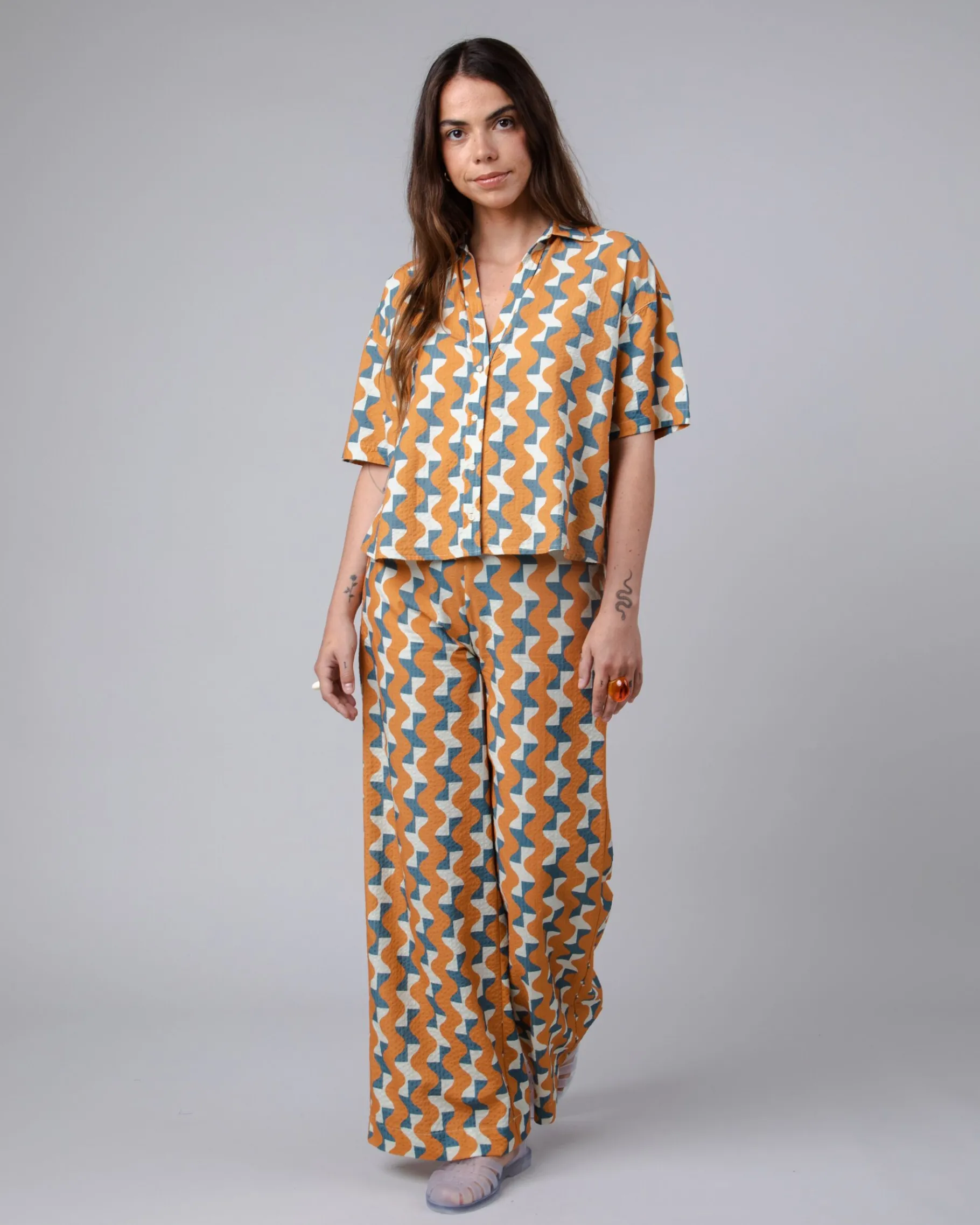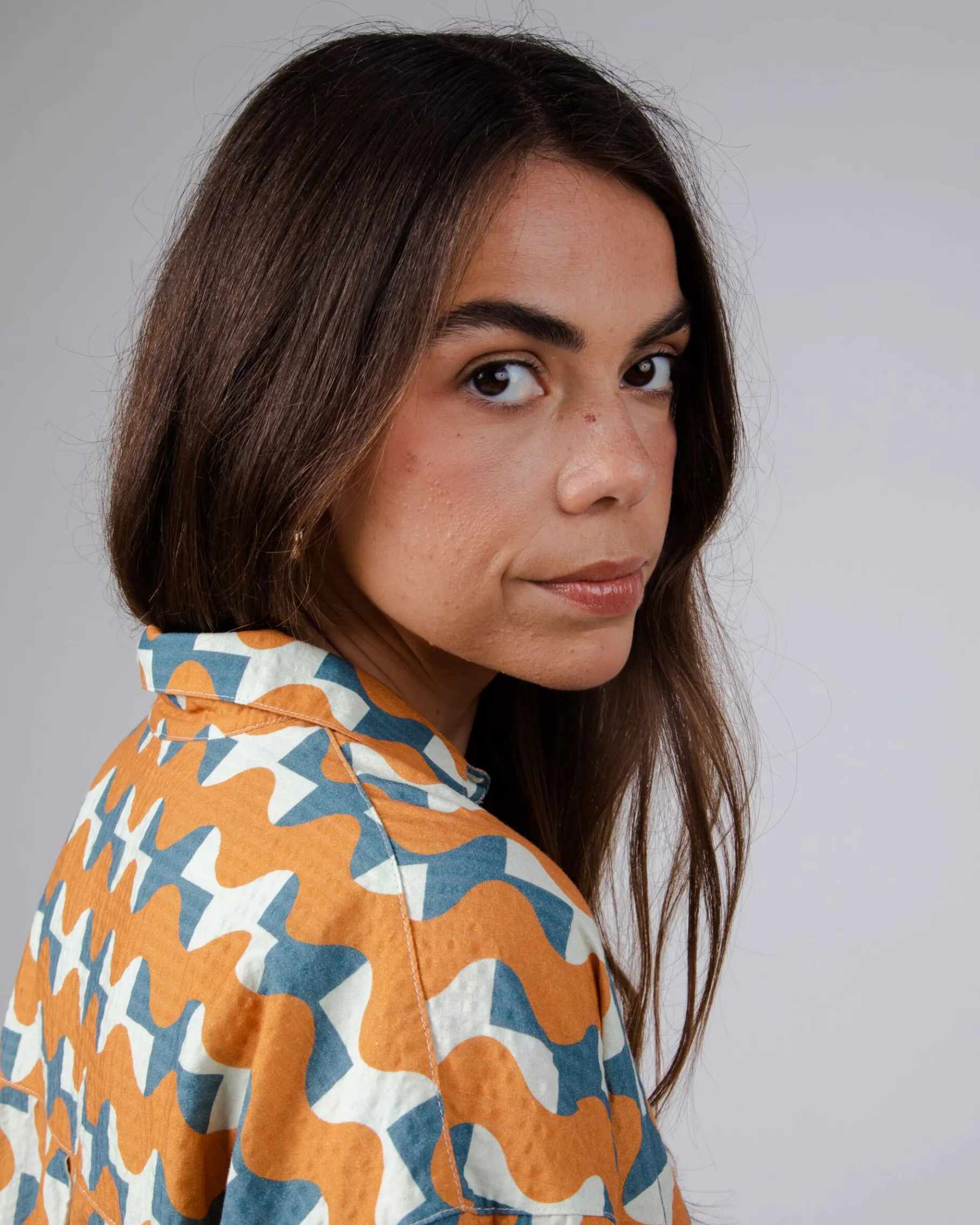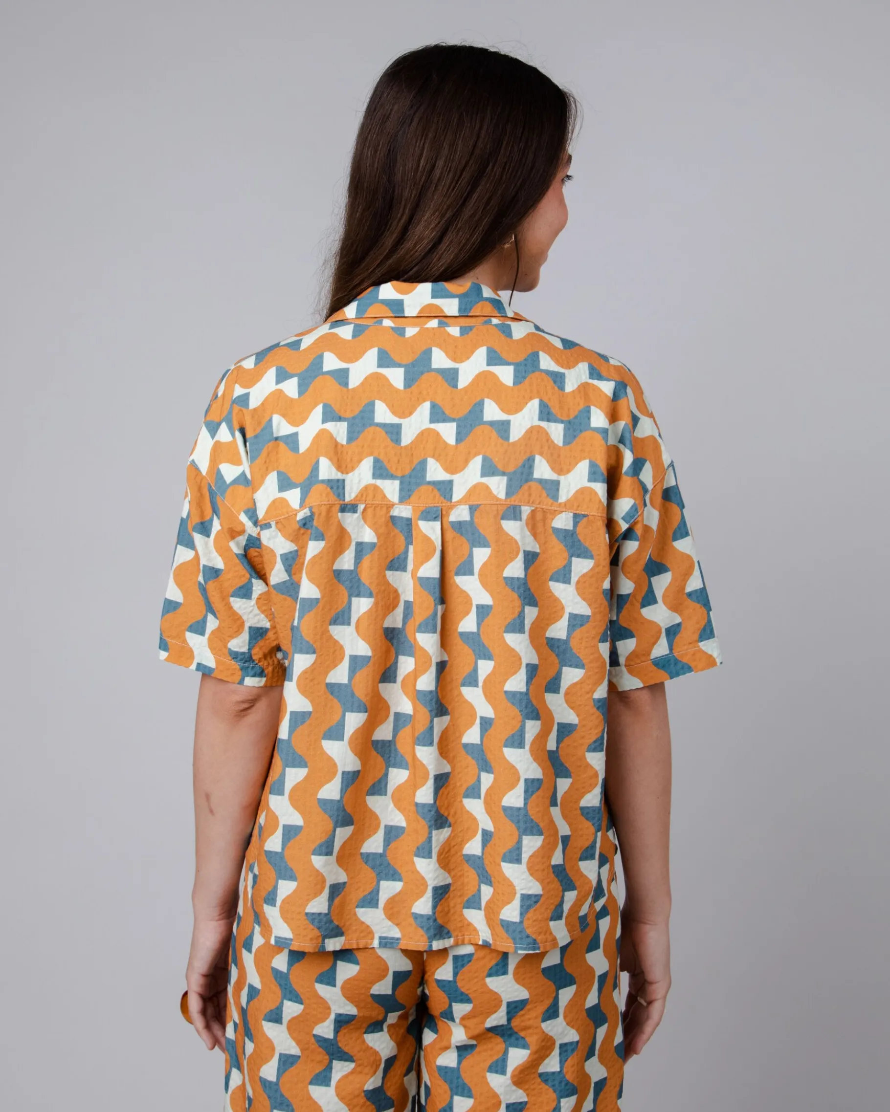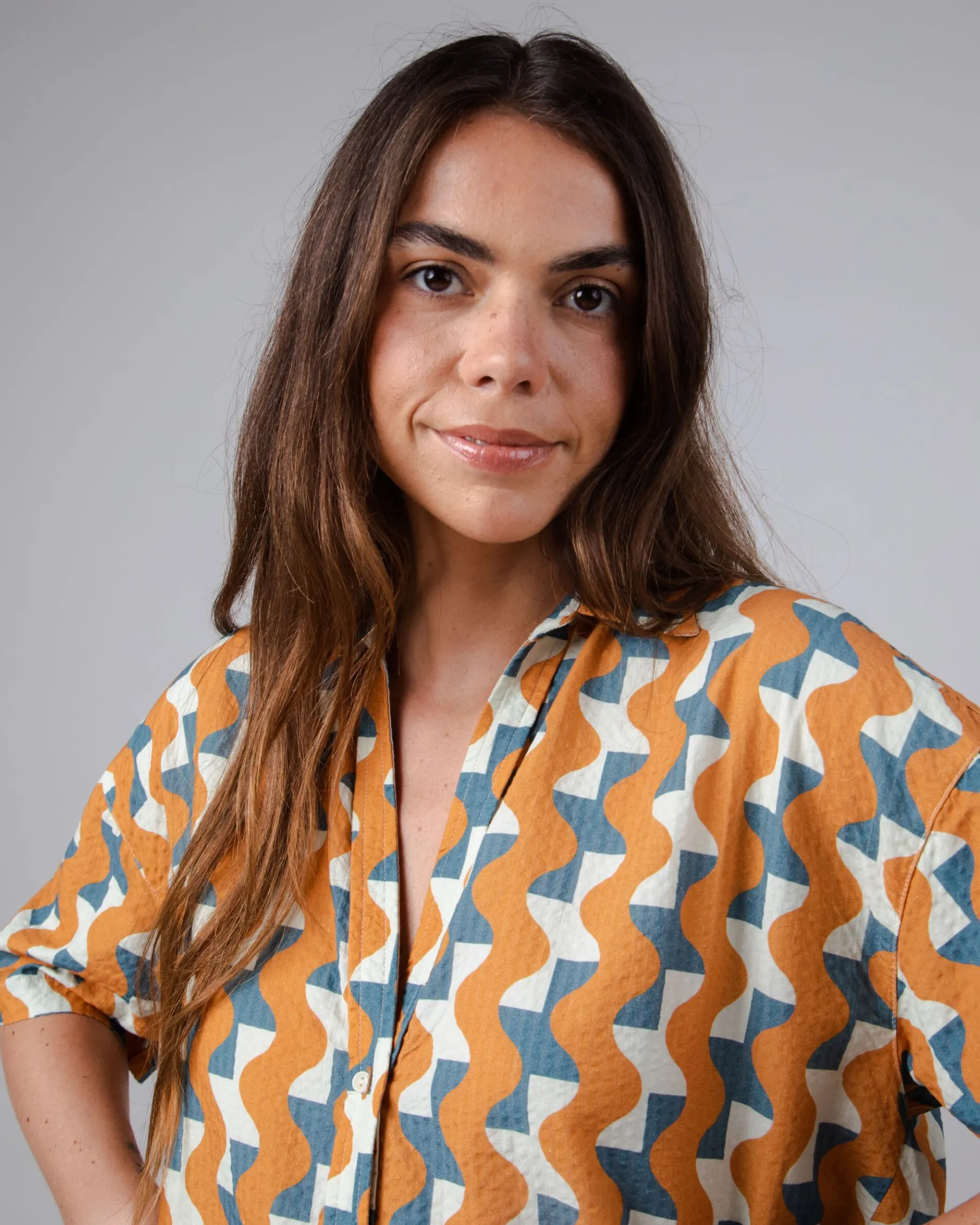 Bedruckte Kurzarmbluse in Übergröße mit V-Ausschnitt, leicht überschnittener Schulter und Knopfverschluss.Ethisch hergestellt aus Bio-Baumwolle und nachhaltiger Viskose.| Waschhinweise