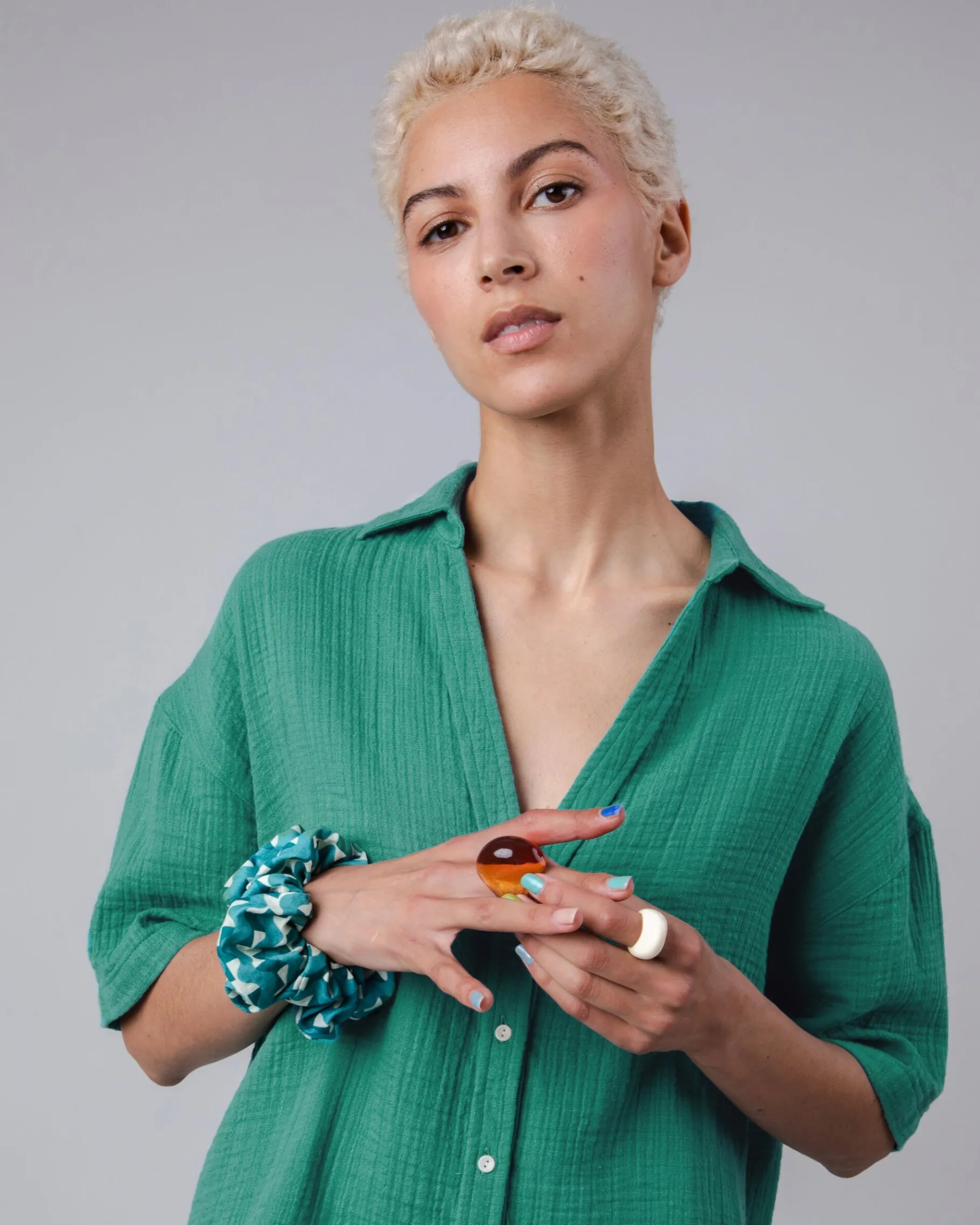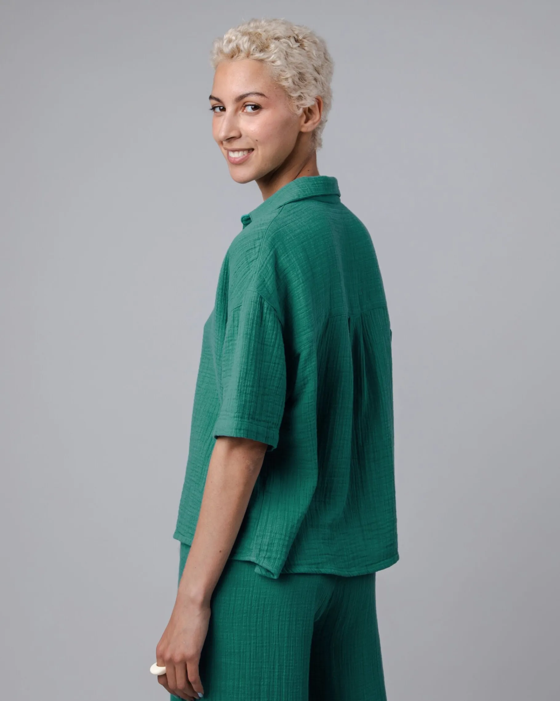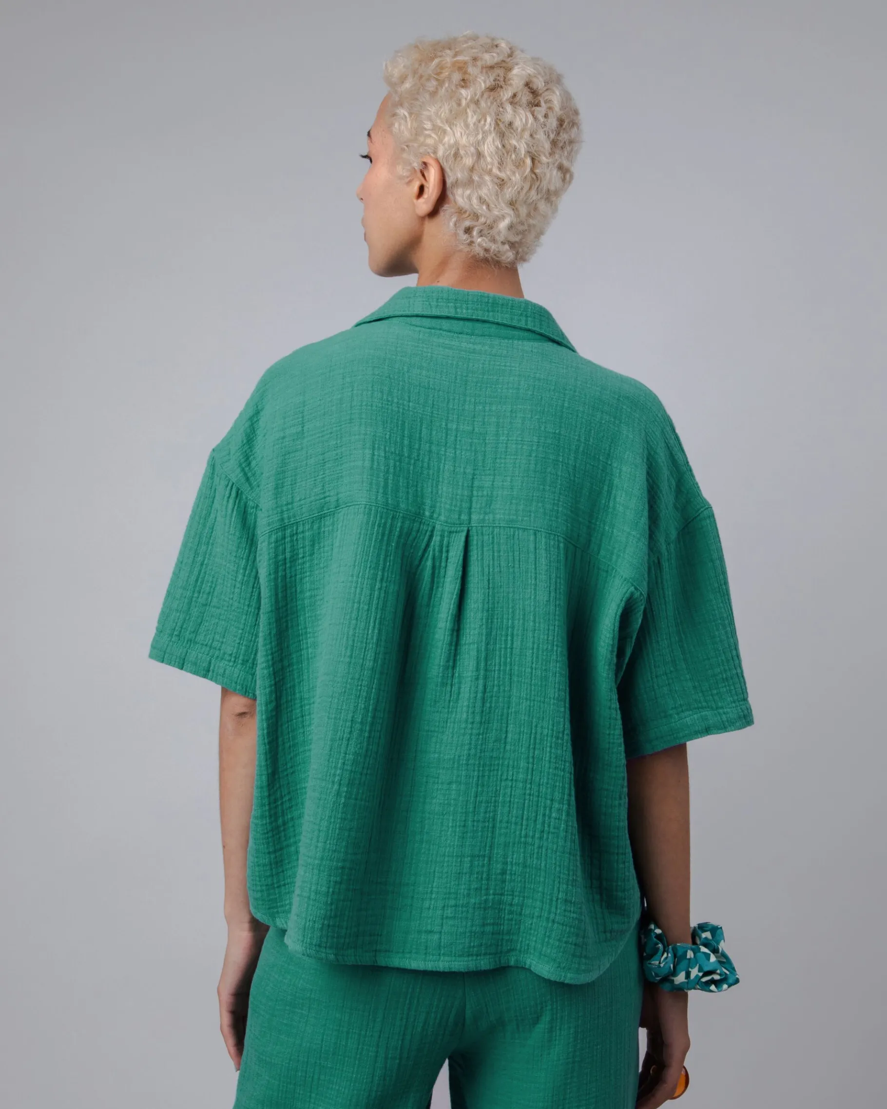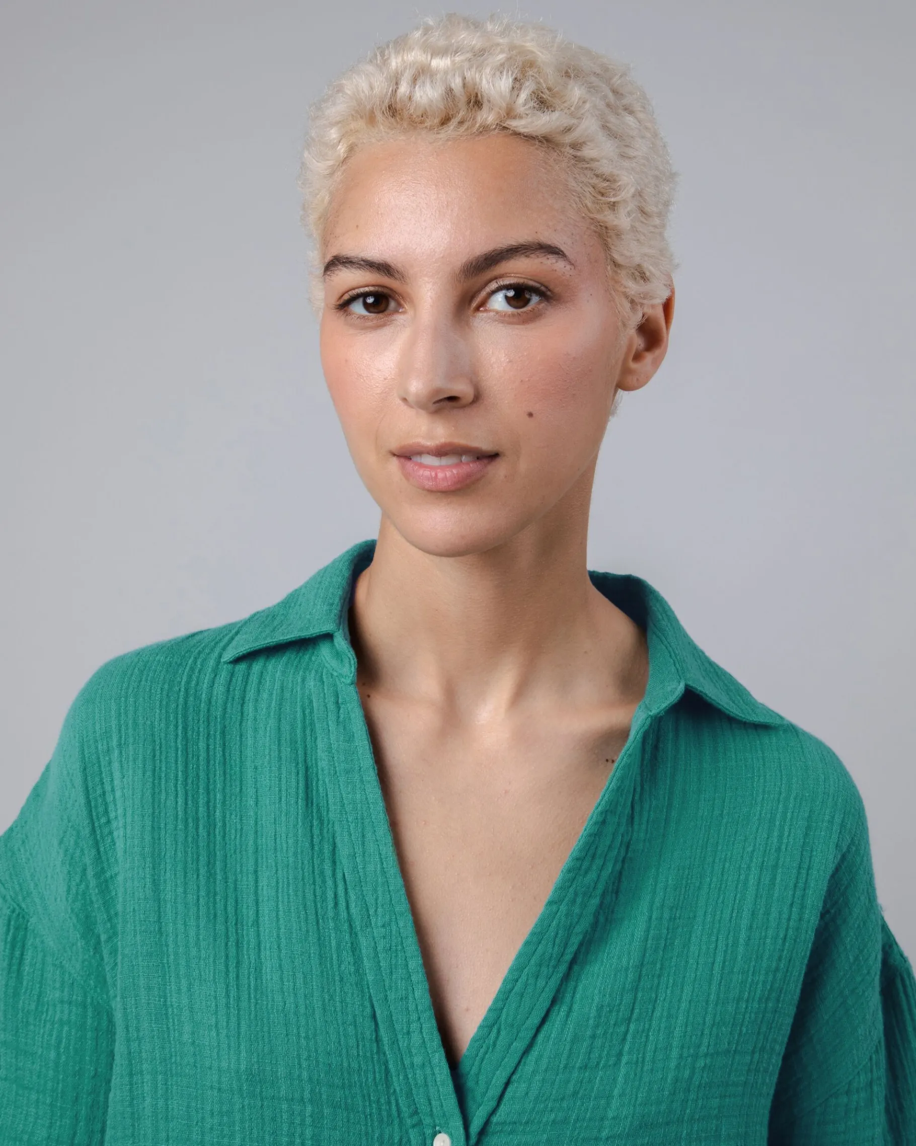 Kurzärmelige Bluse in Übergröße mit V-Ausschnitt, leicht überschnittener Schulter und Knopfverschluss.Ethisch hergestellt aus biologischer Baumwolle.| Waschhinweise