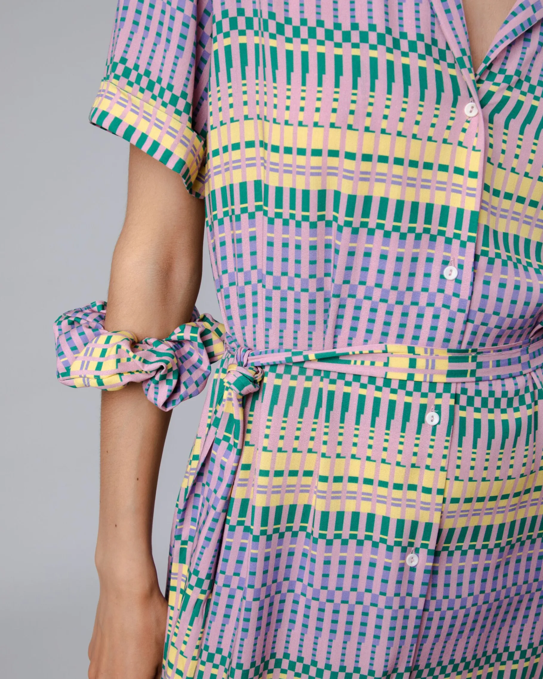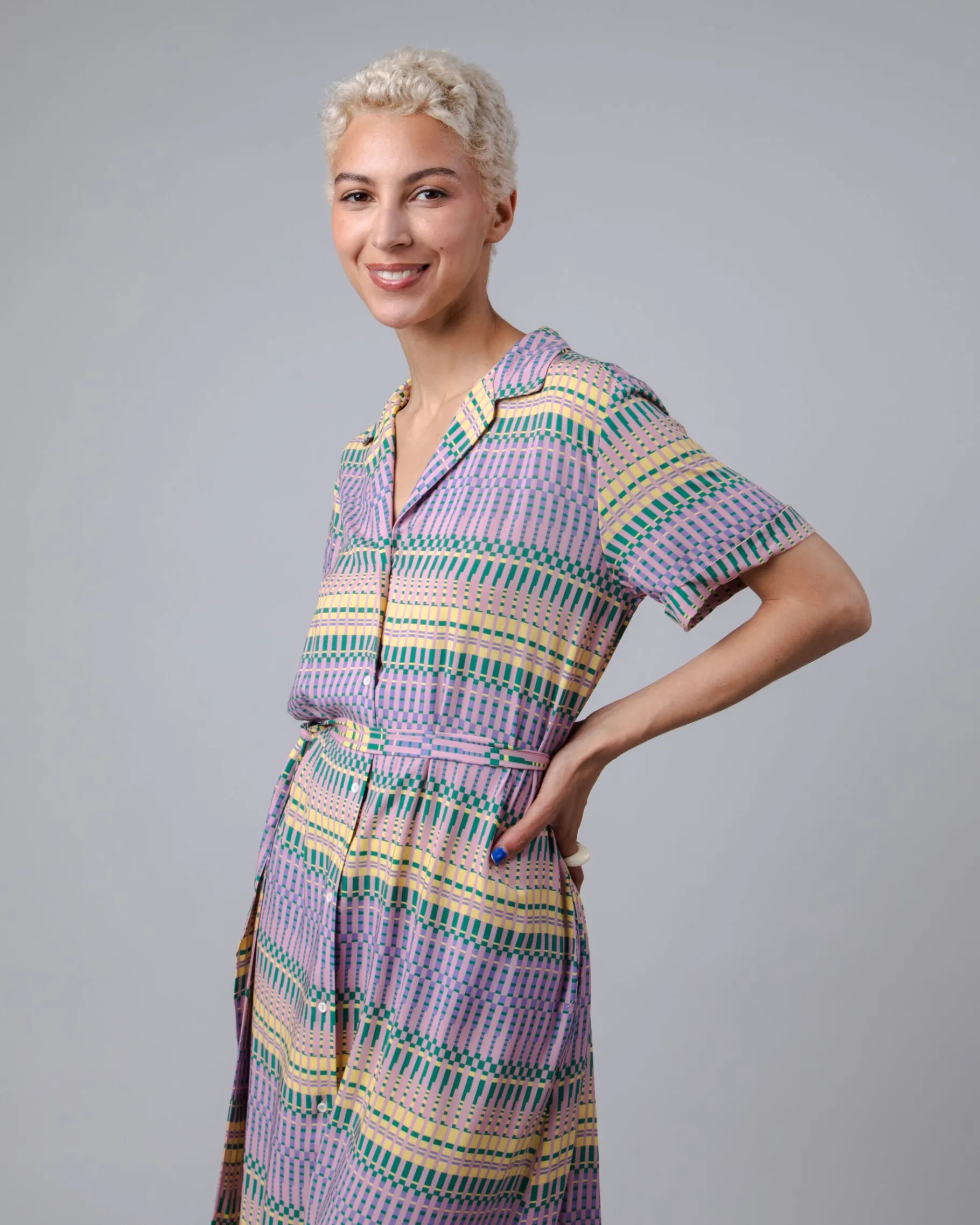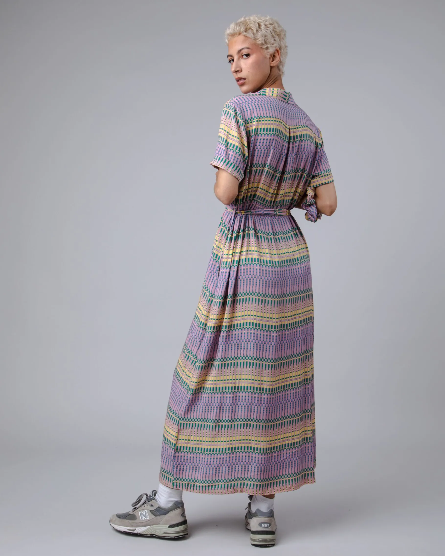 Kurzärmeliges, bedrucktes langes Kleid mit geradem Schnitt, V-Ausschnitt und Rundkragen. Anpassbar dank seiner und einem Knopfverschluss. Das Kleid hat geraffte Details. Ethisch hergestellt aus nachhaltiger Viskose.| Waschhinweise