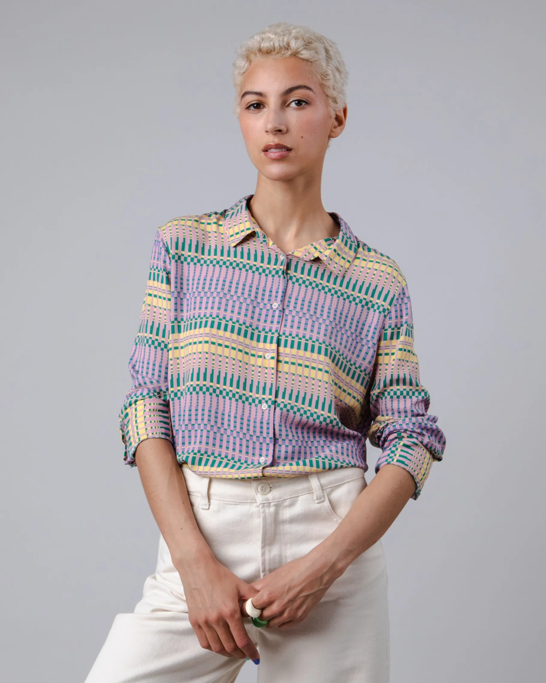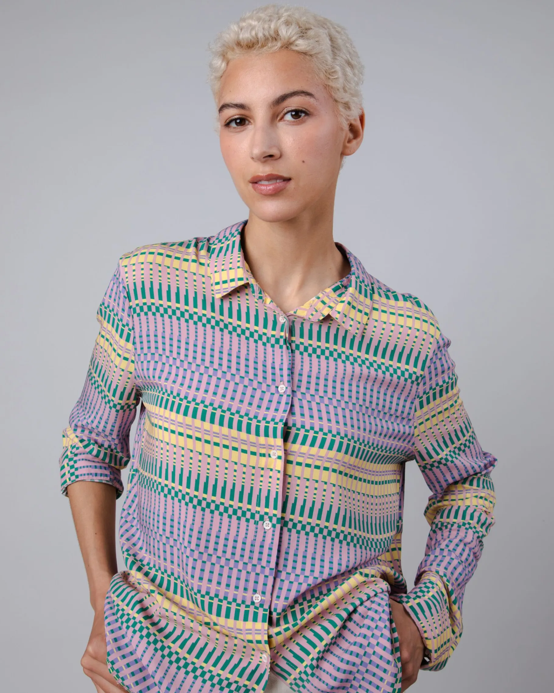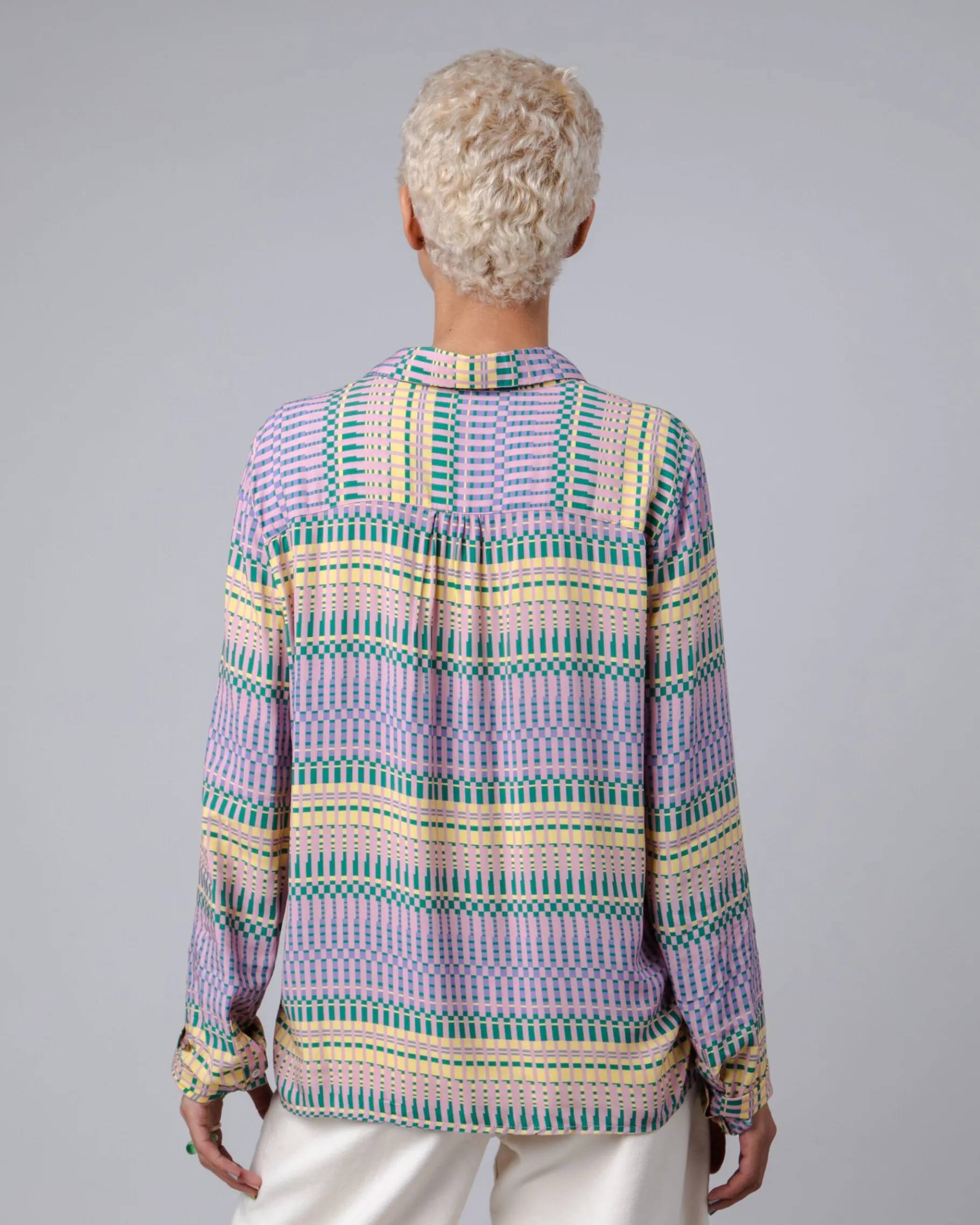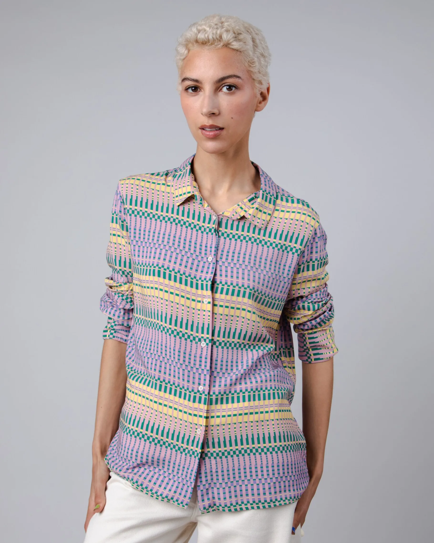 Schmal geschnittene, gestreifte, bedruckte Langarmbluse mit geradem Schnitt und Hemdkragen. Sie hat eine geraffte Passe und Knöpfe. Ethisch hergestellt aus nachhaltiger Viskose.| Waschhinweise