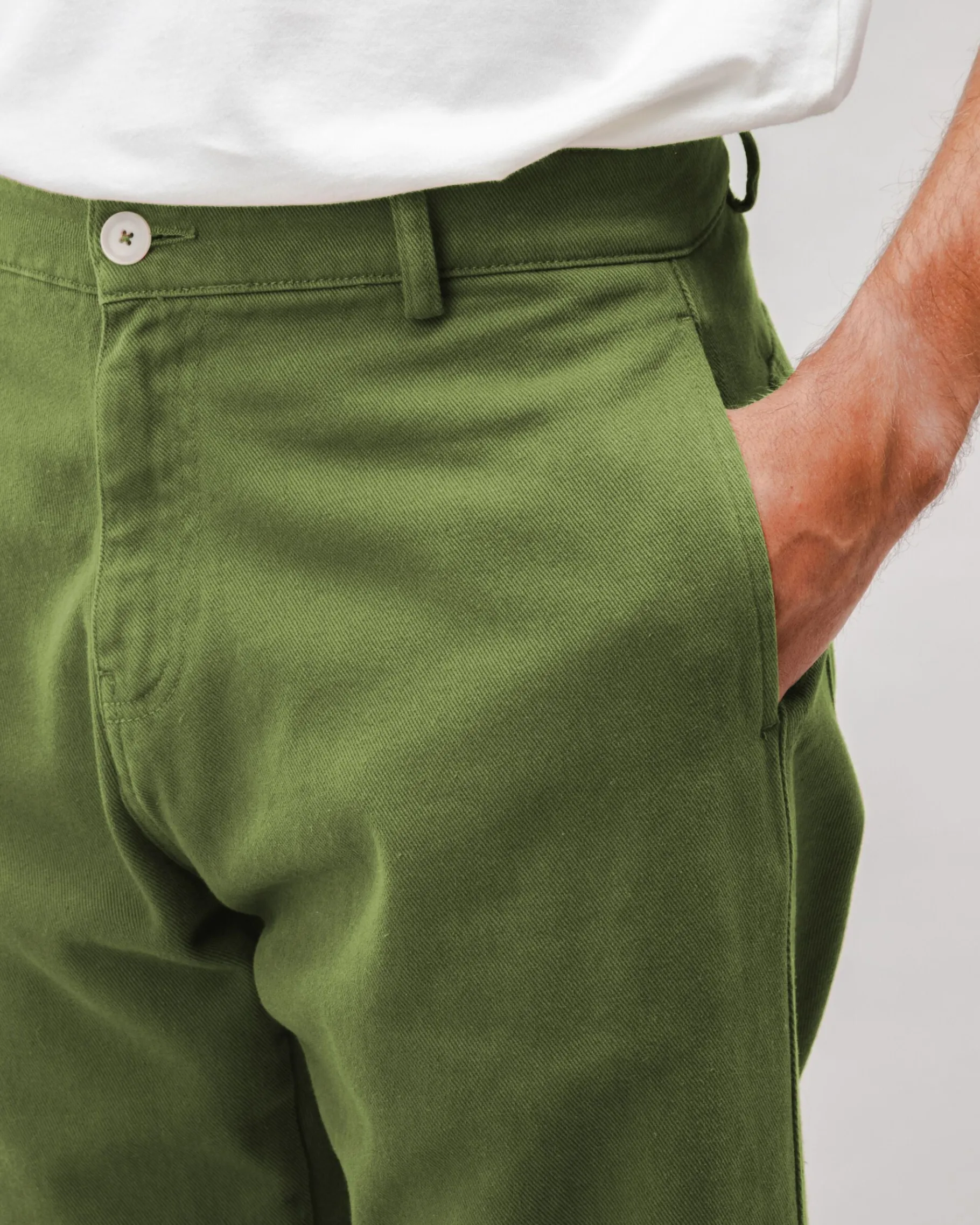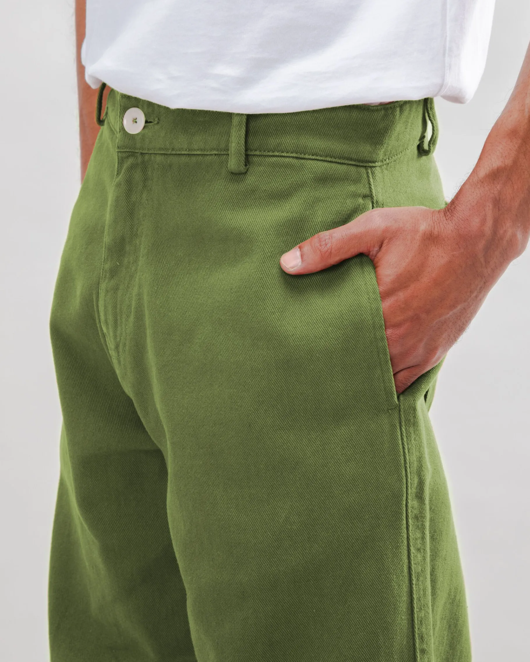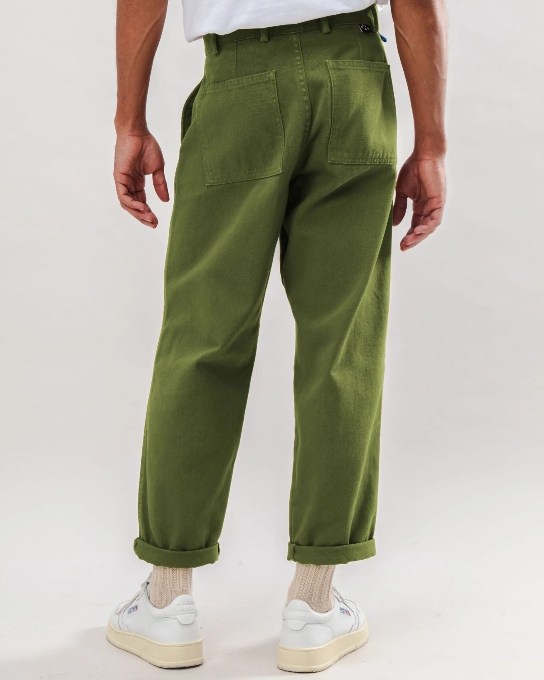 Lange Carpenter-Hose mit geradem Bein, Reißverschluss, Knopfverschluss und Vordertaschen. Sie hat eine aufgesetzte Tasche auf der Rückseite und Rückenfalten. Ethisch hergestellt aus biologischer Baumwolle.| Waschhinweise