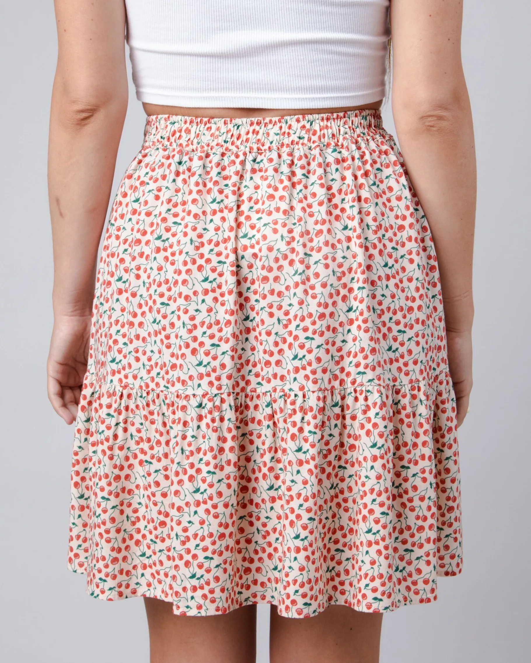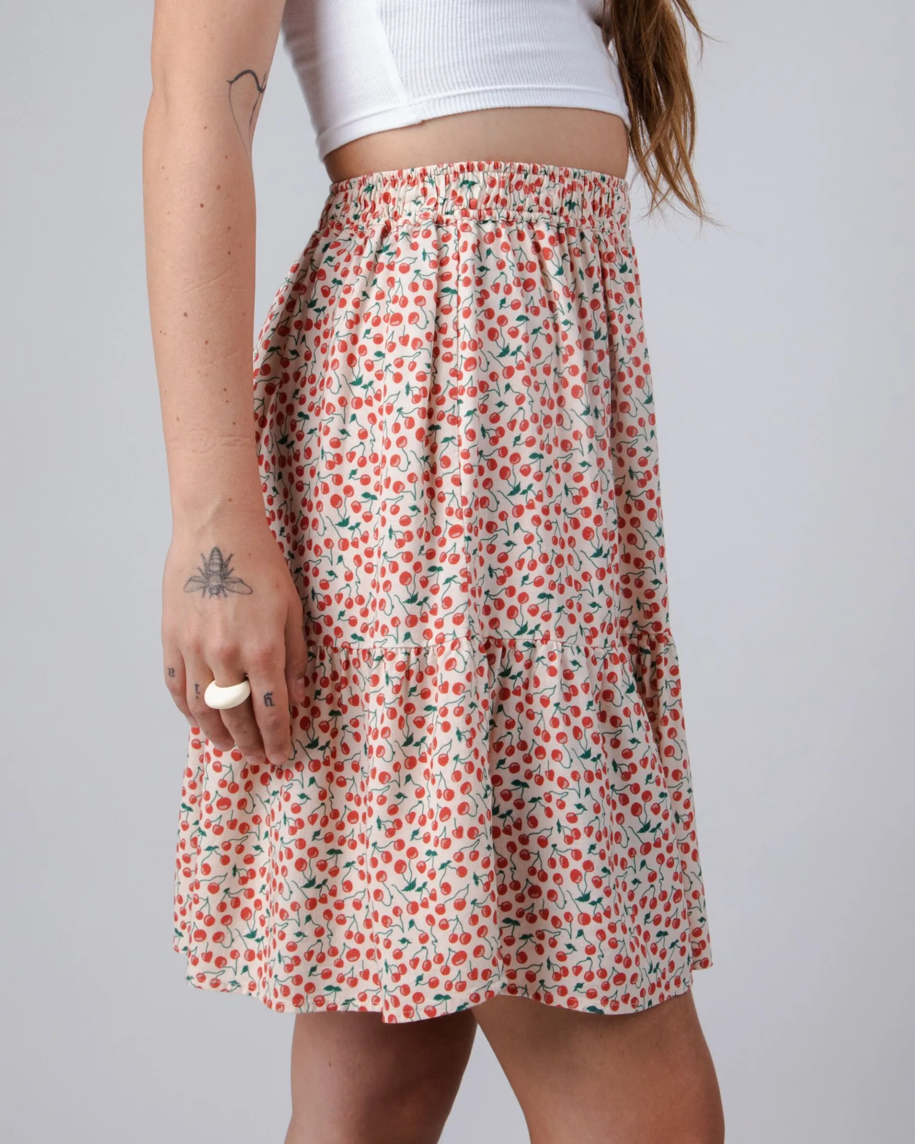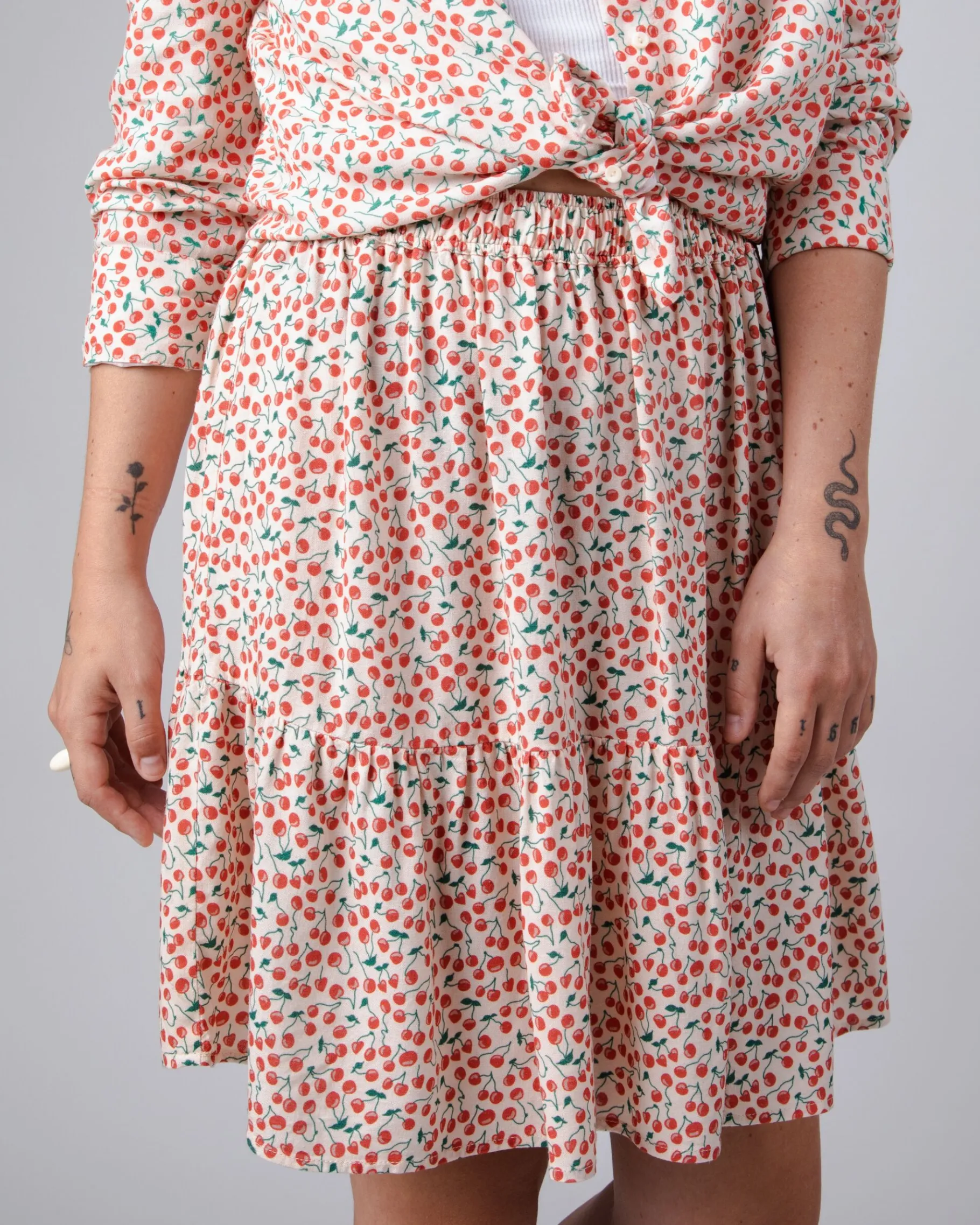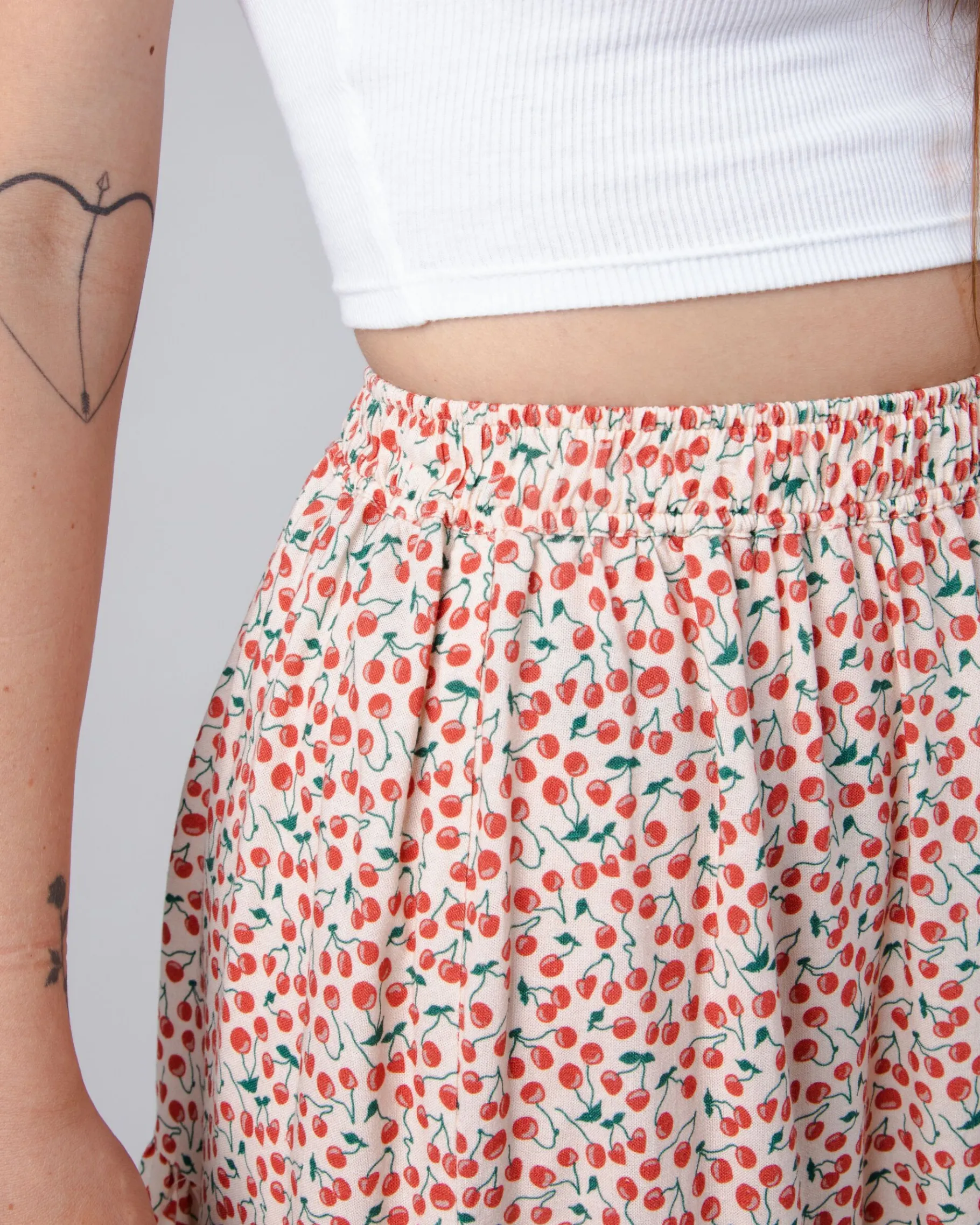 Kurzer Rock in A-Linie mit „Kirschen“-Aufdruck, elastischem Bund und Rüschendetail.Ethisch hergestellt aus nachhaltiger Viskose und Leinen.| Waschhinweise