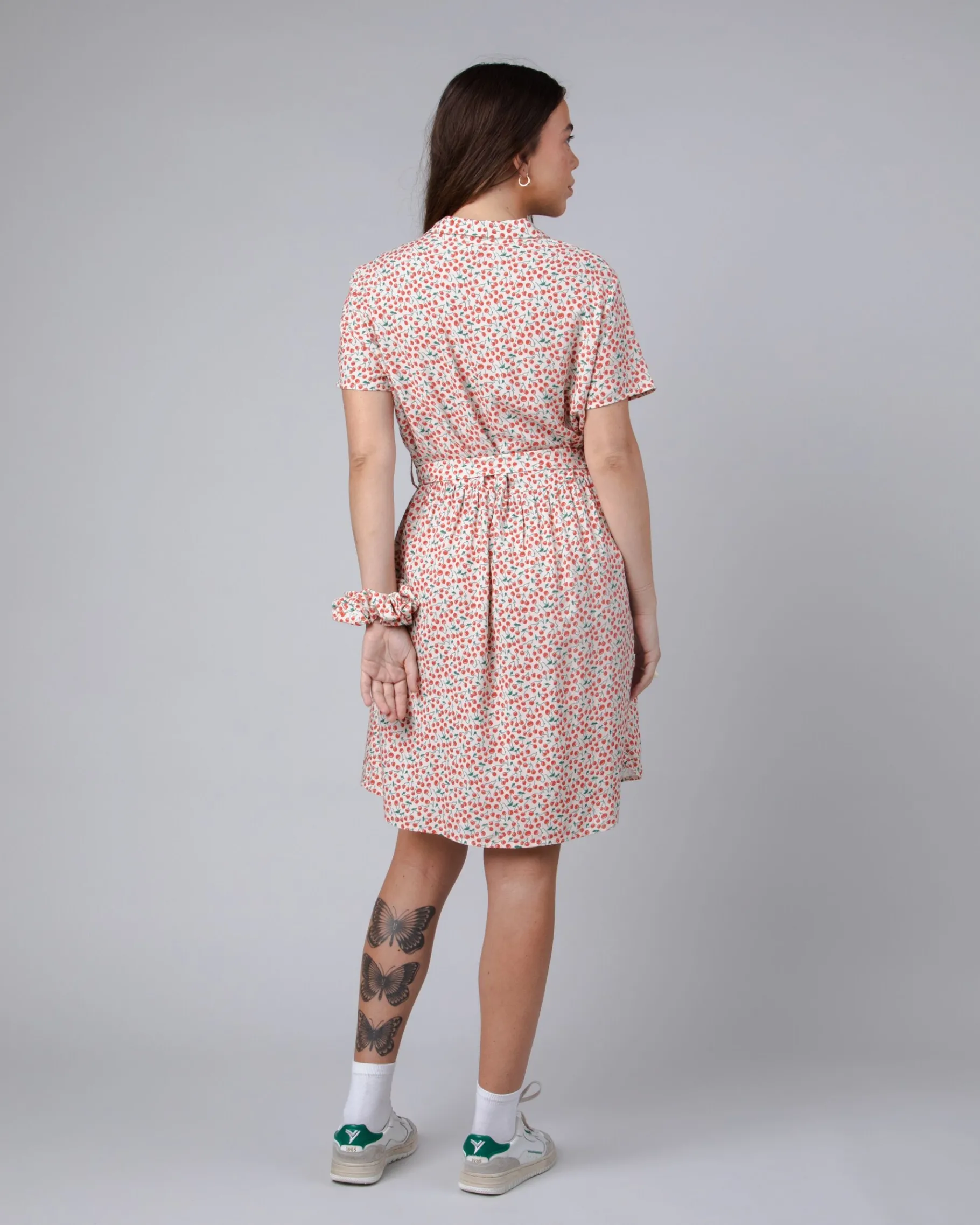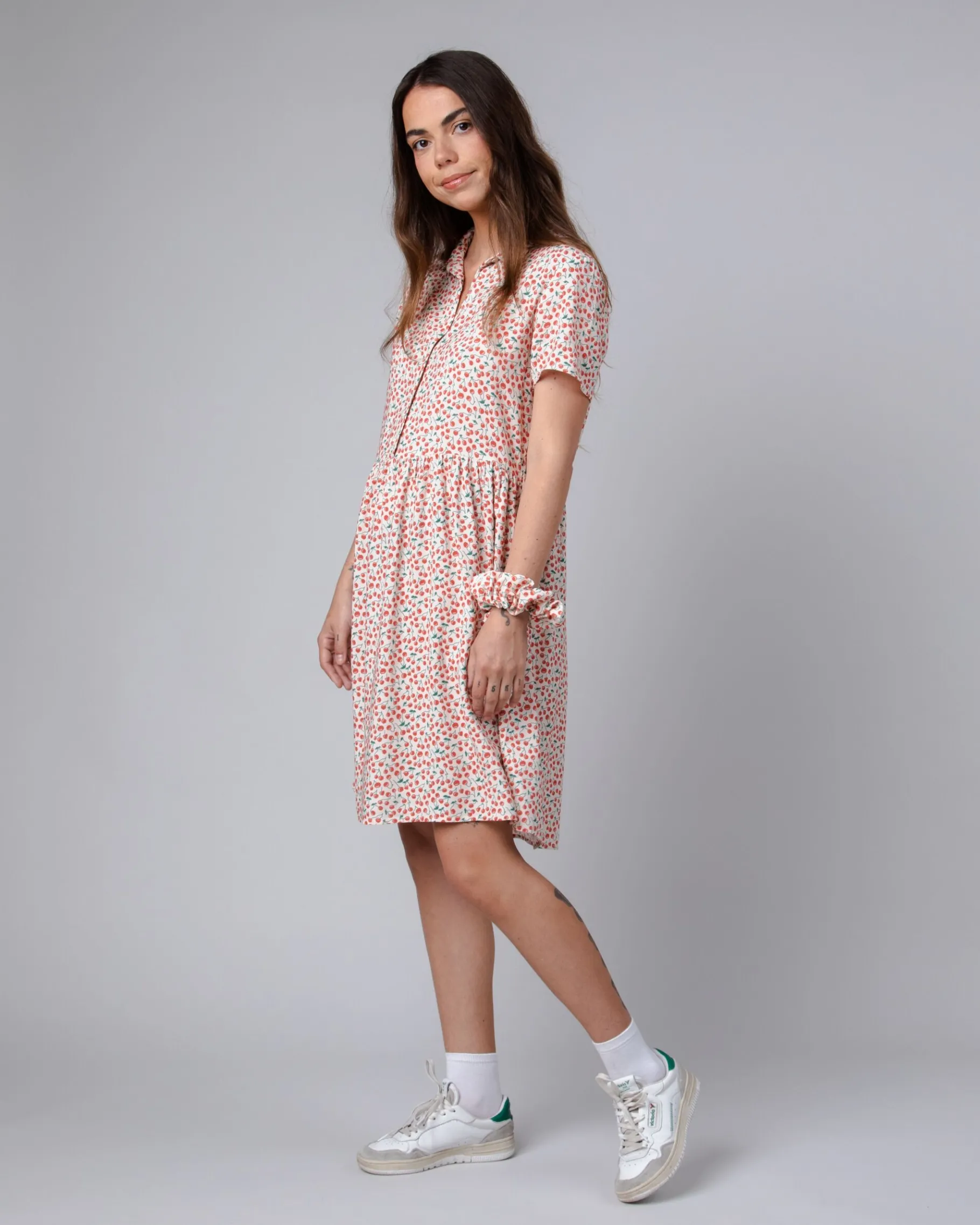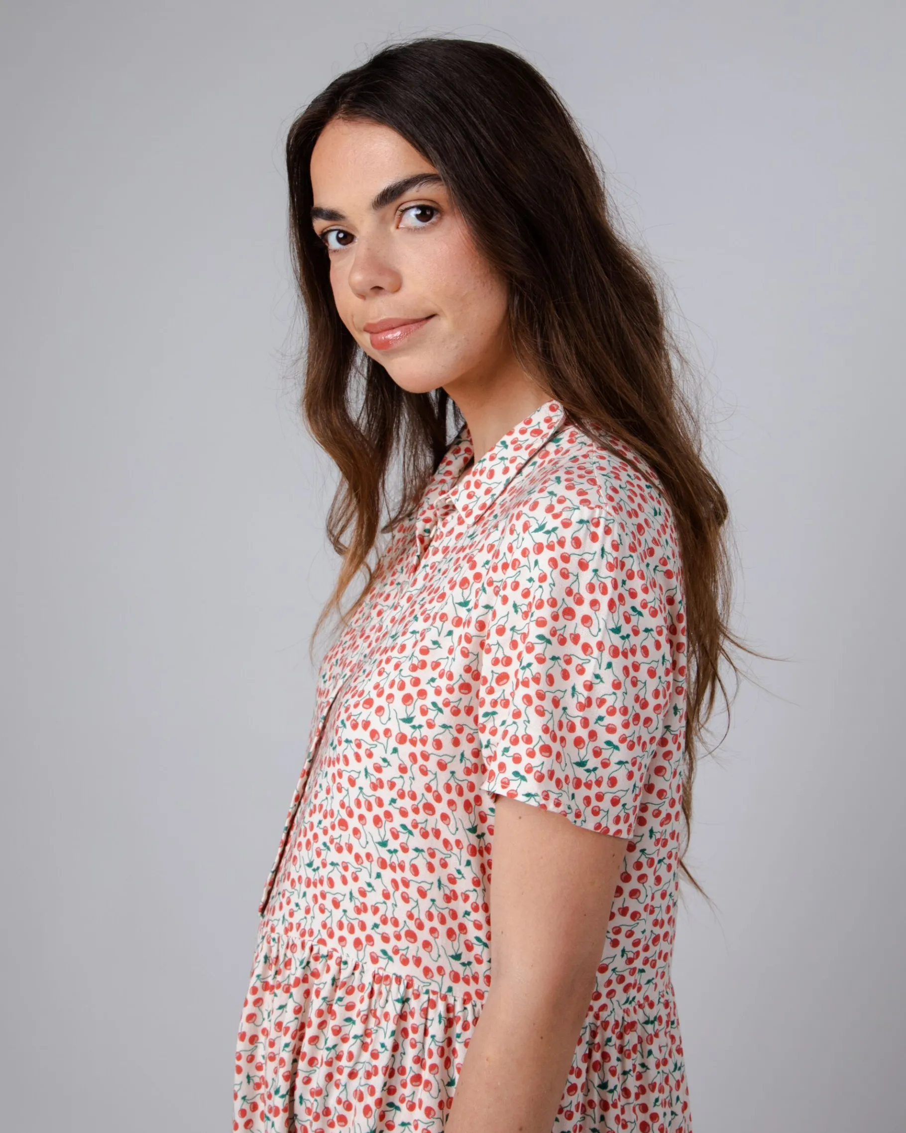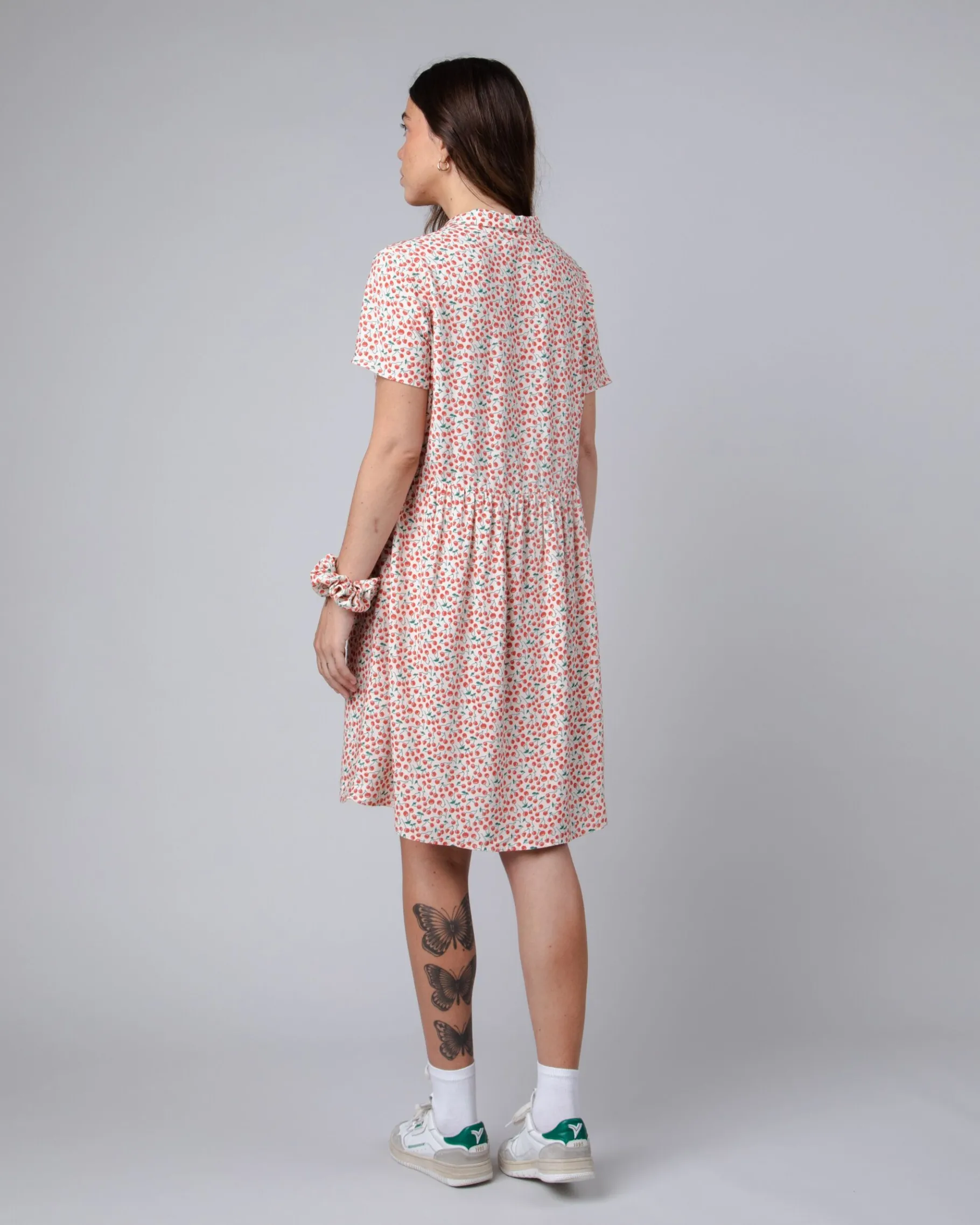 Locker sitzendes, kurzärmeliges Kleid mit „Kirschen“-Aufdruck. Es ist in A-Linie geschnitten, hat einen normalen Kragen und einen Knopfverschluss. Das Kleid hat geraffte Details. Ethisch hergestellt aus nachhaltiger Viskose und Leinen.| Waschhinweise