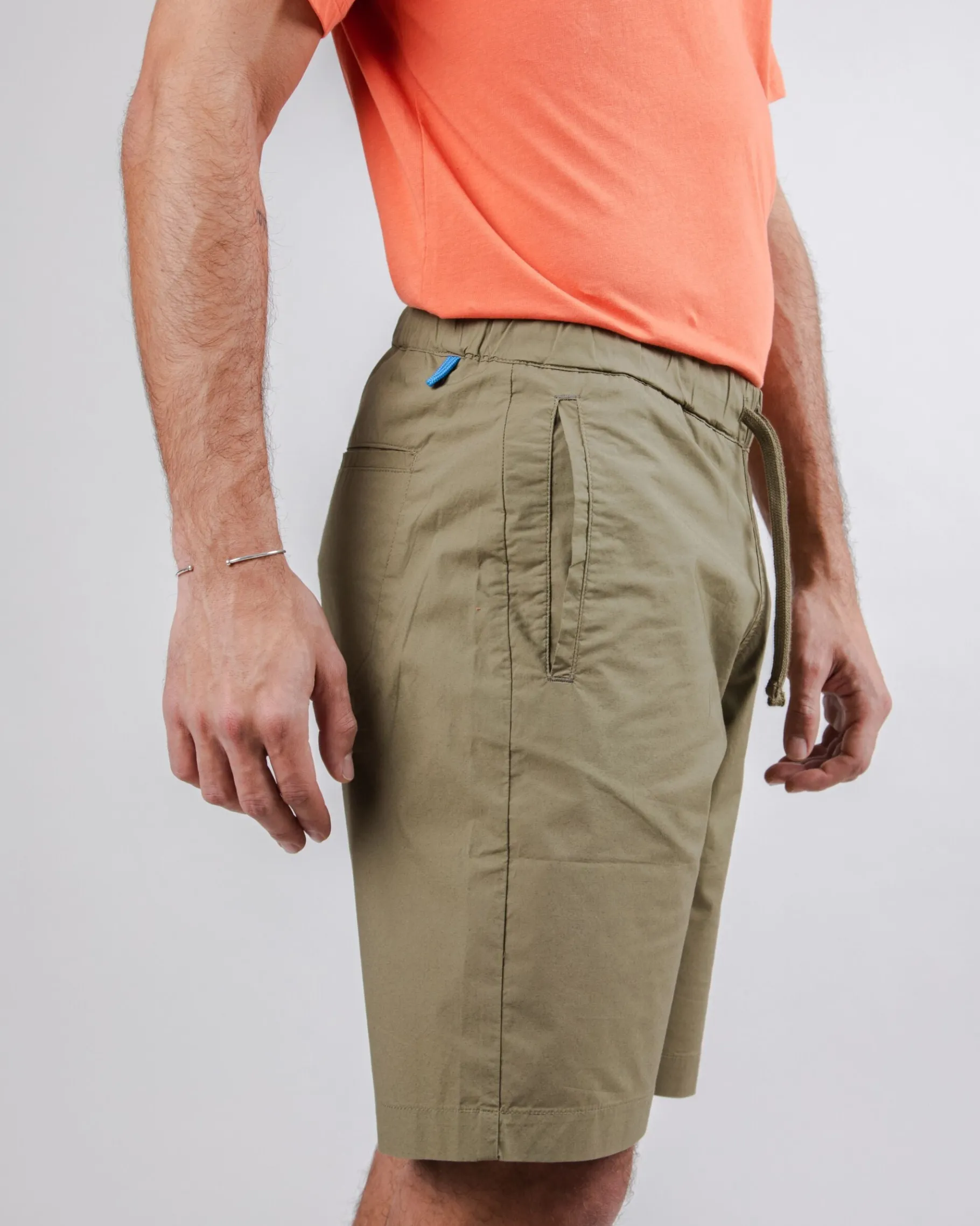 Bequeme, lockere kurze Hose in der Farbe Khaki. Besonders geeignet für warme Sommertage. Hergestellt aus reiner Bio-Baumwolle und unter fairen Bedingunen in Portugal.| Waschhinweise