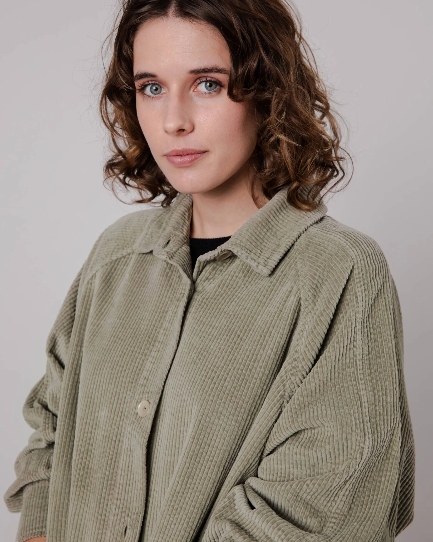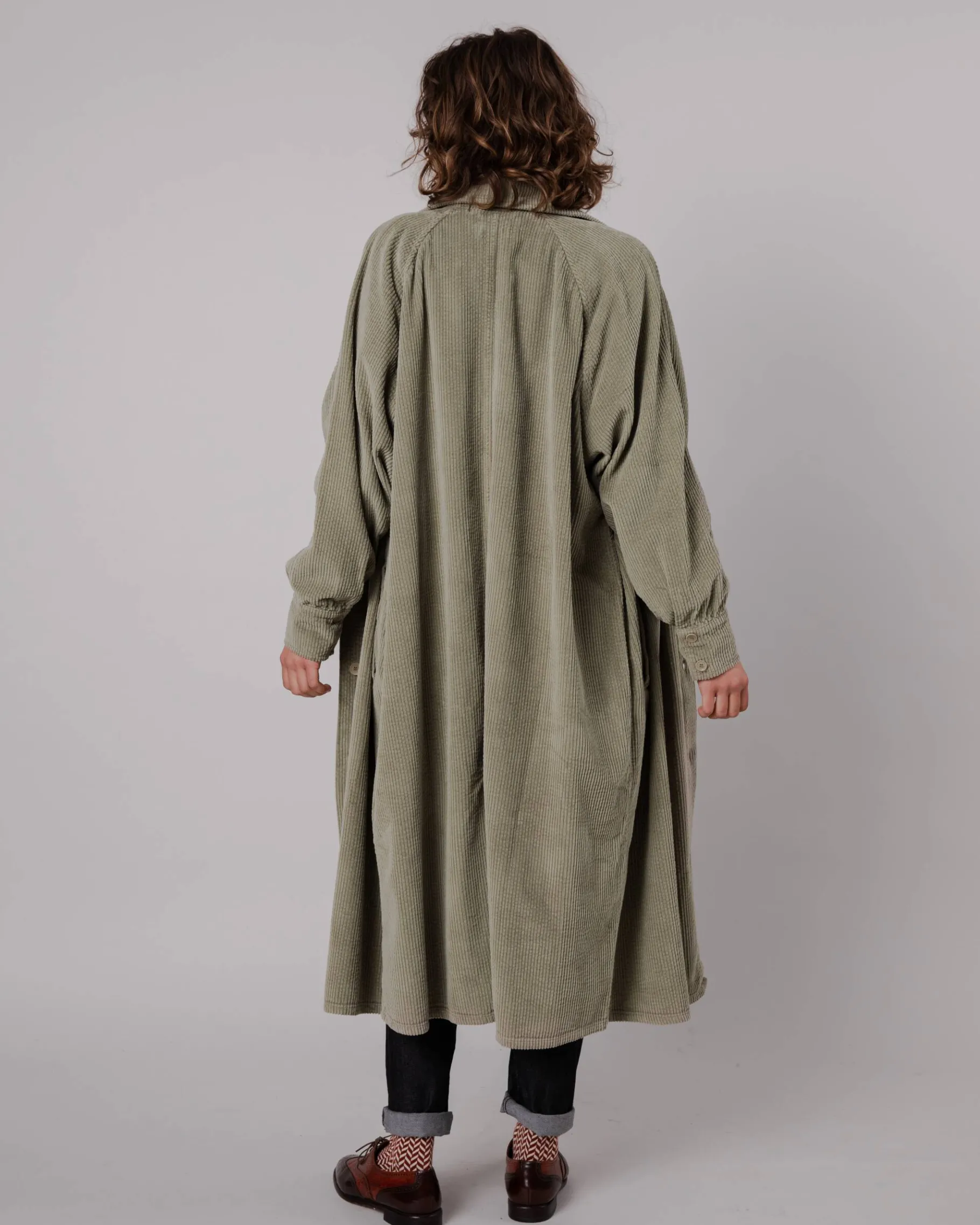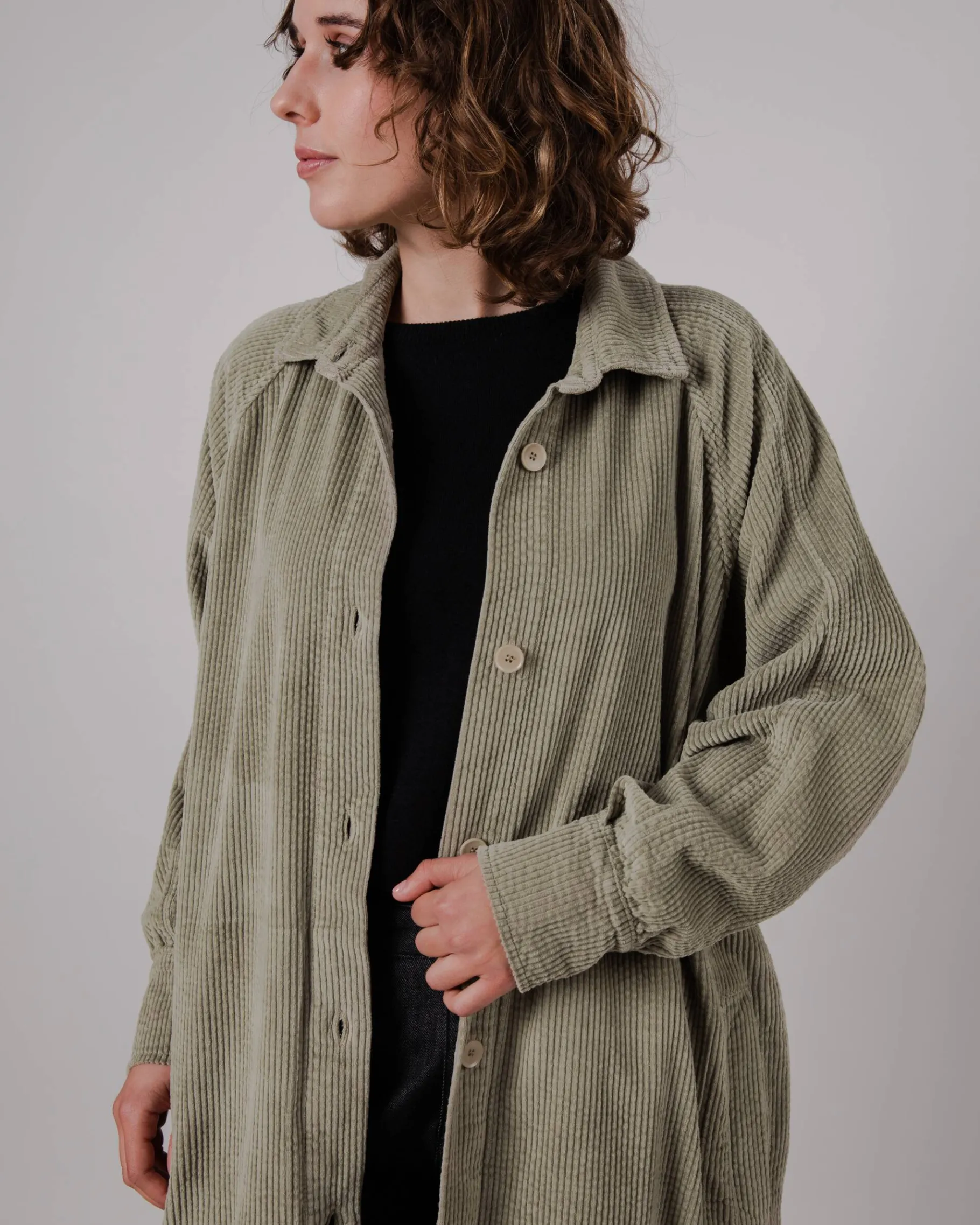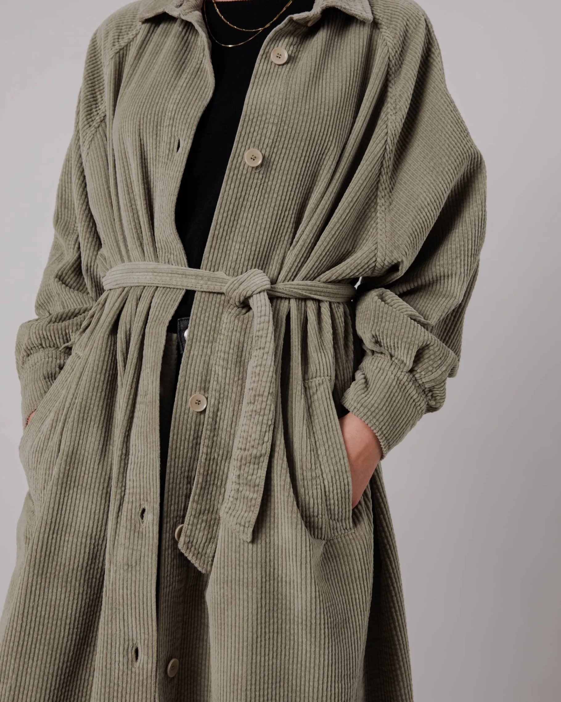 Langer Übergangsmantel aus Cord mit Hemdkragen und Knopfleiste. Tragbar mit und ohne Gürtel. Ethisch hergestellt aus Bio-Baumwolle.| Waschhinweise