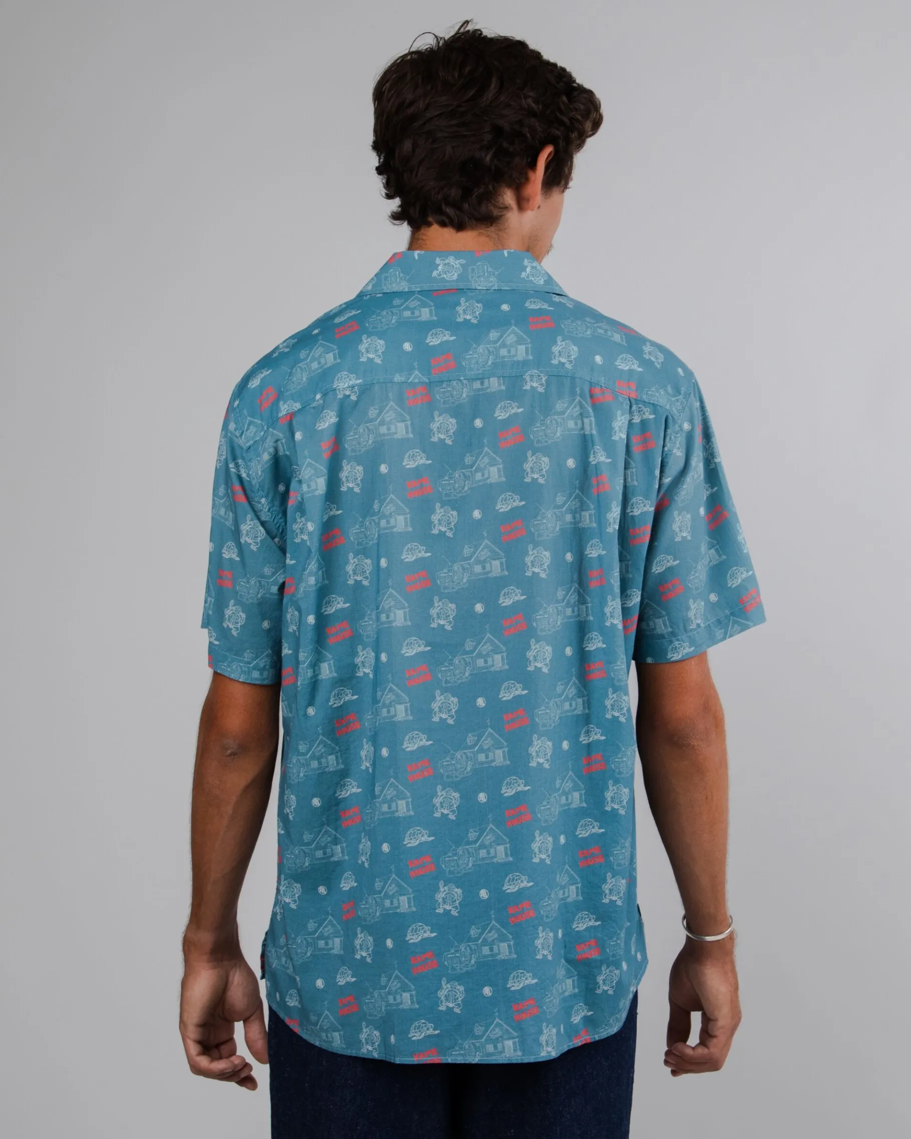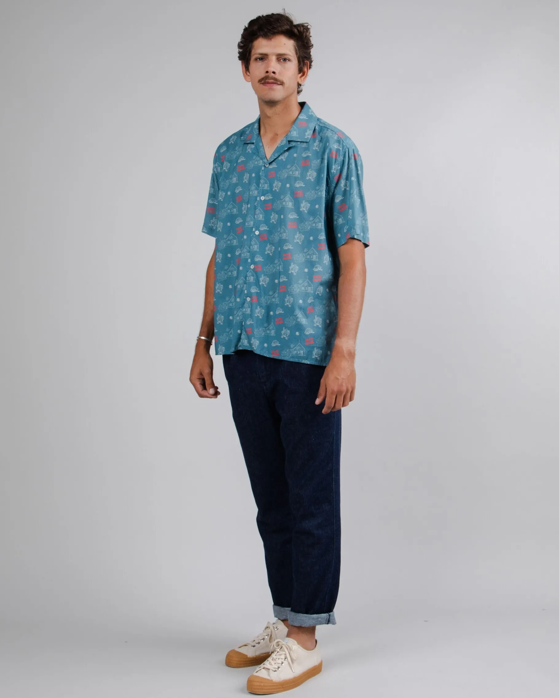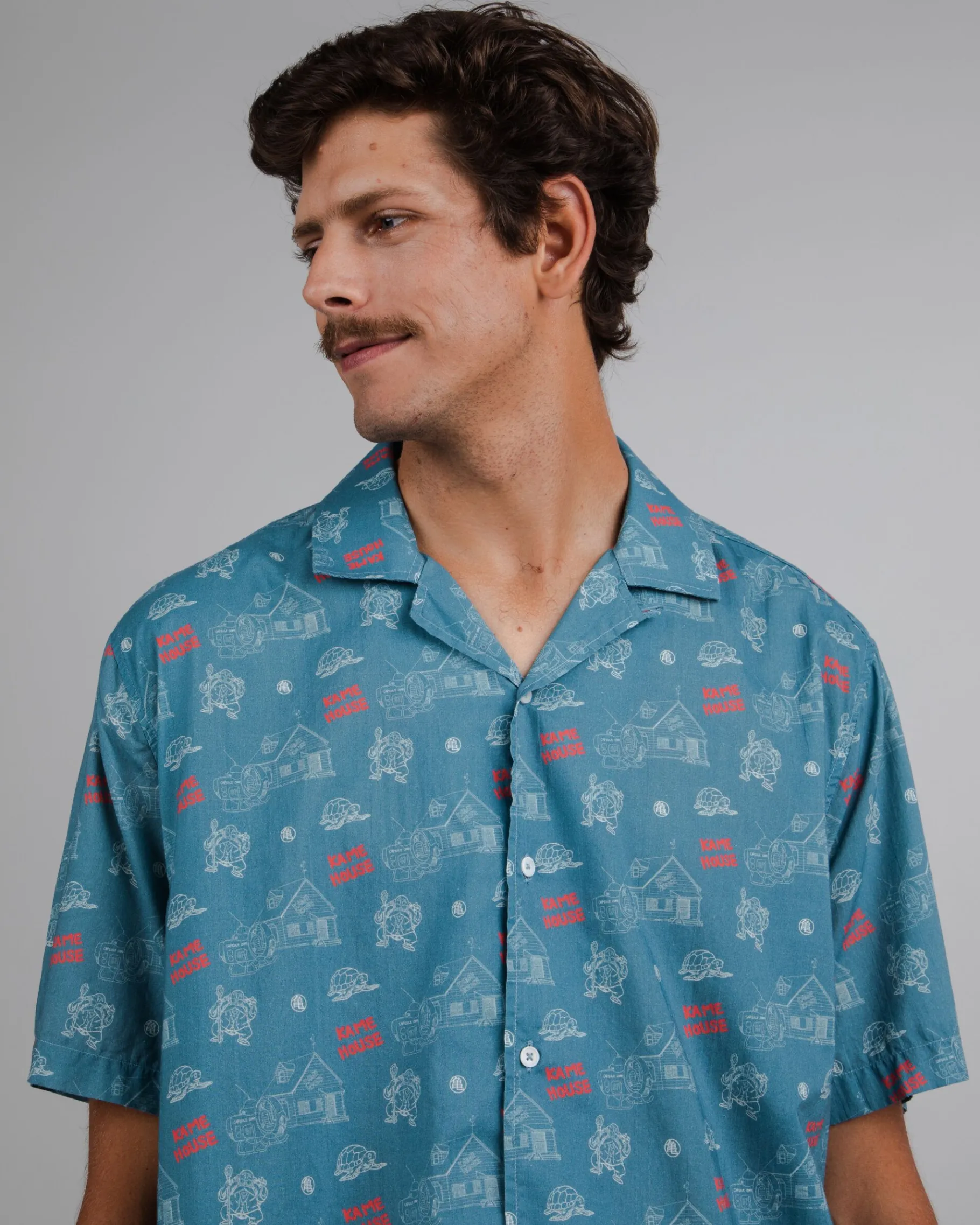 Dragon Ball Z Kurzarm-Aloha-Shirt mit Kame House-Aufdruck in entspannter Passform. Es hat eine leicht überschnittene Schulter, einen geraden Saum, einen Reverskragen und einen Knopfverschluss. Ethisch hergestellt aus biologischer Baumwolle.| Waschhinweise