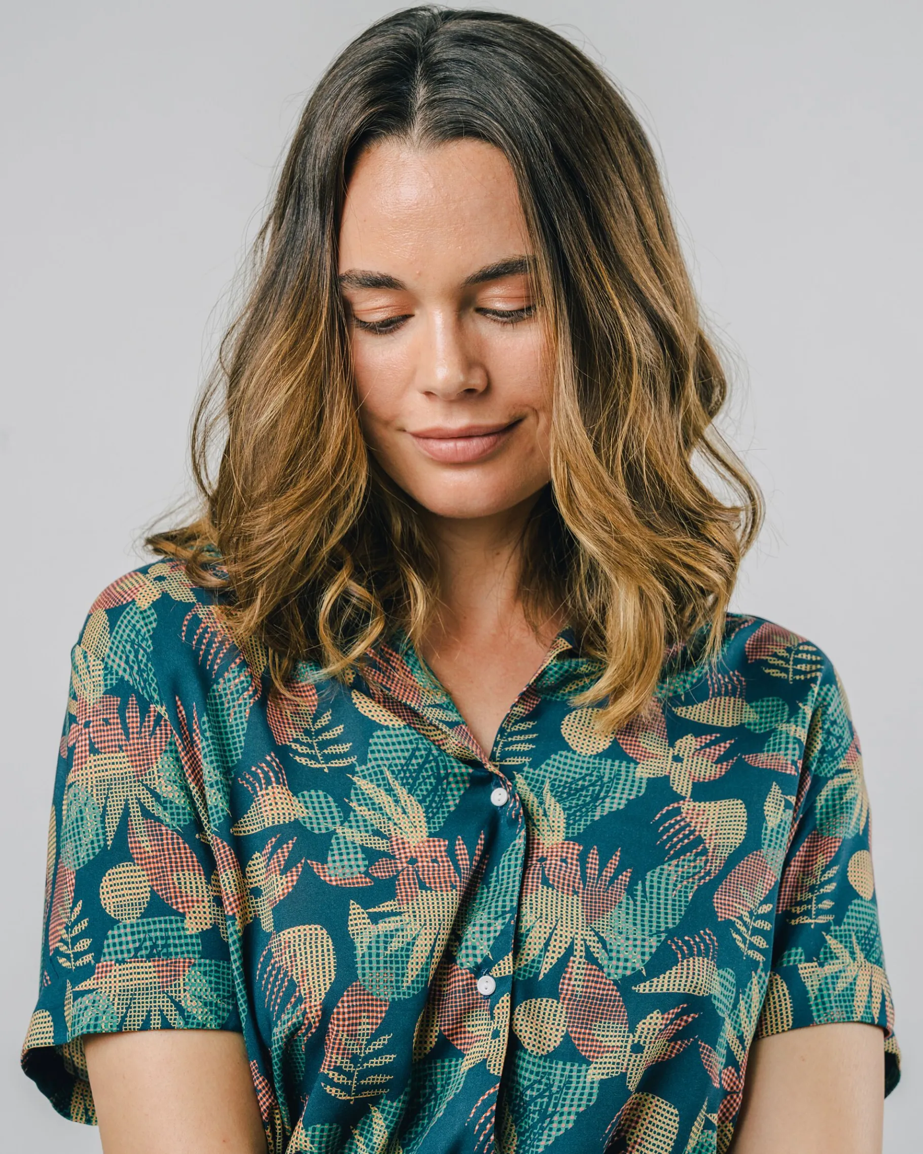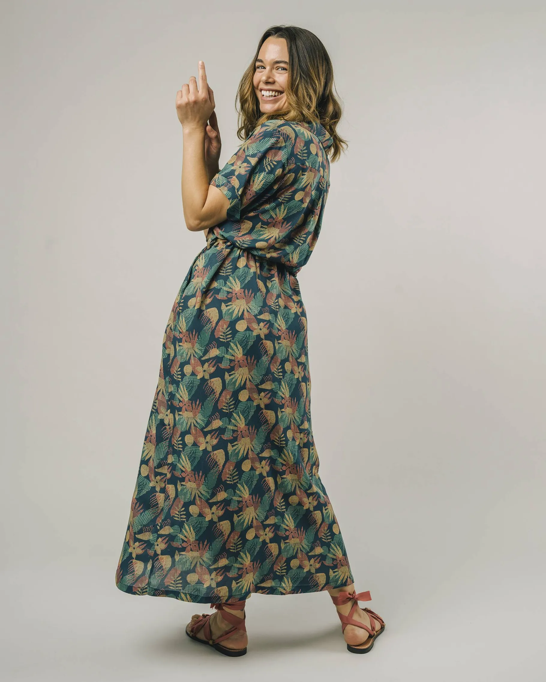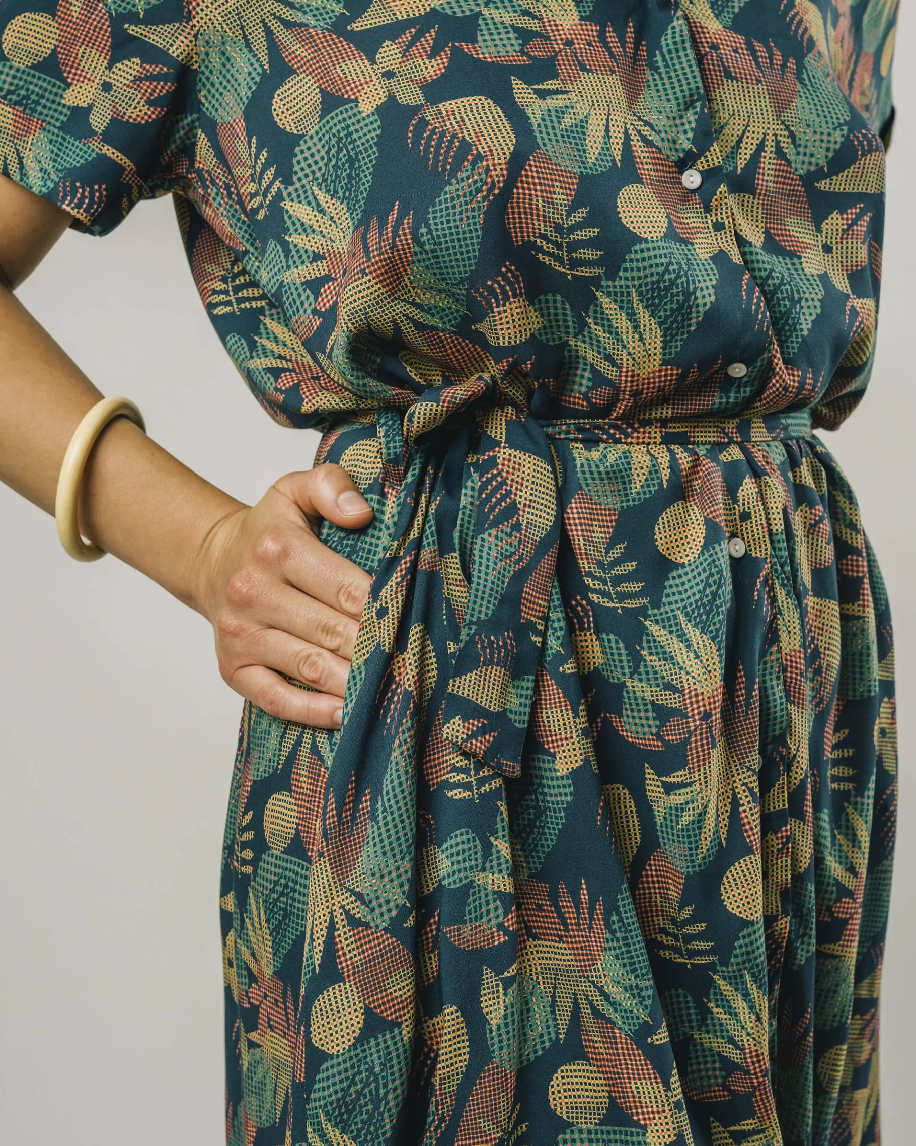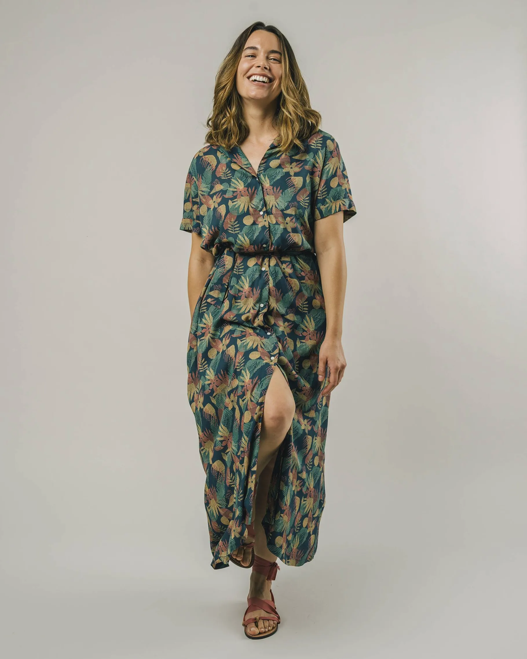 Gerade geschnittenes langes Kleid mit kurzen Ärmeln und Blumendruck, mit V-Ausschnitt und Reverskragen. Es kann durch eine Schnürung angepasst werden und wird mit Knöpfen geschlossen.Ethisch hergestellt aus nachhaltiger Viskose.| Waschhinweise