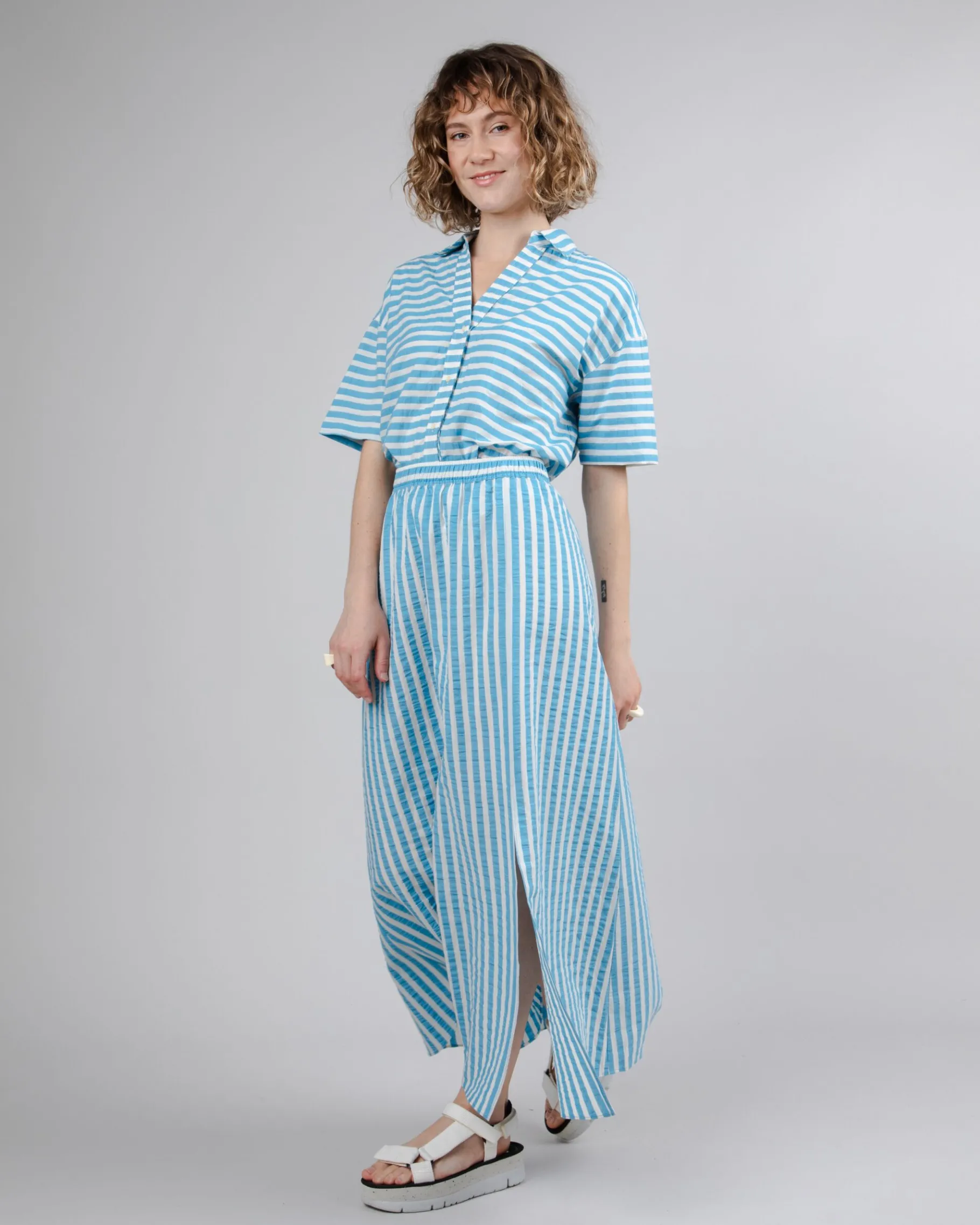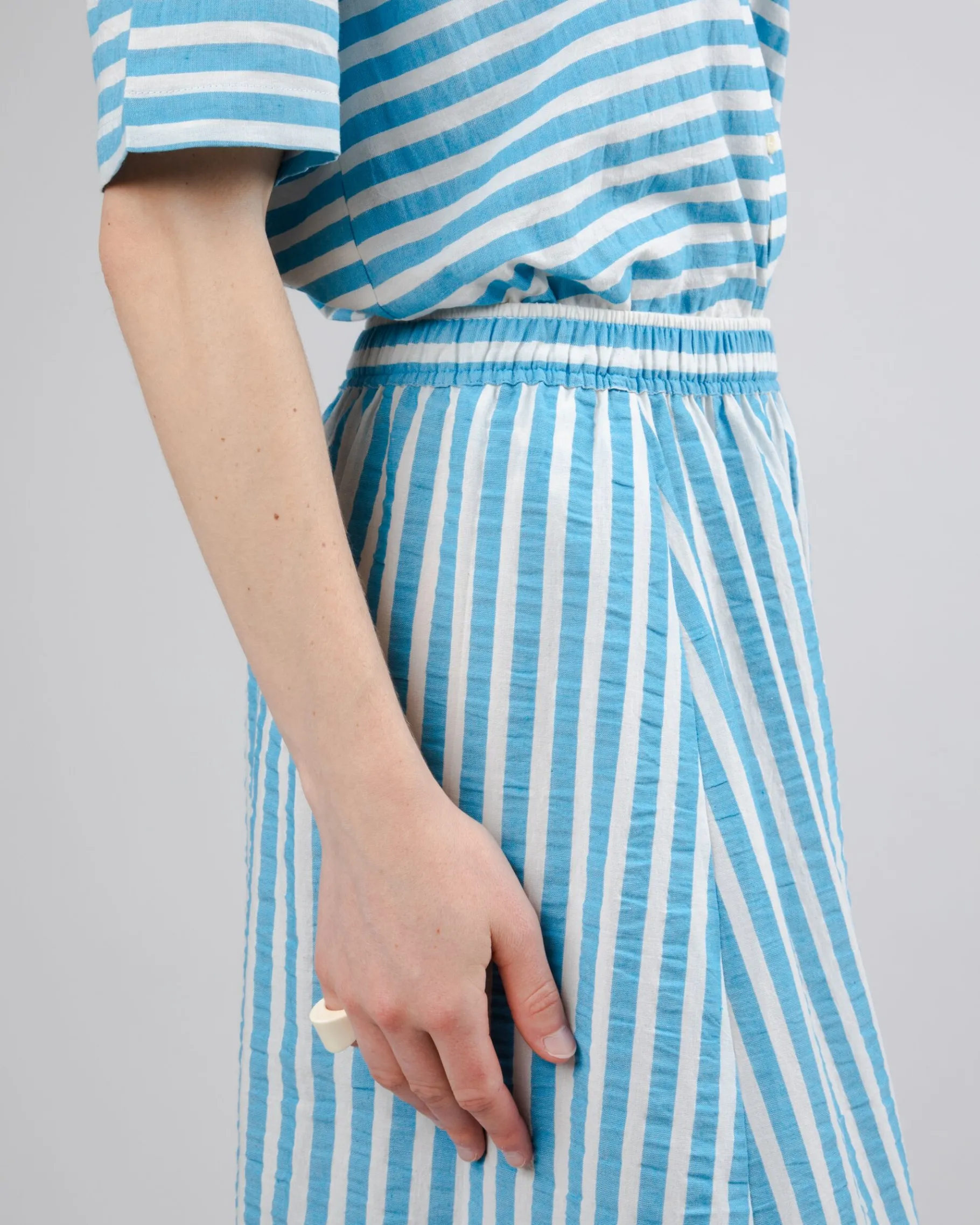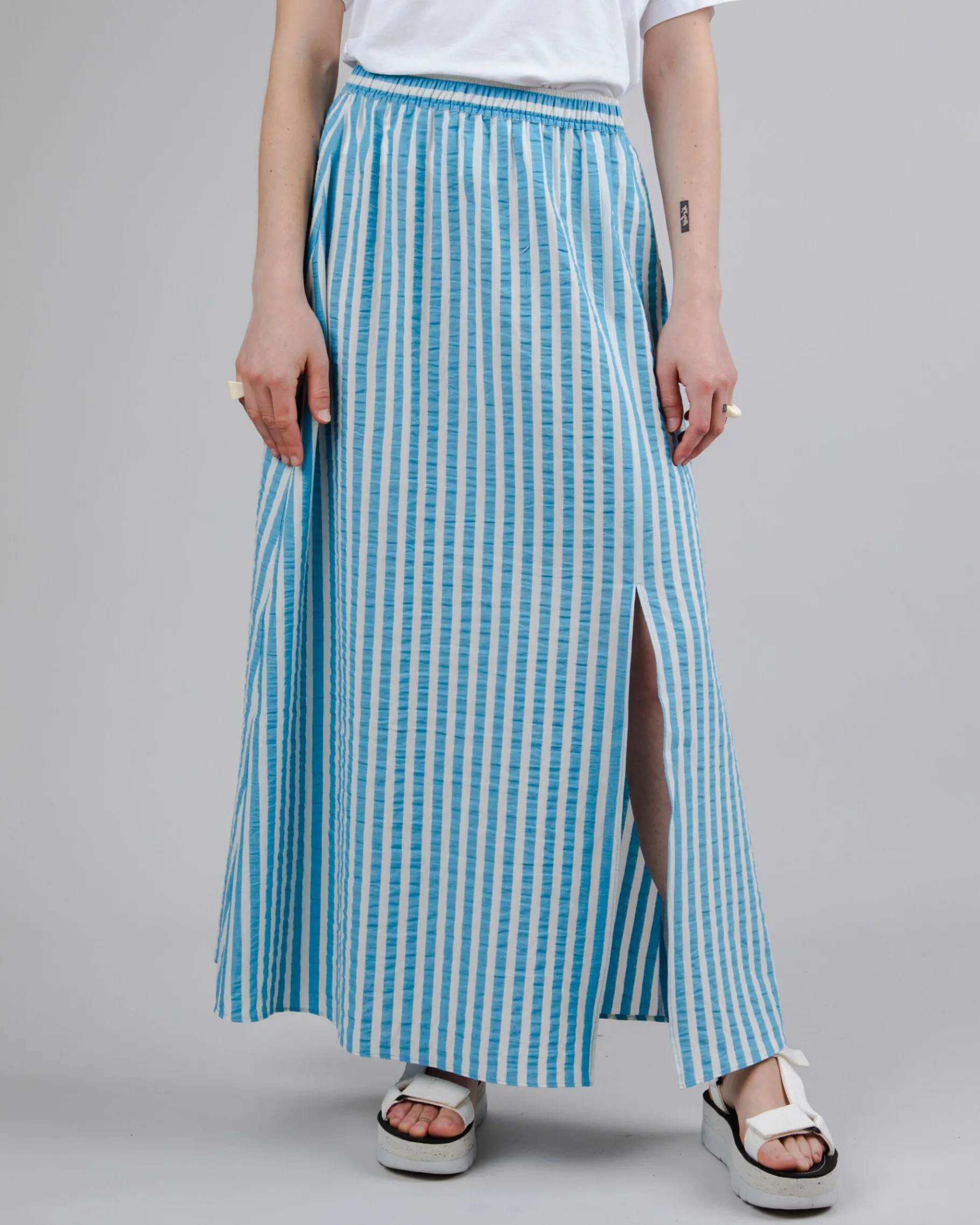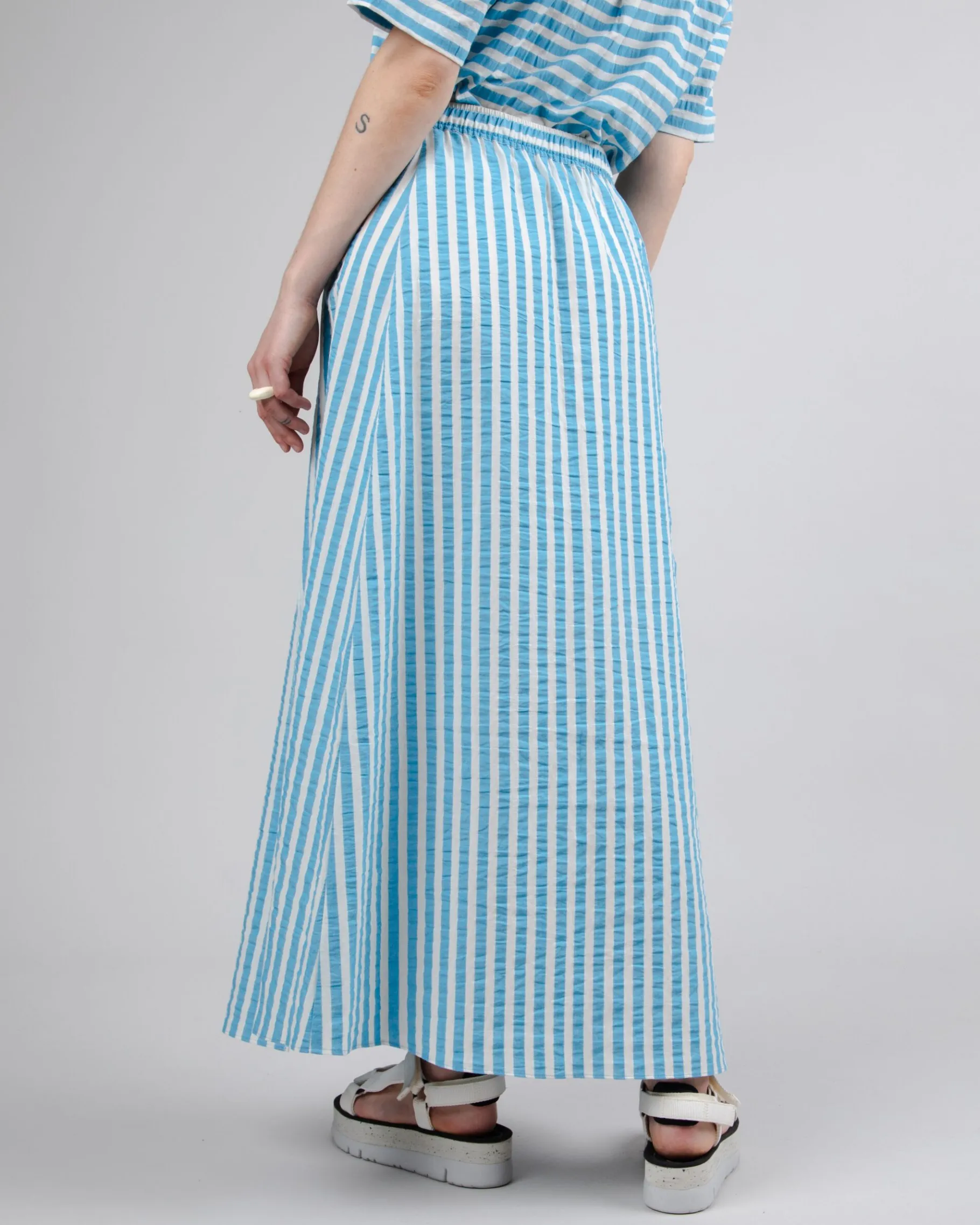 Gestreifter, langer Rock in A-Linie mit elastischem Bund und Ausschnitt. Ethisch hergestellt aus Bio-Baumwolle, recycelter Baumwolle und recyceltem Polyester.| Waschhinweise