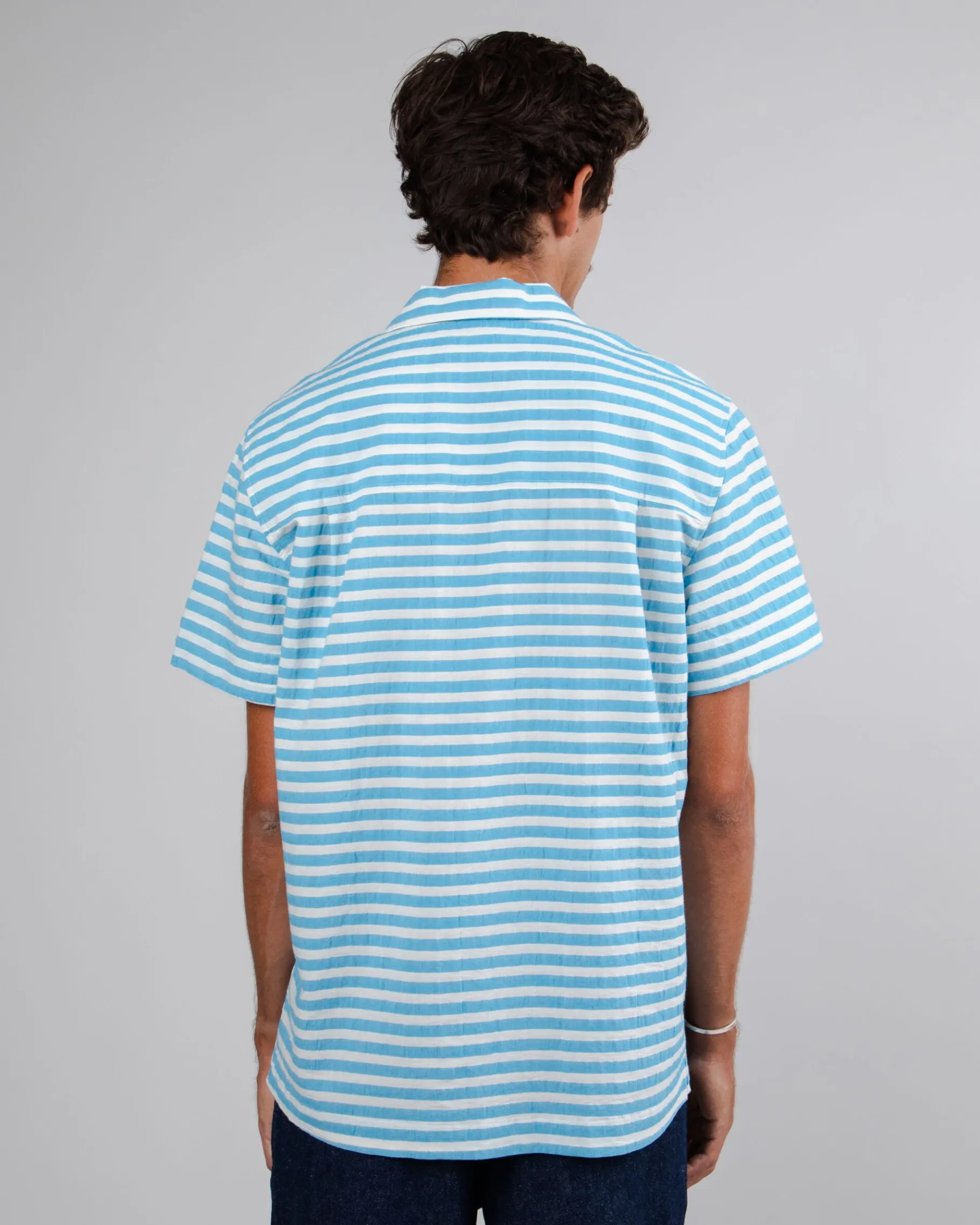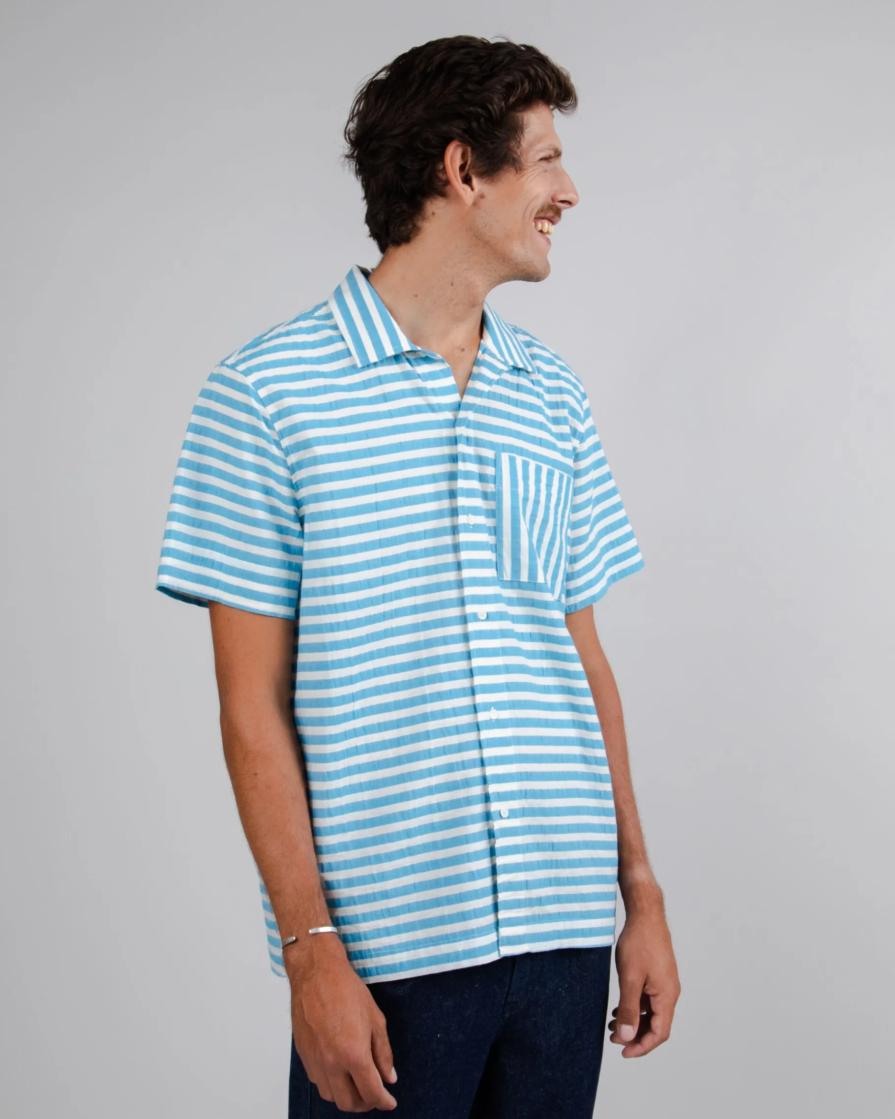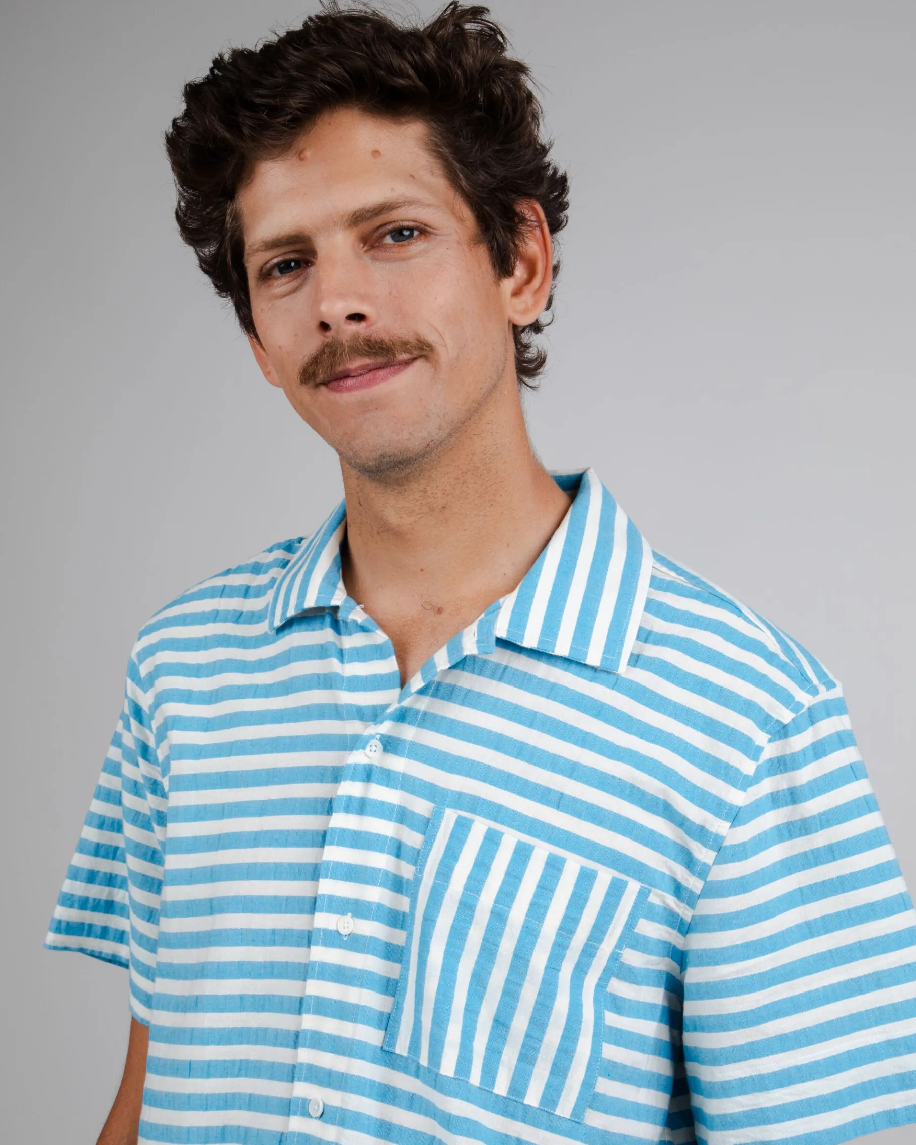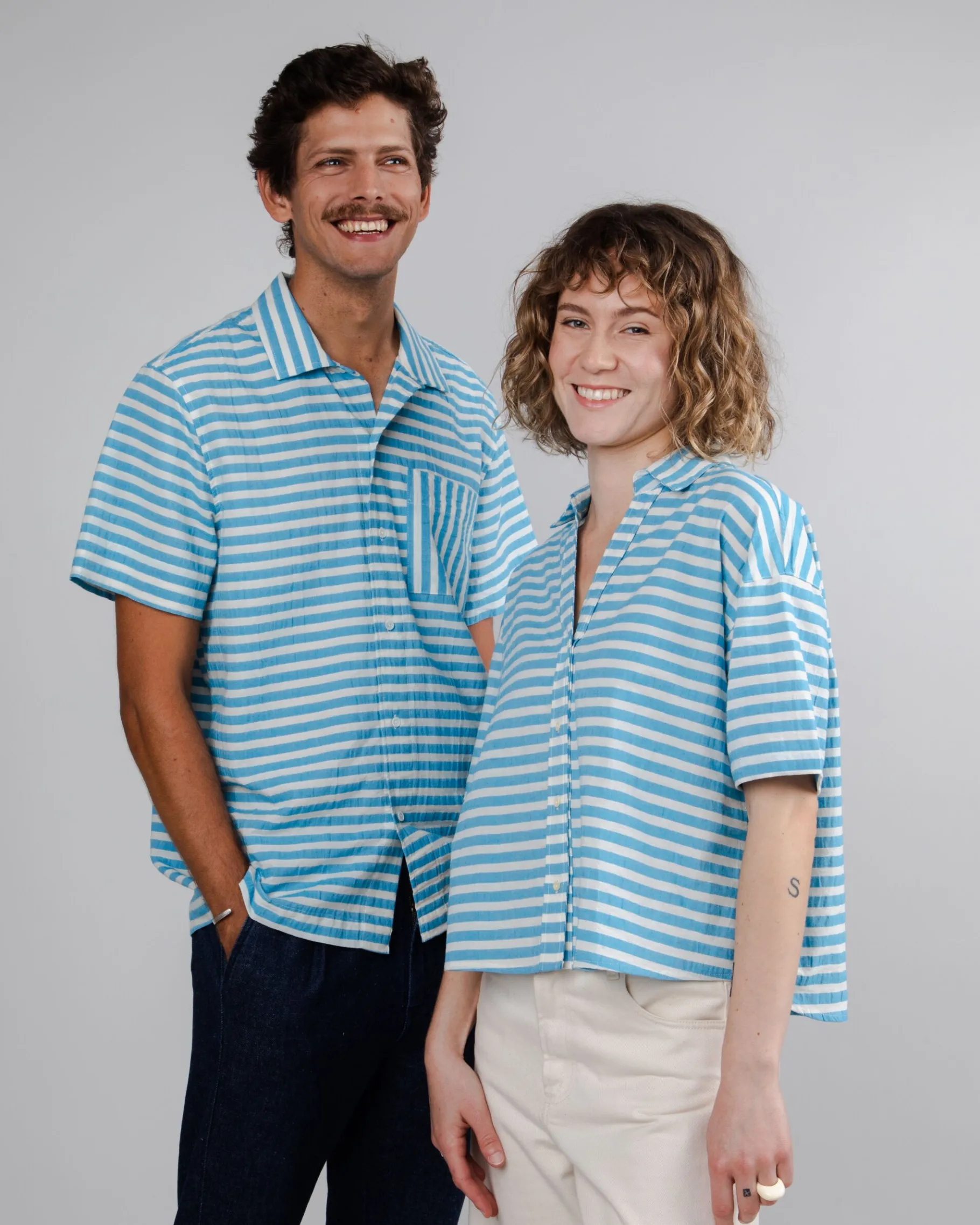 Gestreifte Kurzarmbluse in normaler Passform mit geradem Schnitt. Sie hat einen Reverskragen und einen Knopfverschluss. Sie hat eine aufgesetzte Tasche auf der Vorderseite und Falten auf der Rückseite. Ethisch hergestellt aus Bio-Baumwolle, recycelter Baumwolle und recyceltem Polyester.| Waschhinweise