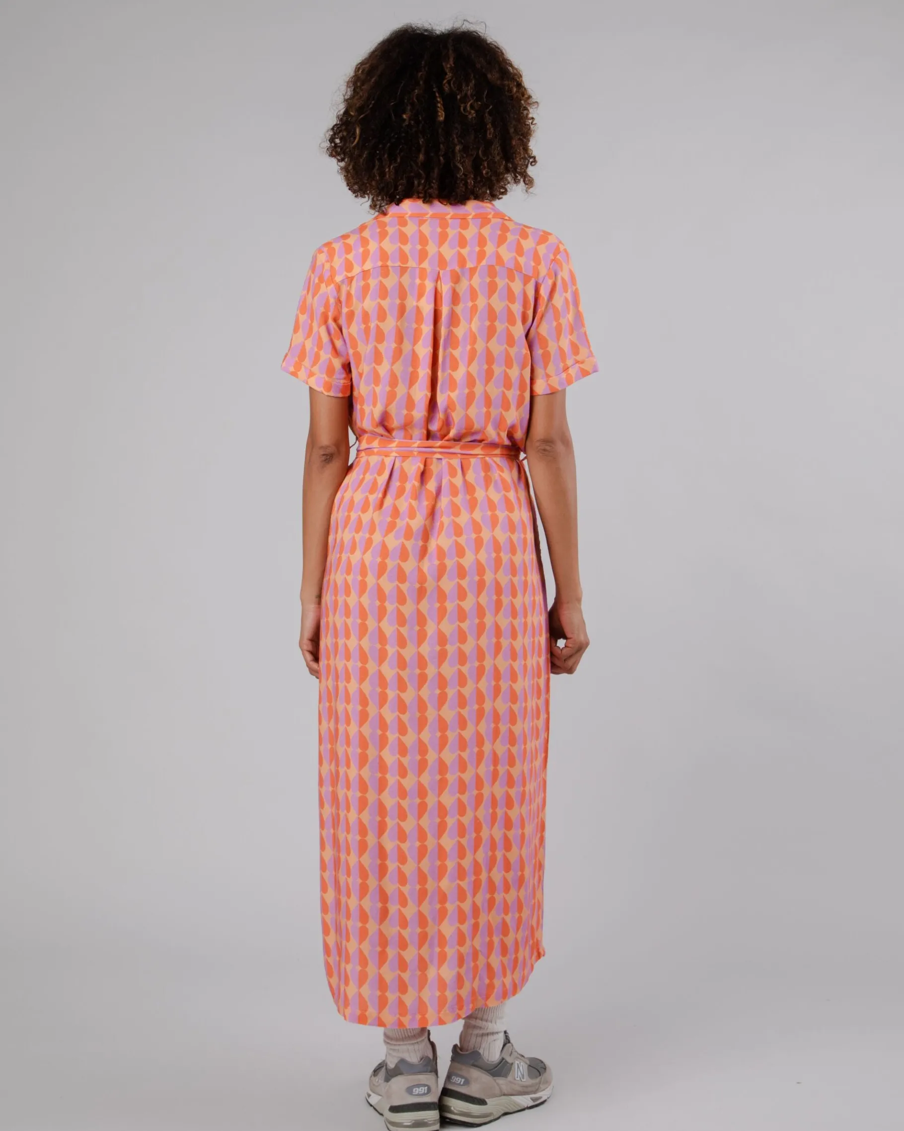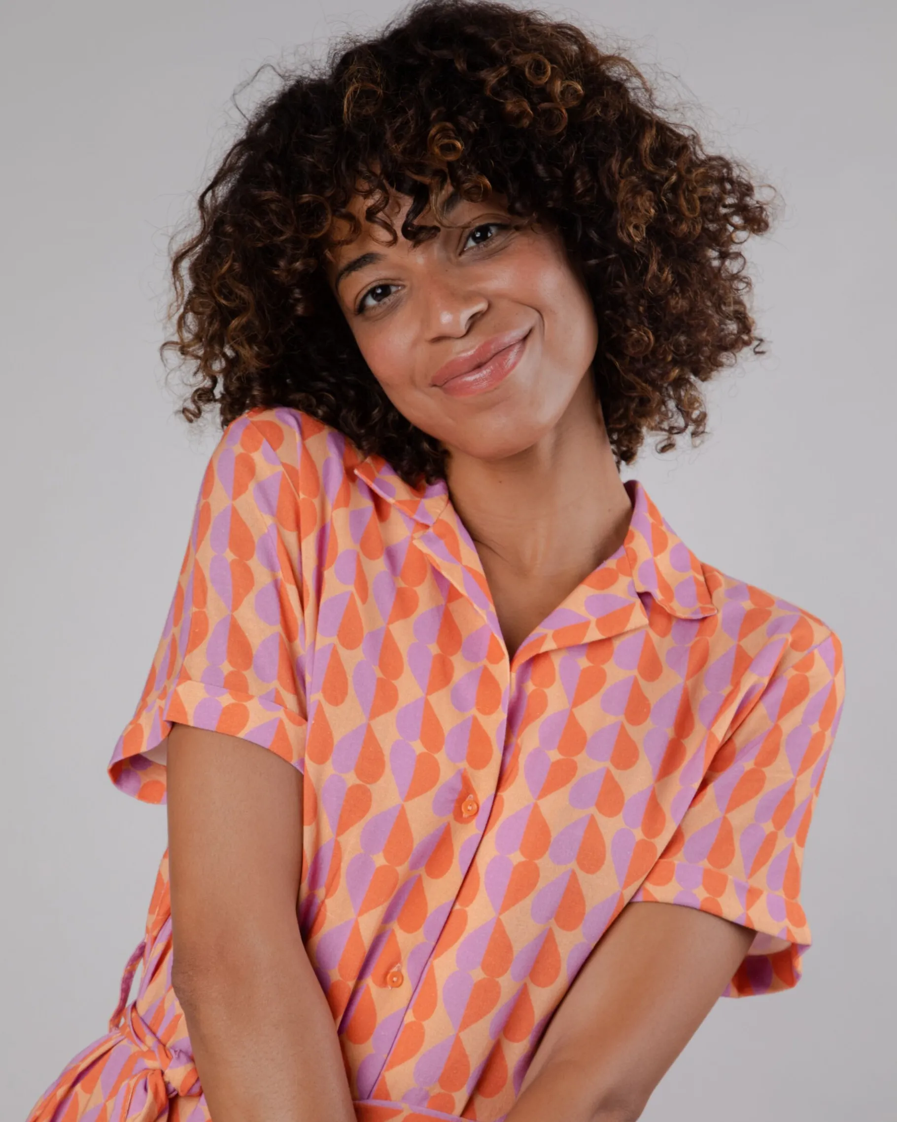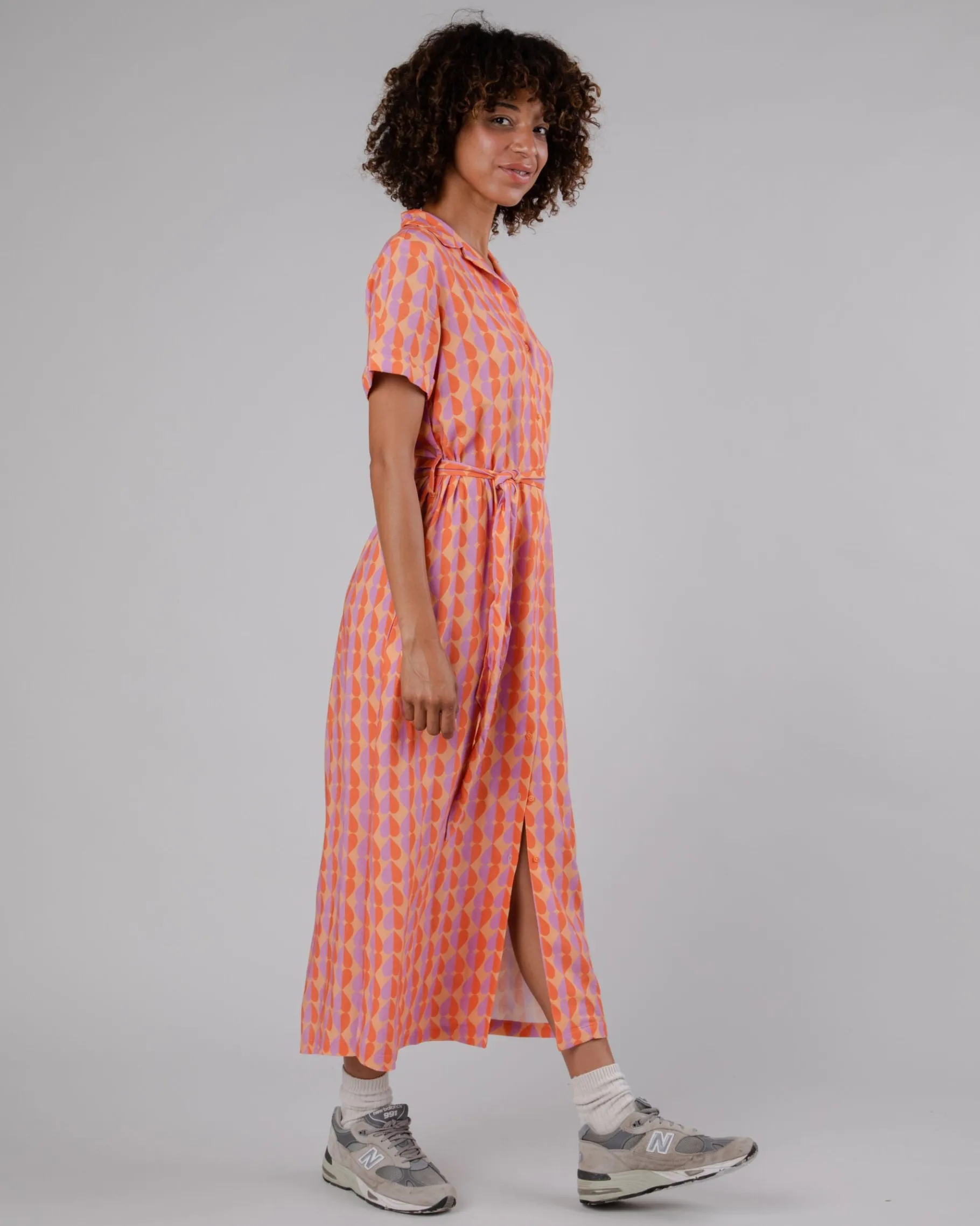 Gerade geschnittenes, kurzärmeliges, bedrucktes, langes Kleid mit V-Ausschnitt und Reverskragen. Es hat eine Schnürung und Knöpfe zum Schließen.Ethisch hergestellt aus nachhaltiger Viskose und Leinen.| Waschhinweise
