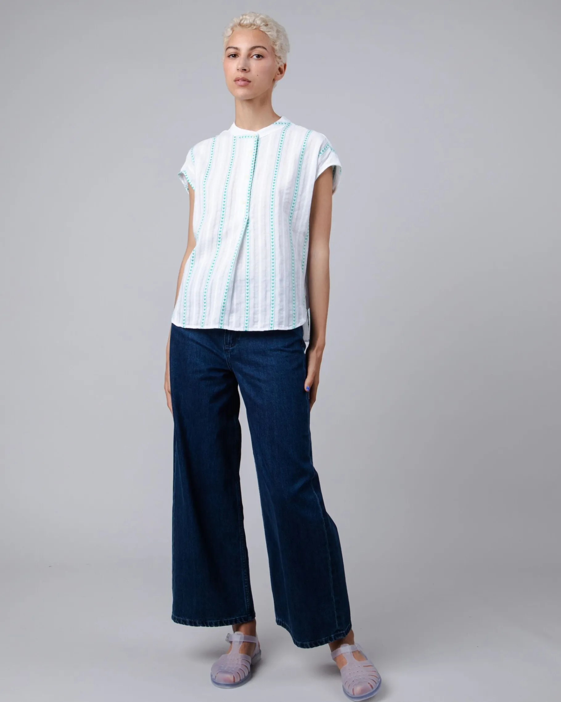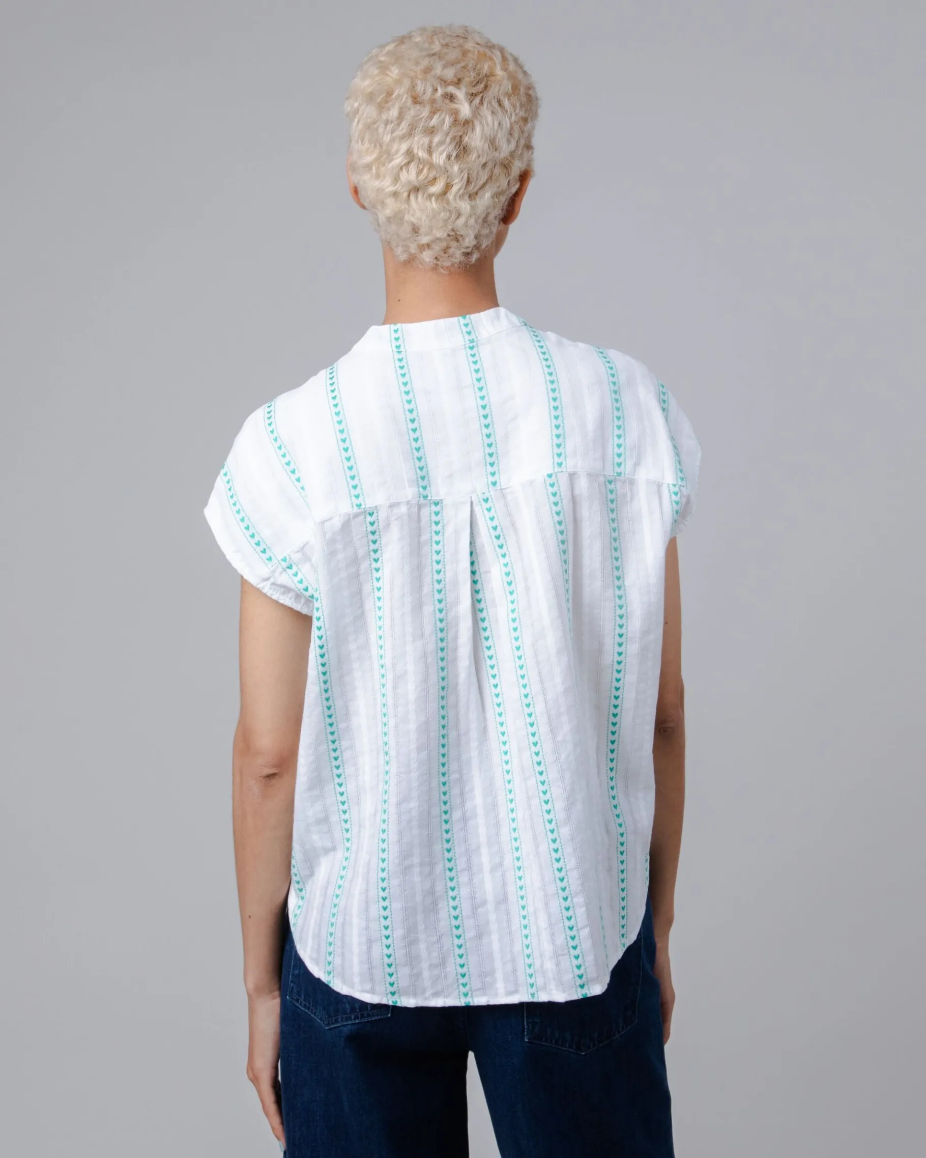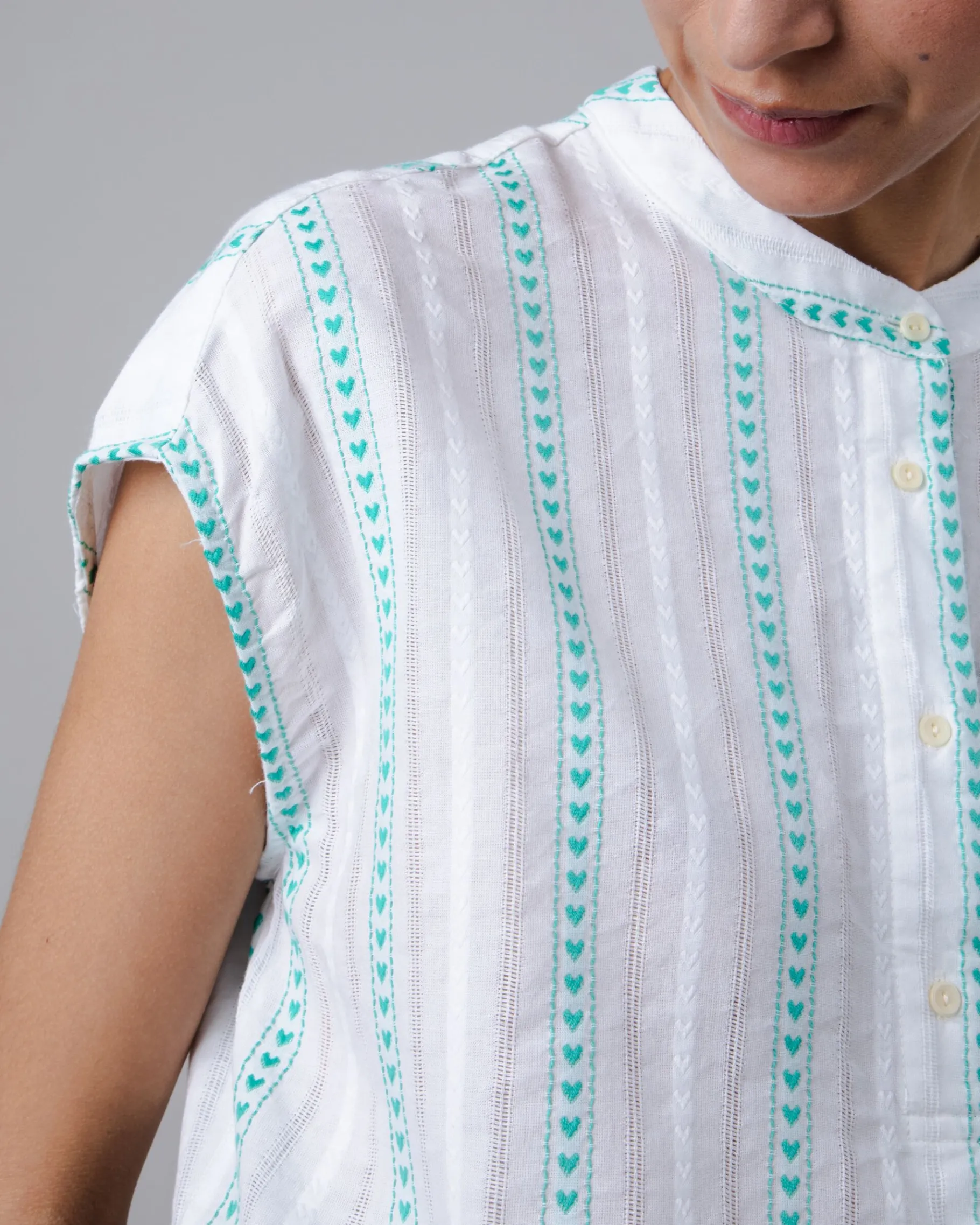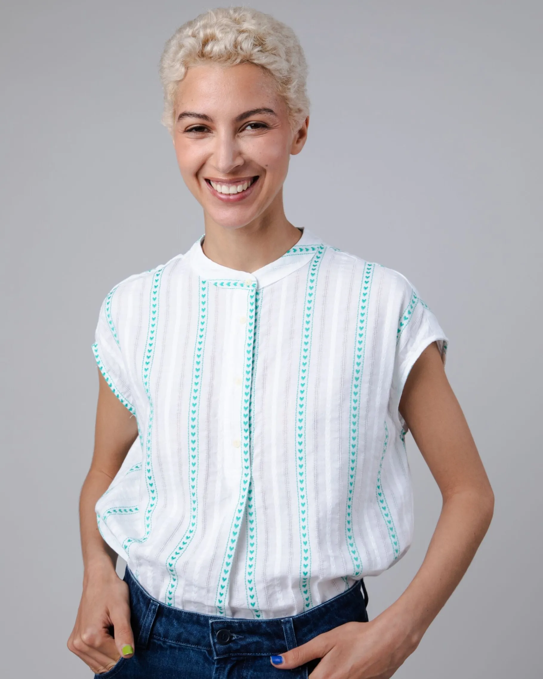 Übergroße Bluse mit langen Ärmeln, Mao-Kragen und Polo-Verschluss. Sie hat keinen Ärmelausschnitt und eine Kellerfalte in der Passe als zusätzliches Detail. Ethisch hergestellt aus biologischer Baumwolle.| Waschhinweise
