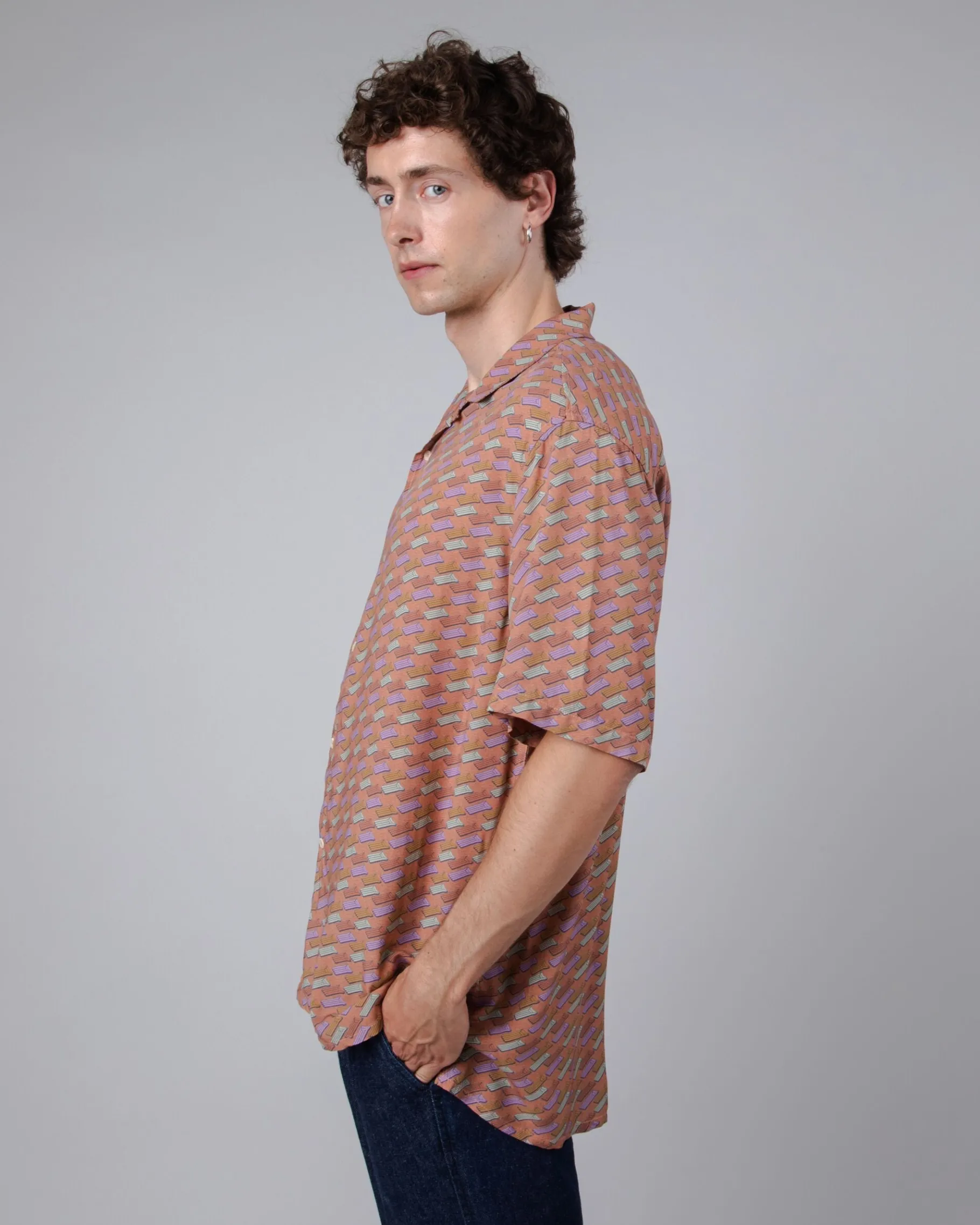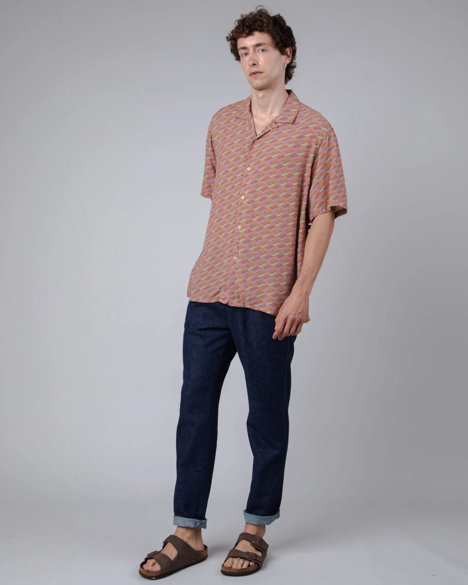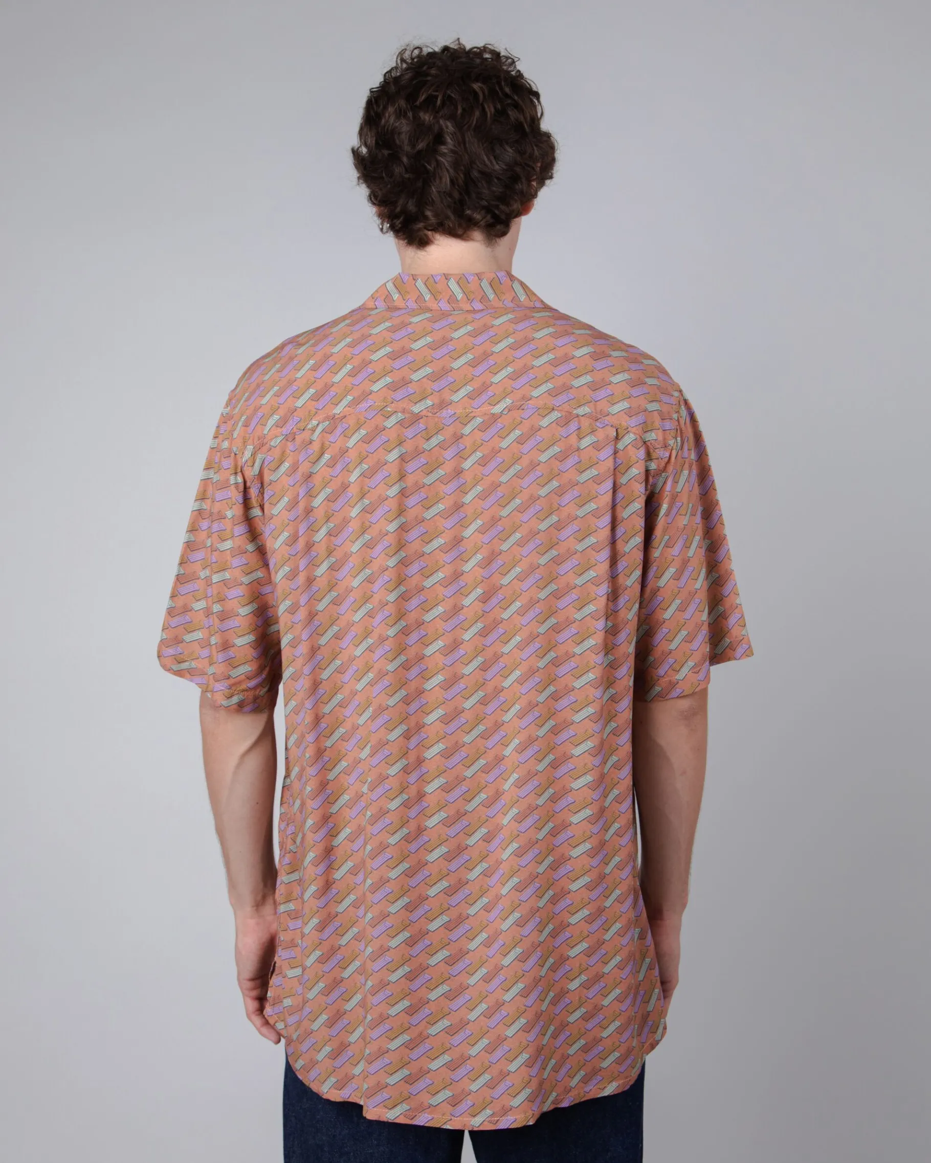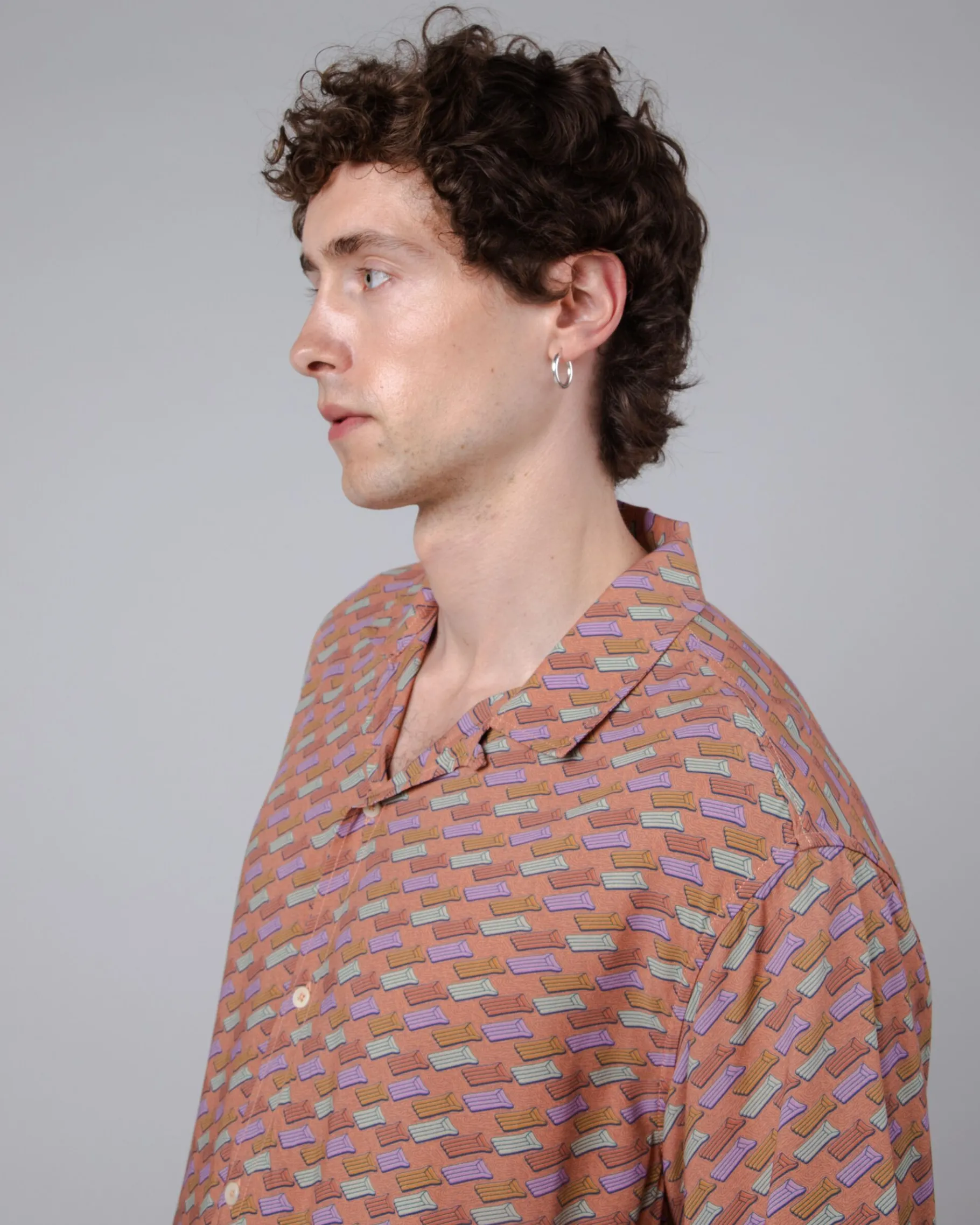 Locker sitzendes Kurzarm-Aloha-Shirt mit „Inflatables“-Aufdruck. Es hat eine leicht überschnittene Schulter, einen geraden Saum, einen Reverskragen und einen Knopfverschluss. Ethisch hergestellt aus nachhaltiger Viskose.| Waschhinweise