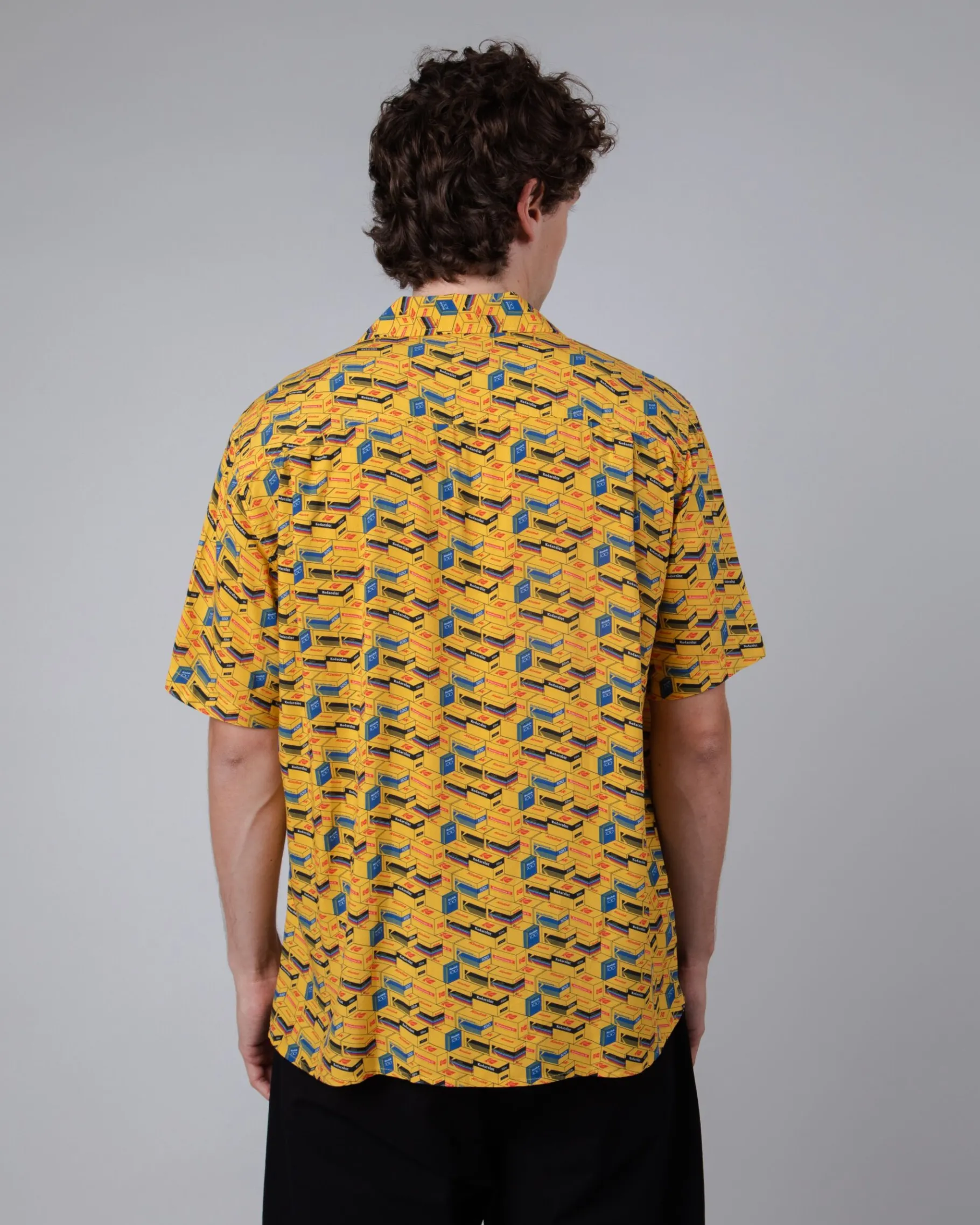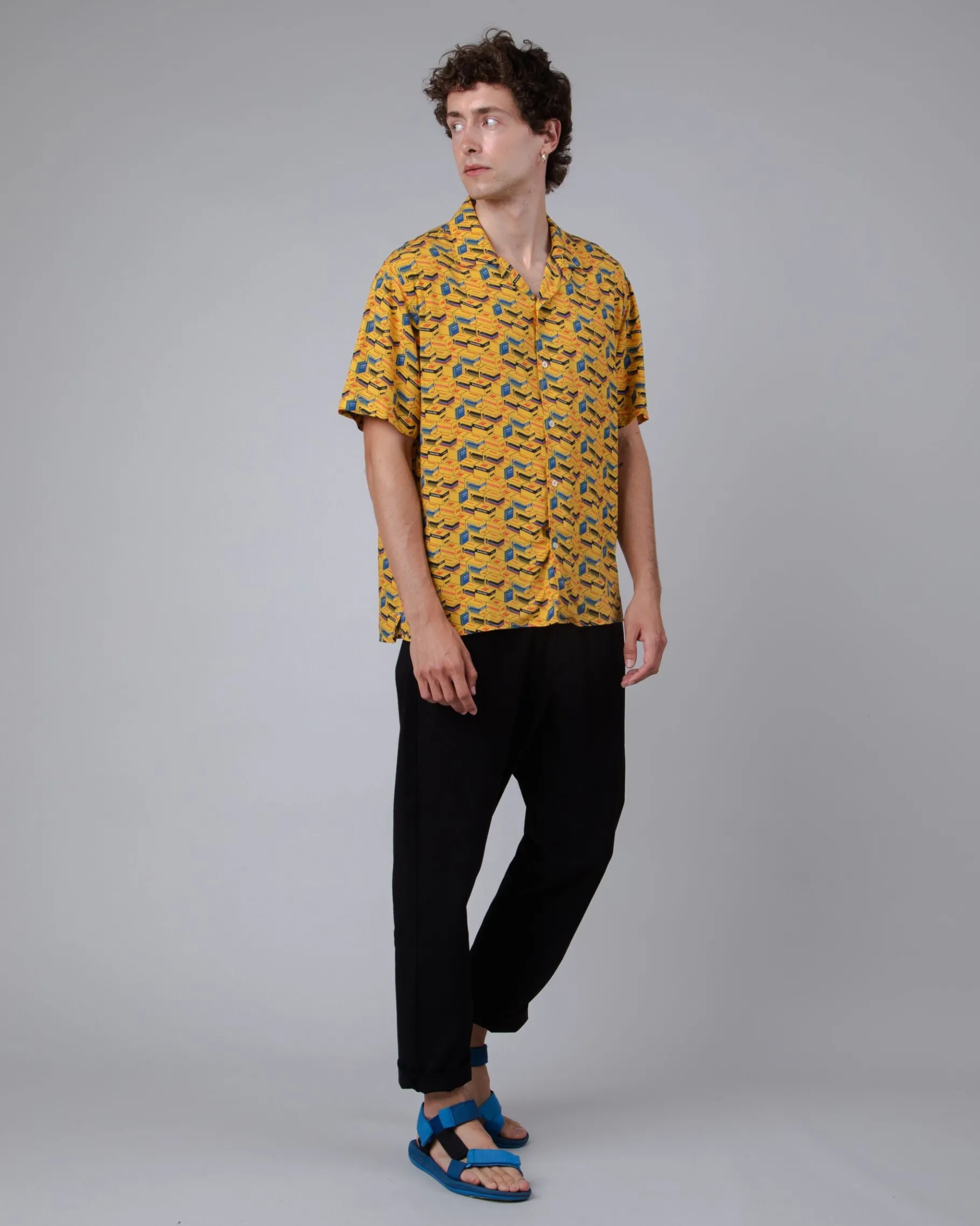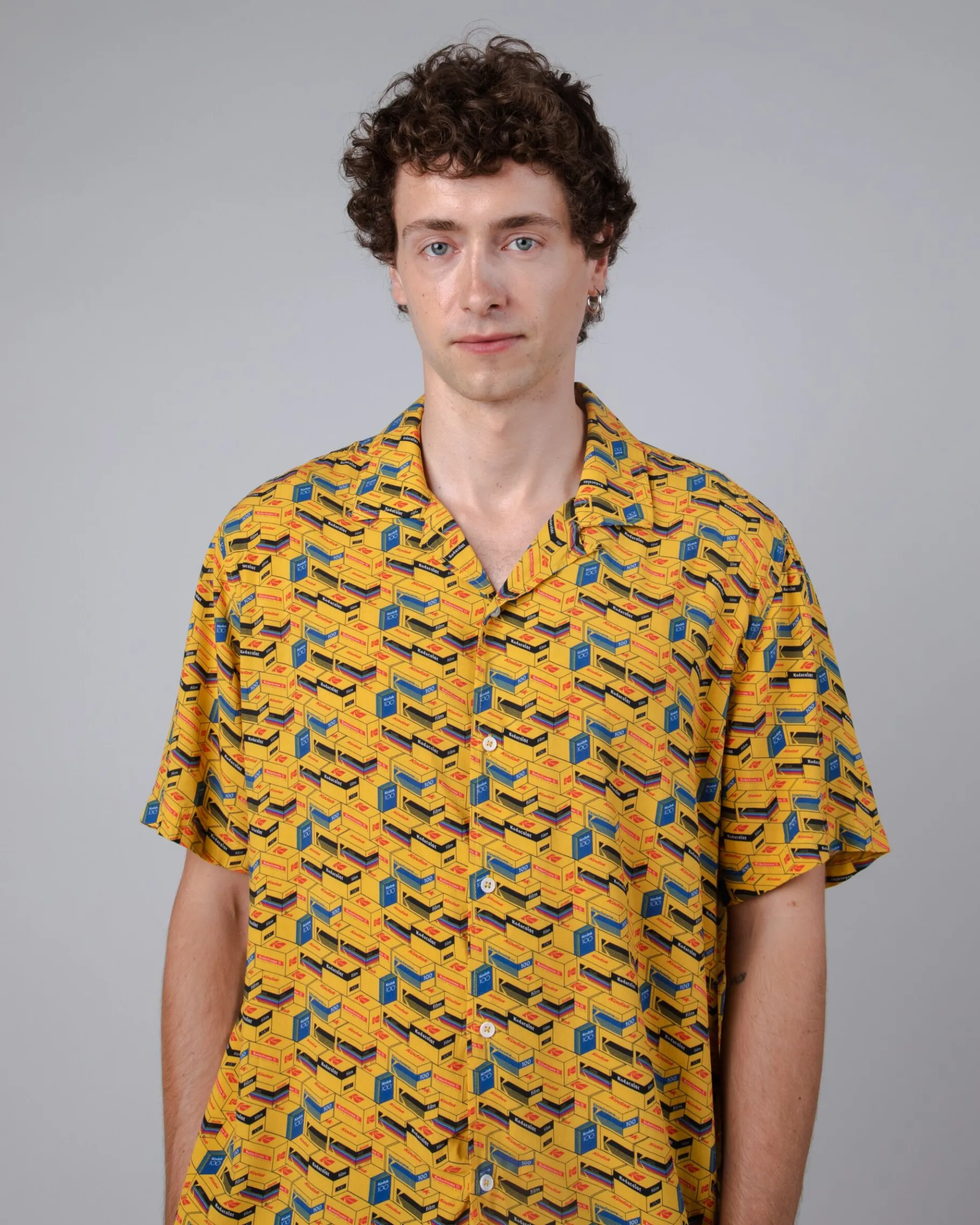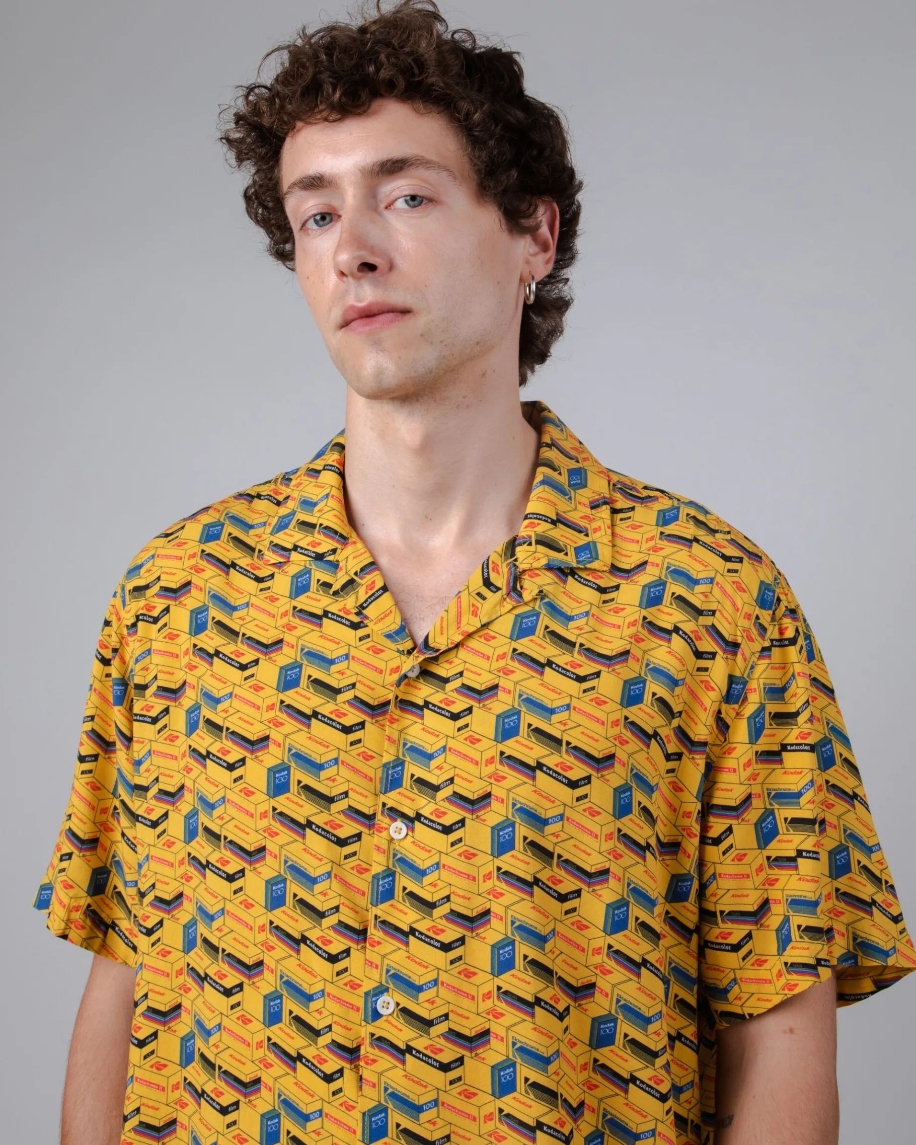 Kodak-Kurzarm-Shirt in entspannter Passform mit einem Kodak-Filmaufdruck. Es hat eine leicht überschnittene Schulter, einen geraden Saum, einen Reverskragen und einen Knopfverschluss. Ethisch hergestellt aus nachhaltiger Viskose.| Waschhinweise