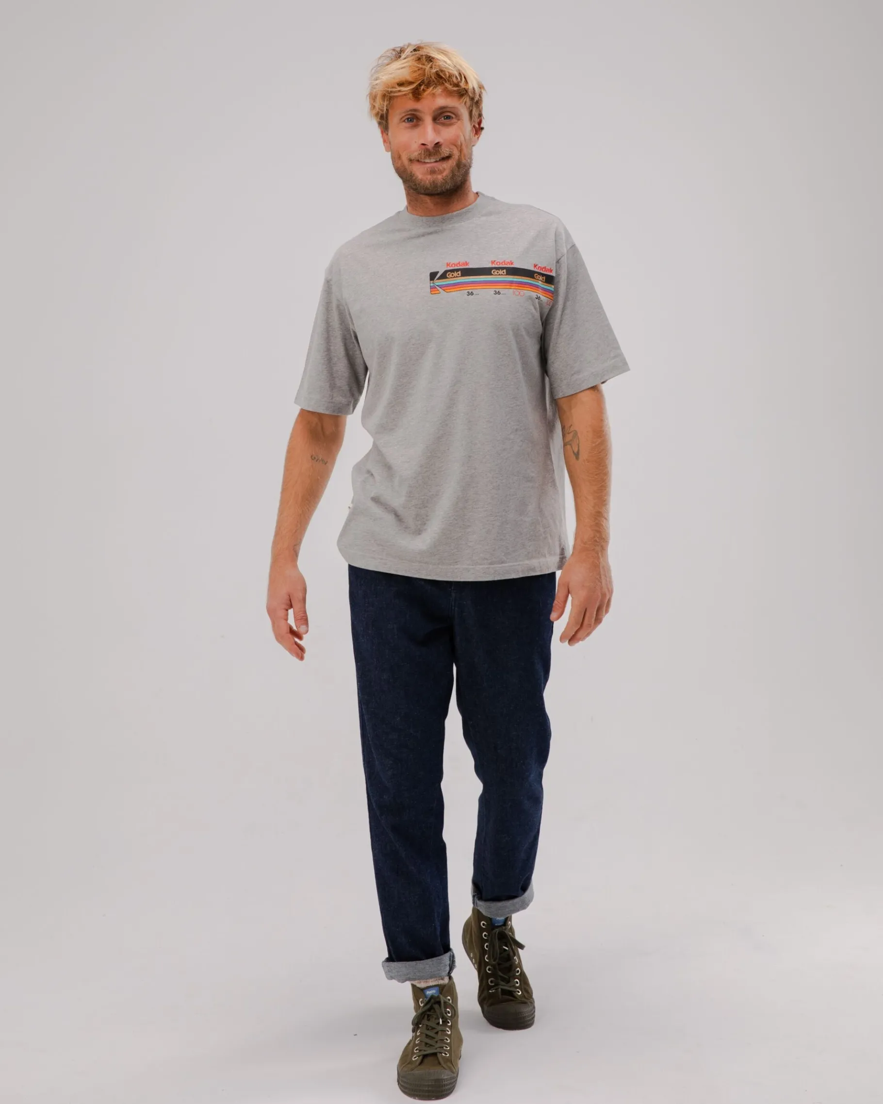 Übergroßes Kurzarm-T-Shirt mit Kodak-Aufdruck. Es hat einen ovalen Ausschnitt und eine leicht überschnittene Schulter. Ethisch hergestellt aus biologischer Baumwolle.| Waschhinweise