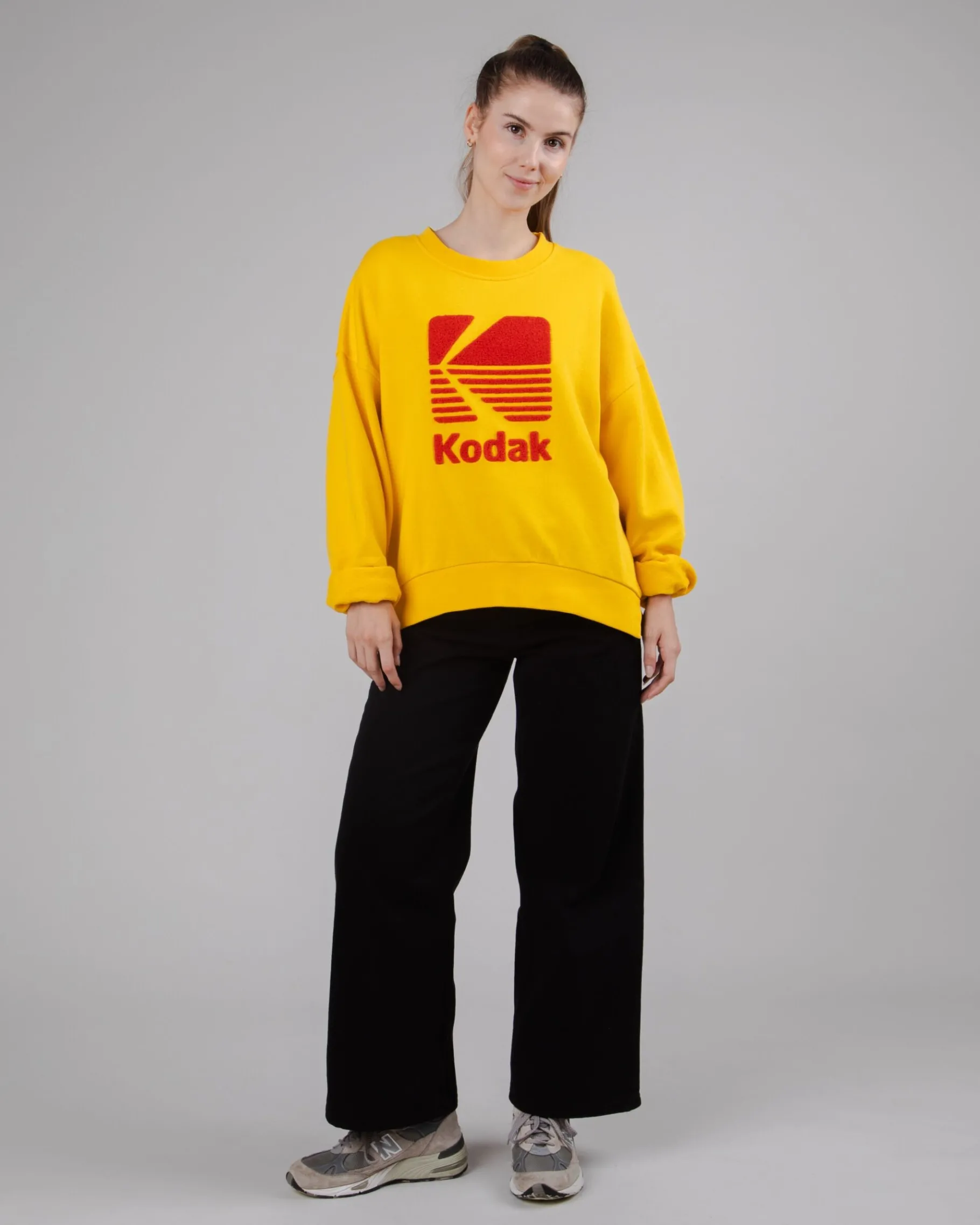 Gerade geschnittenes Langarm-Sweatshirt in normaler Passform mit grafischem, strukturiertem Kodak-Logo. Es hat eine überschnittene Schulter, einen gerundeten Kragen und einen abgerundeten Saum. Ethisch hergestellt aus biologischer Baumwolle.| Waschhinweise