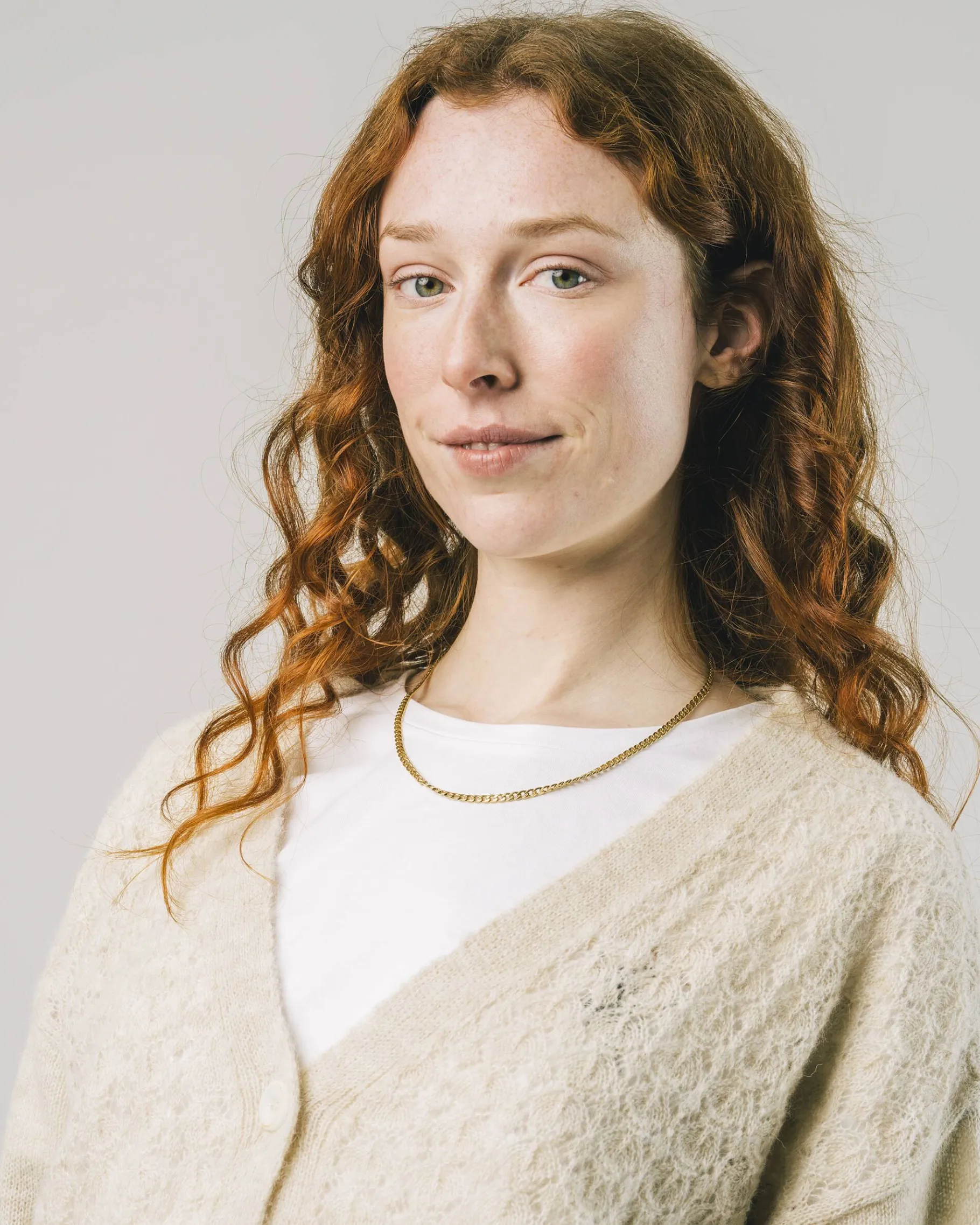 Eine filigrane Stricktextur trifft auf kuschelig-weiches Material – dieser Cardigan im Oversized-Fit lässt Träume wahr werden! Dank der Mischung aus verschiedenen Fasern, wie Alpaca-Wolle und recycelten Polyamiden ist er weich und wärmend zugleich.