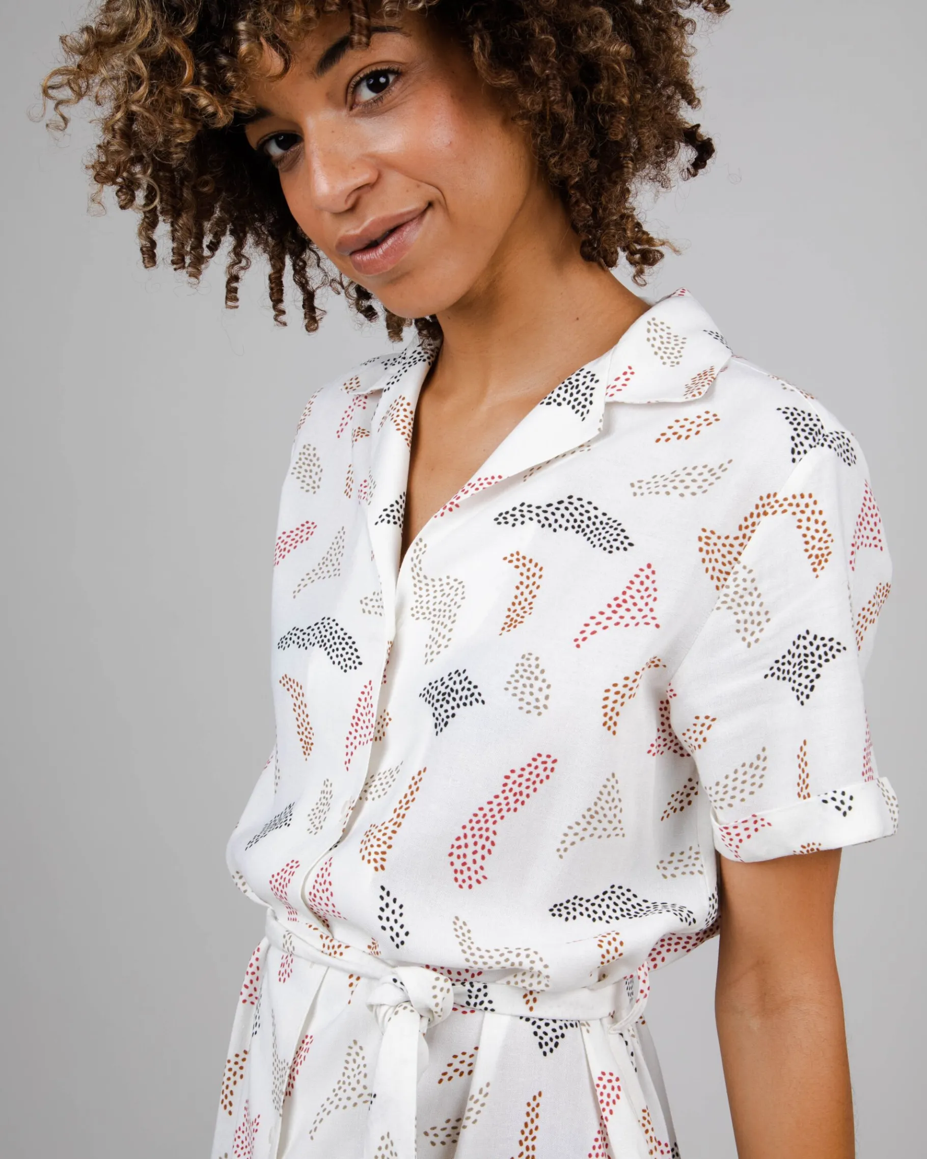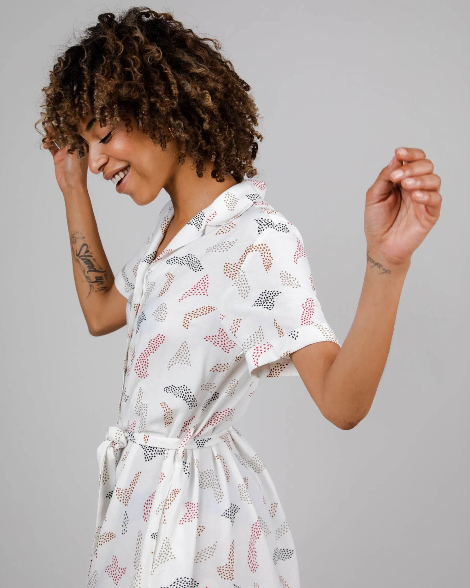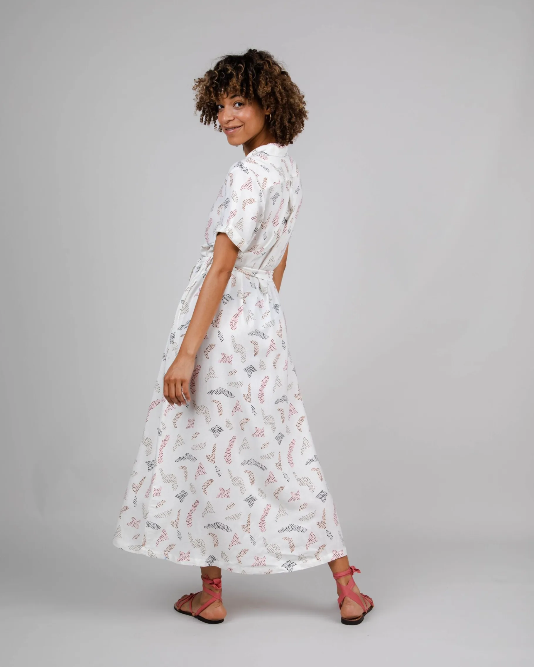 Gemustertes, langes Kleid mit Beinschlitz aus besonders leichtem Material für warme Sommertage. Kurze Ärmel, Gürtel in der Taille und Knöpfe. Frische, sommerliche Farben in besonderem Design. Unter fairen Bedingungen hergestellt aus nachhaltiger Viskose.| Waschhinweise