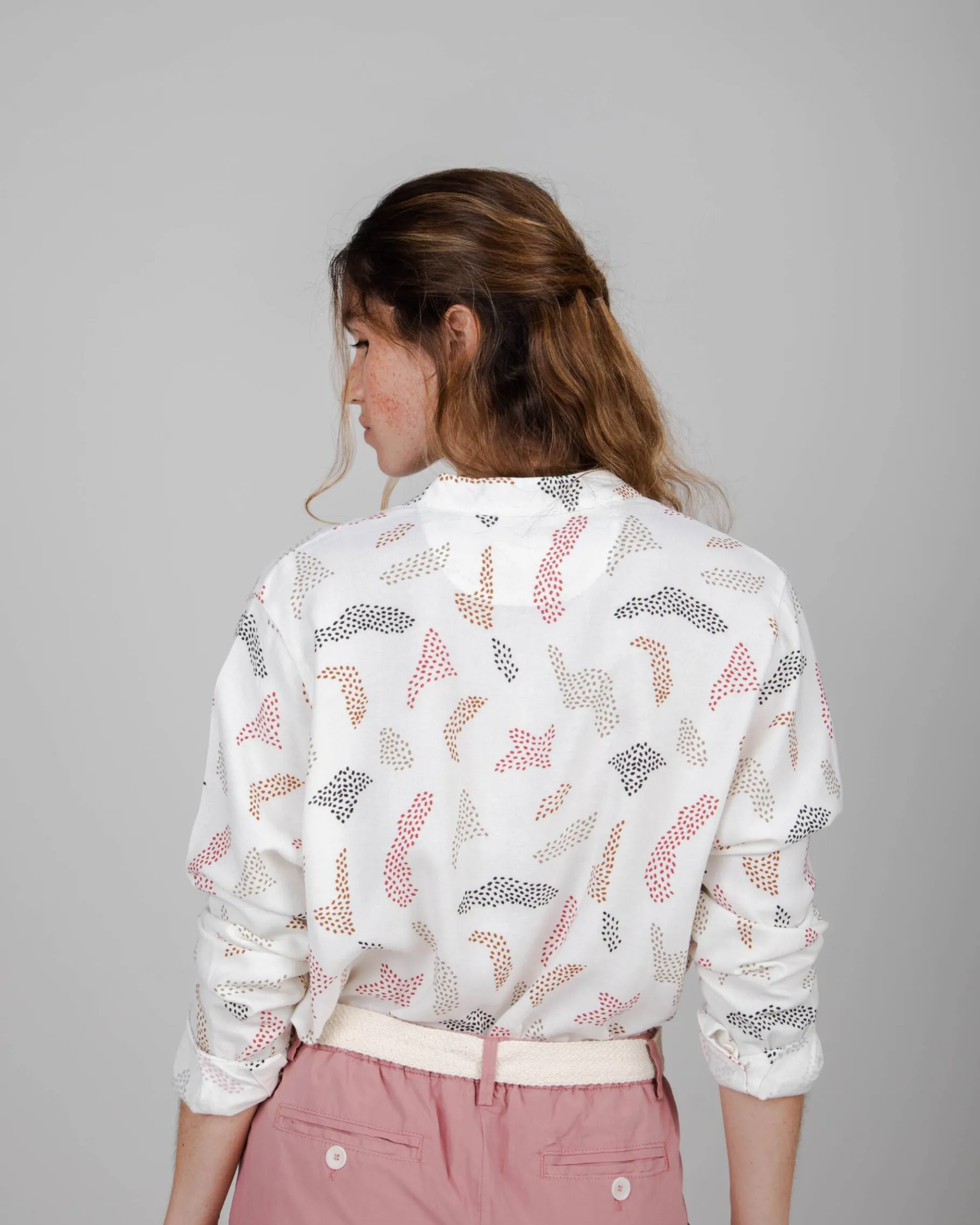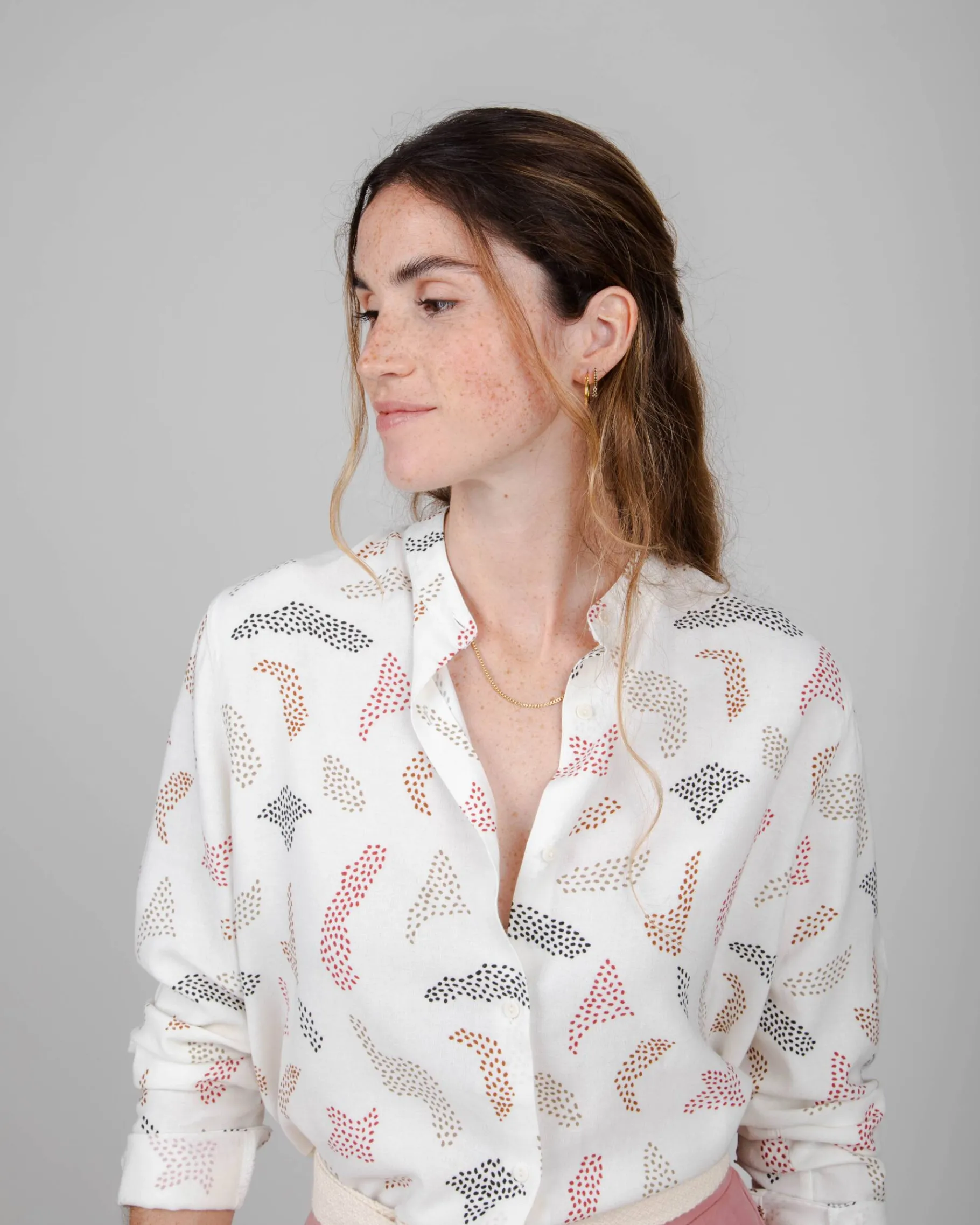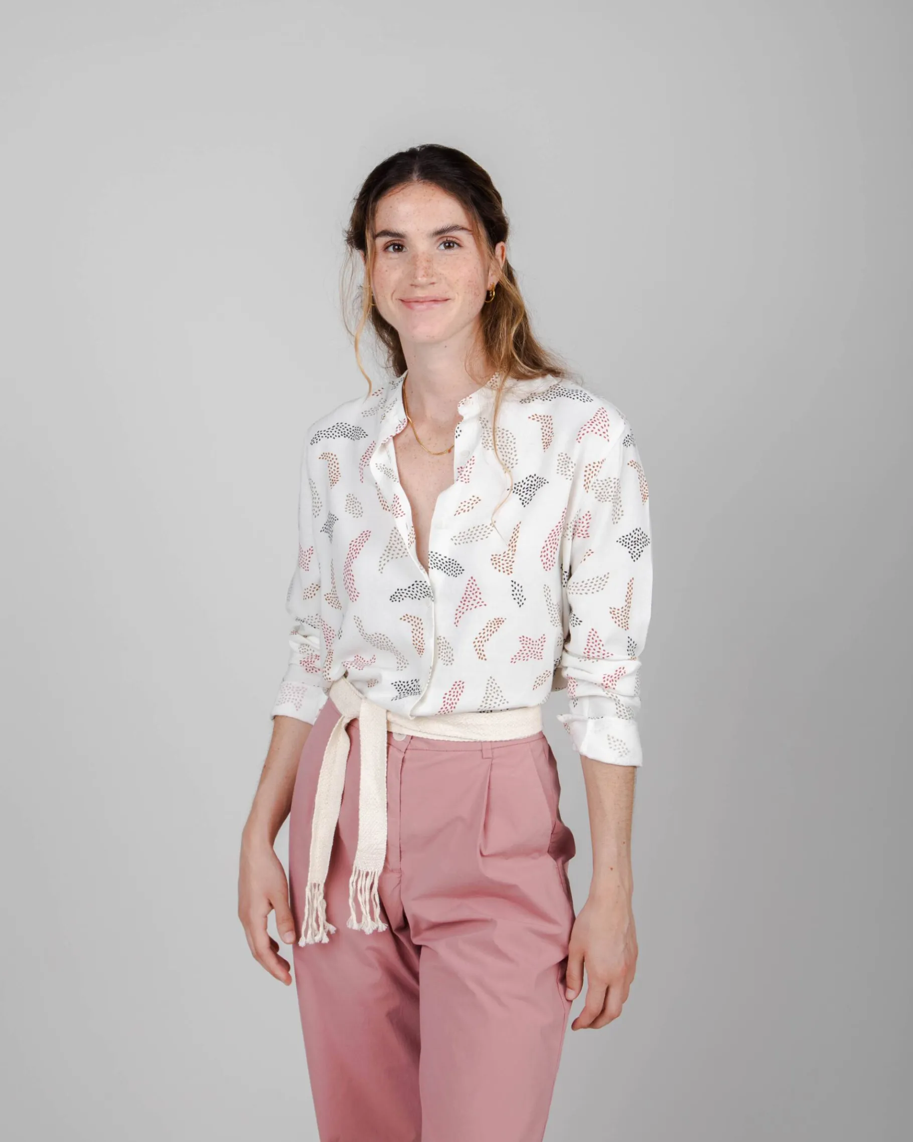 Langärmelige Bluse mit Mao Kragen. Regular fit mit ganz besonderem, subtilen Design. Unter fairen Bedingungen hergestellt aus einem nachhaltigem Leinen und Viskose-Mix.| Waschhinweise