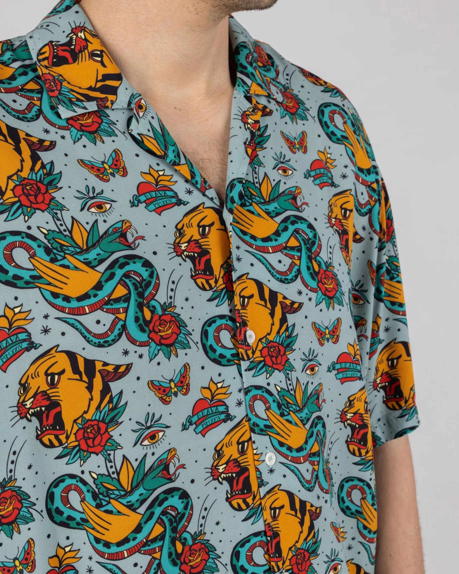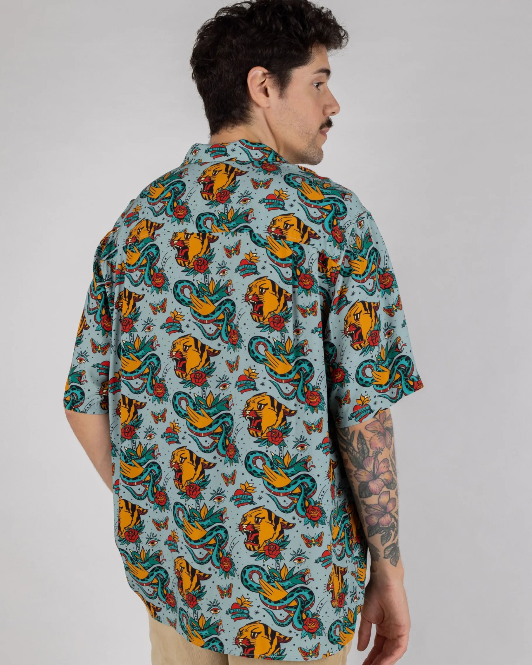 Kurzärmeliges Aloha-Shirt in lockerer Passform mit einer Old School Tattoo Illustration. Mit leicht überschnittener Schulter, geradem Saum, Reverskragen und Knöpfen zum Verschließen. Ethisch hergestellt aus Bio-Baumwolle und nachhaltiger Viskose.| Waschhinweise