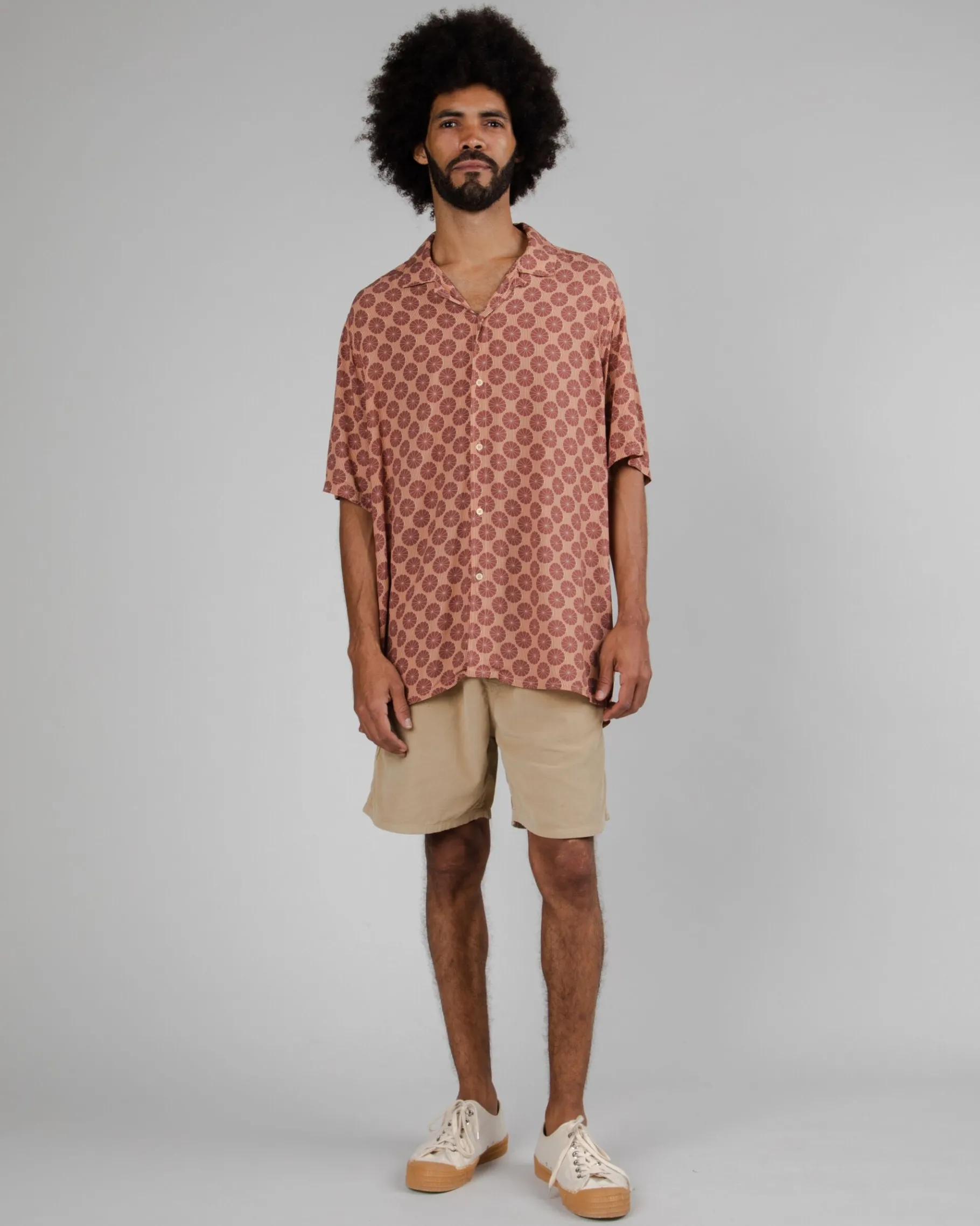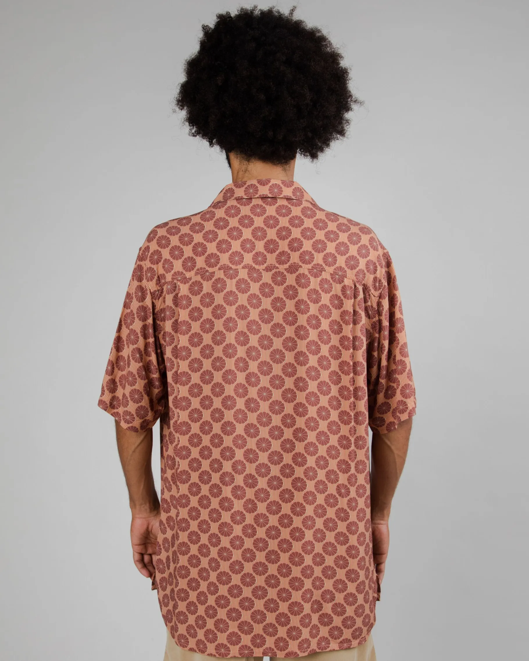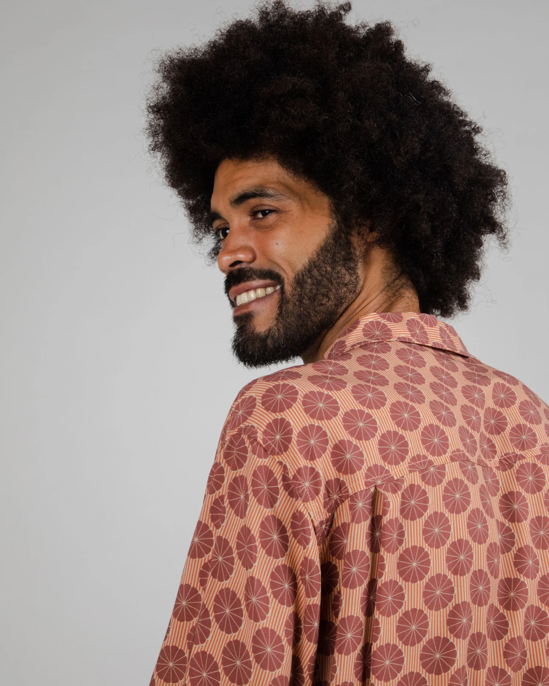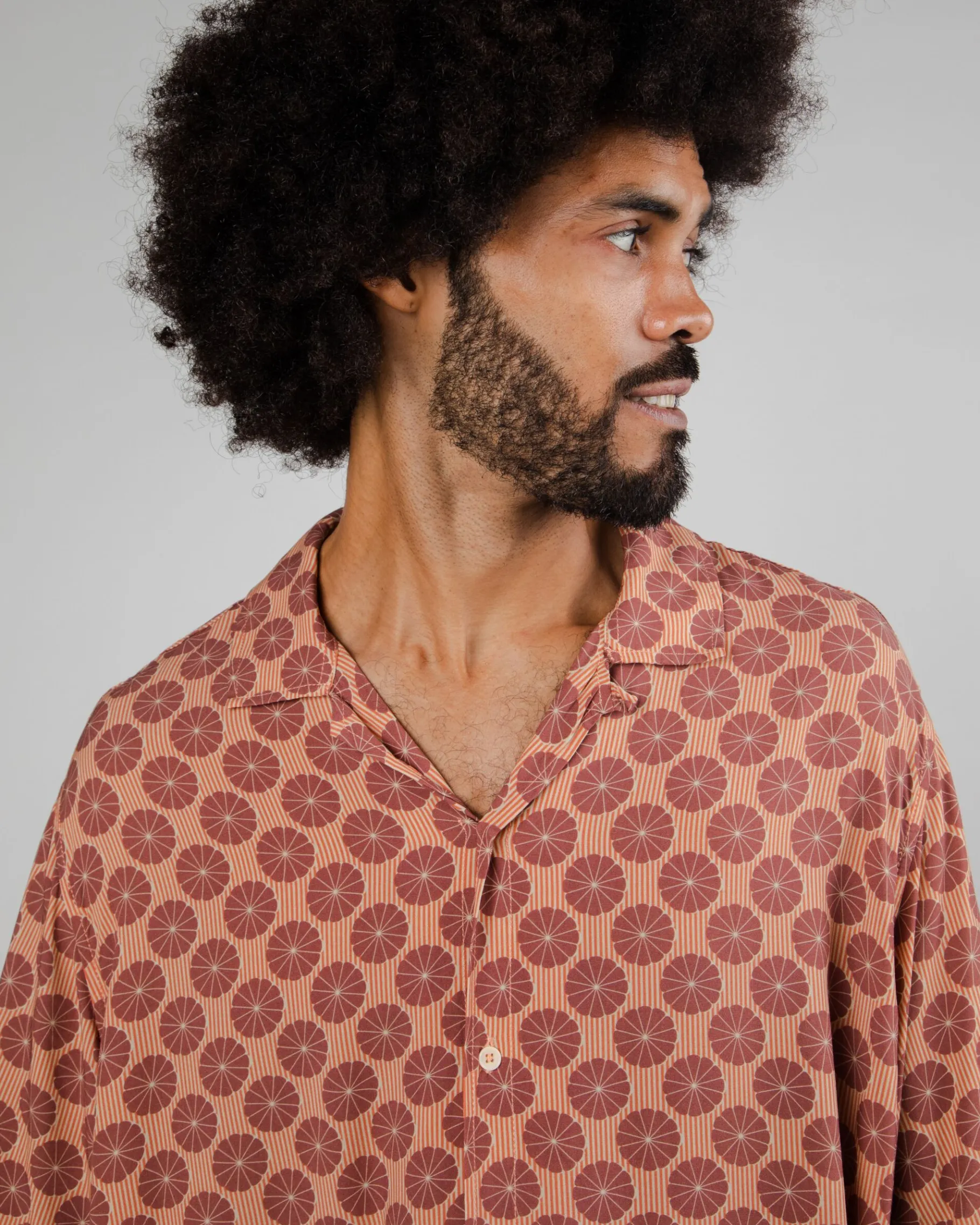 Kurzärmeliges Aloha-Shirt in lockerer Passform mit „Sonnenschirm“-Aufdruck. Es hat eine leicht überschnittene Schulter, einen geraden Saum, einen Reverskragen und einen Knopfverschluss. Ethisch hergestellt aus nachhaltiger Viskose.| Waschhinweise
