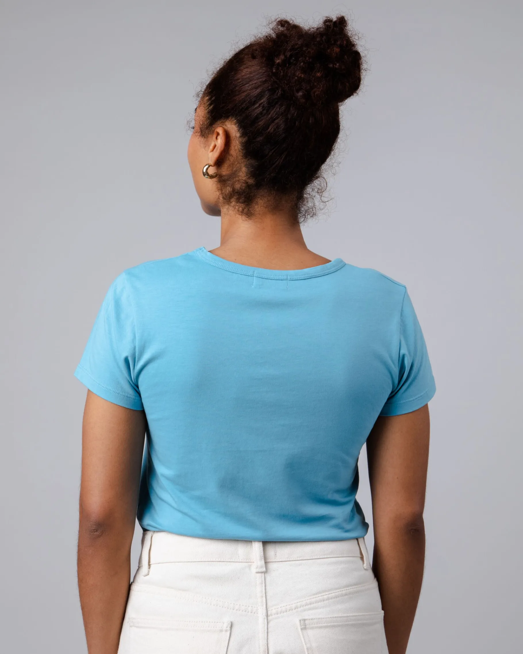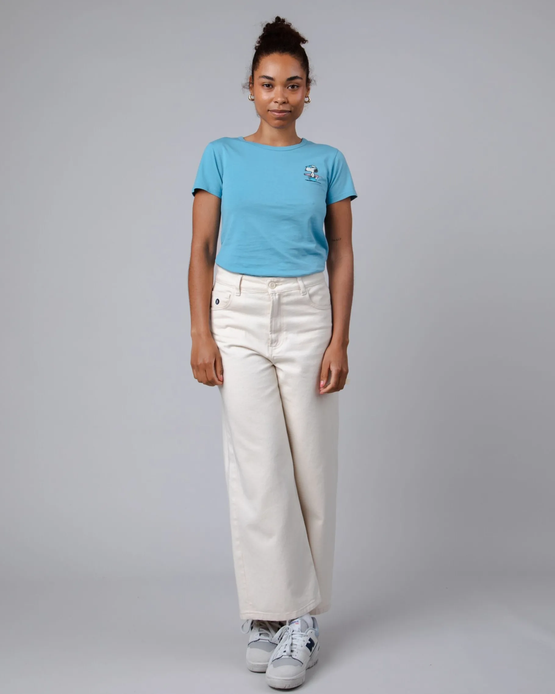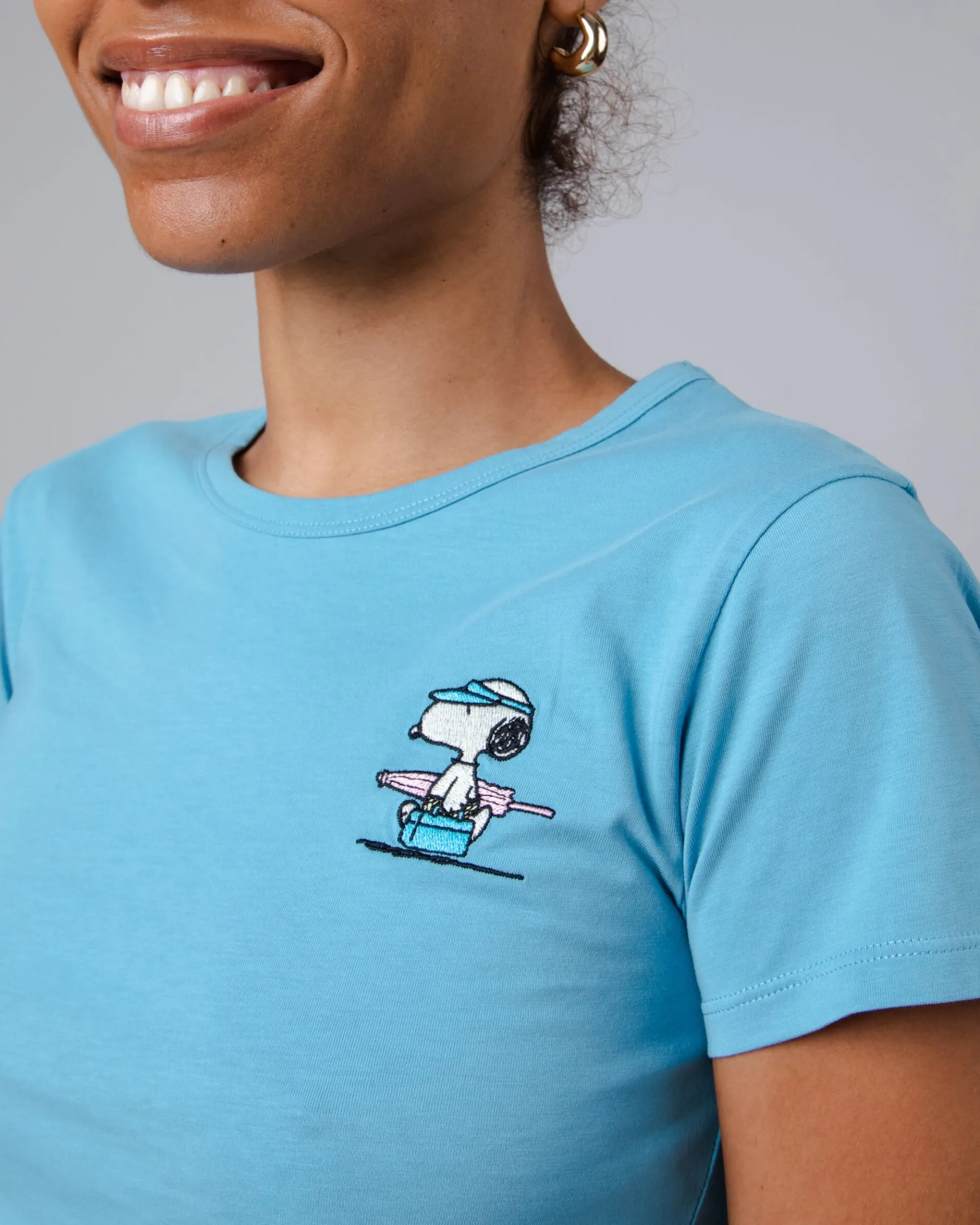 Peanuts-T-Shirt mit kurzen Ärmeln und Snoopy-Stickerei. Es hat einen runden Kragen und einen taillierten Ärmelausschnitt. Ethisch hergestellt aus biologischer Baumwolle.| Waschhinweise