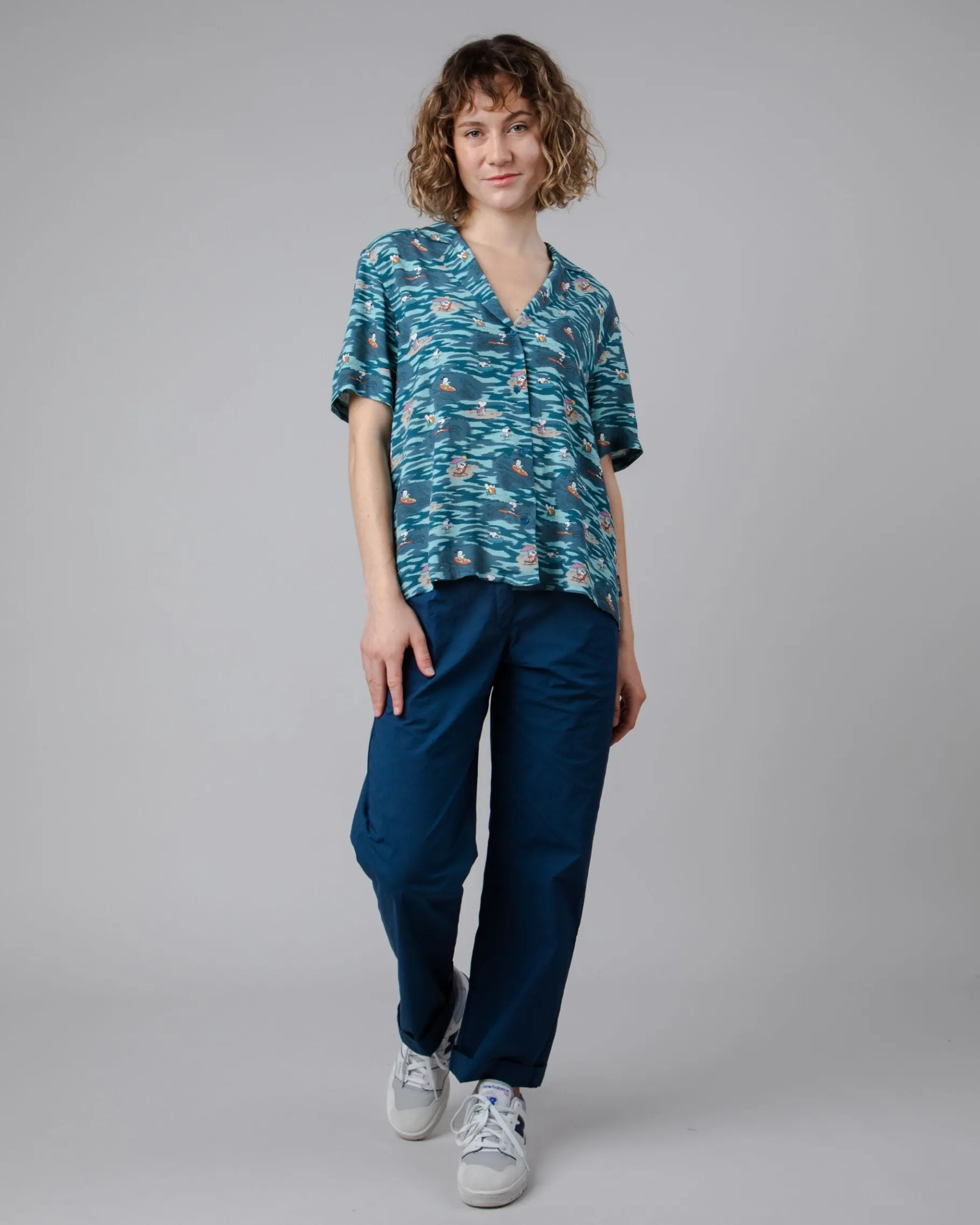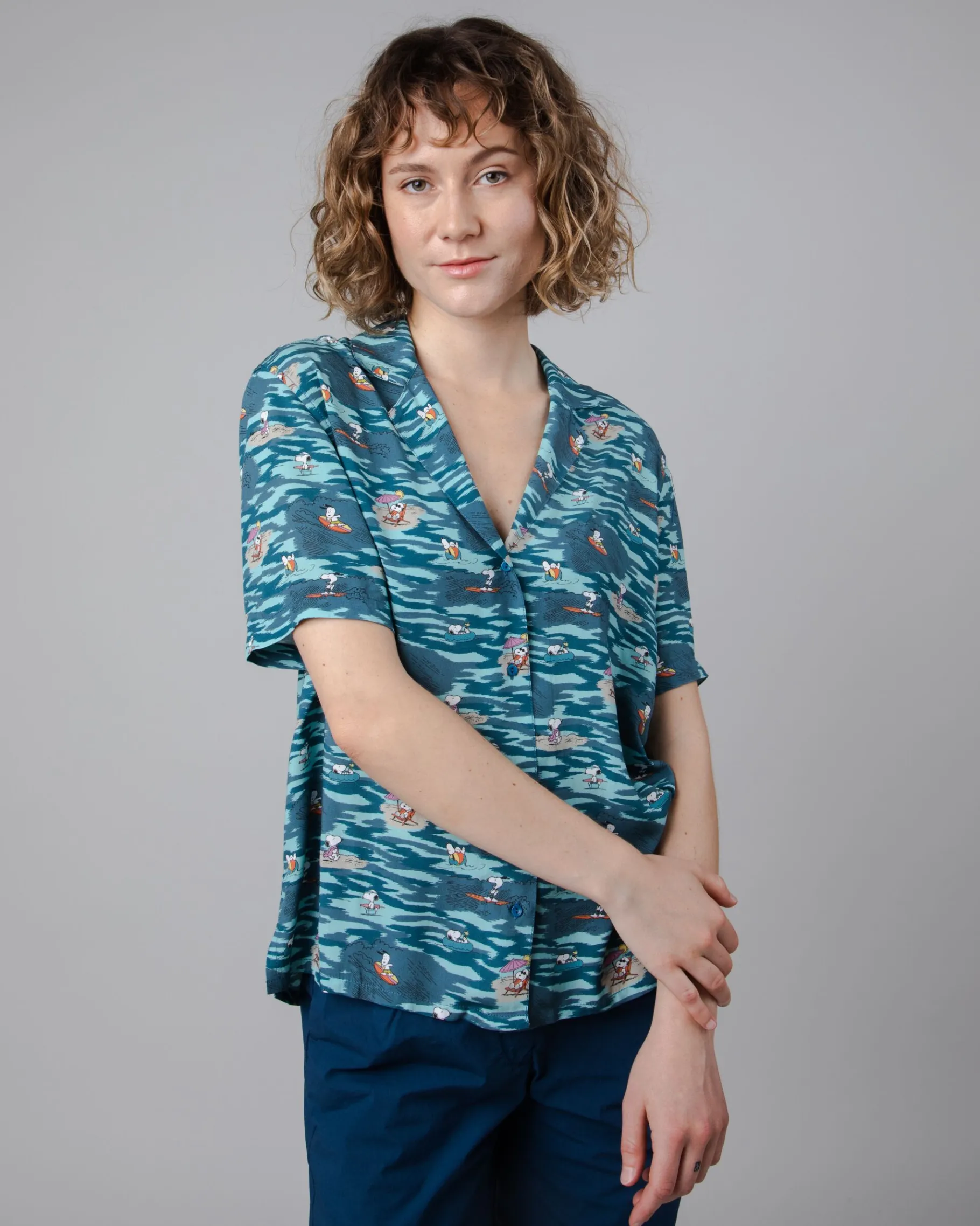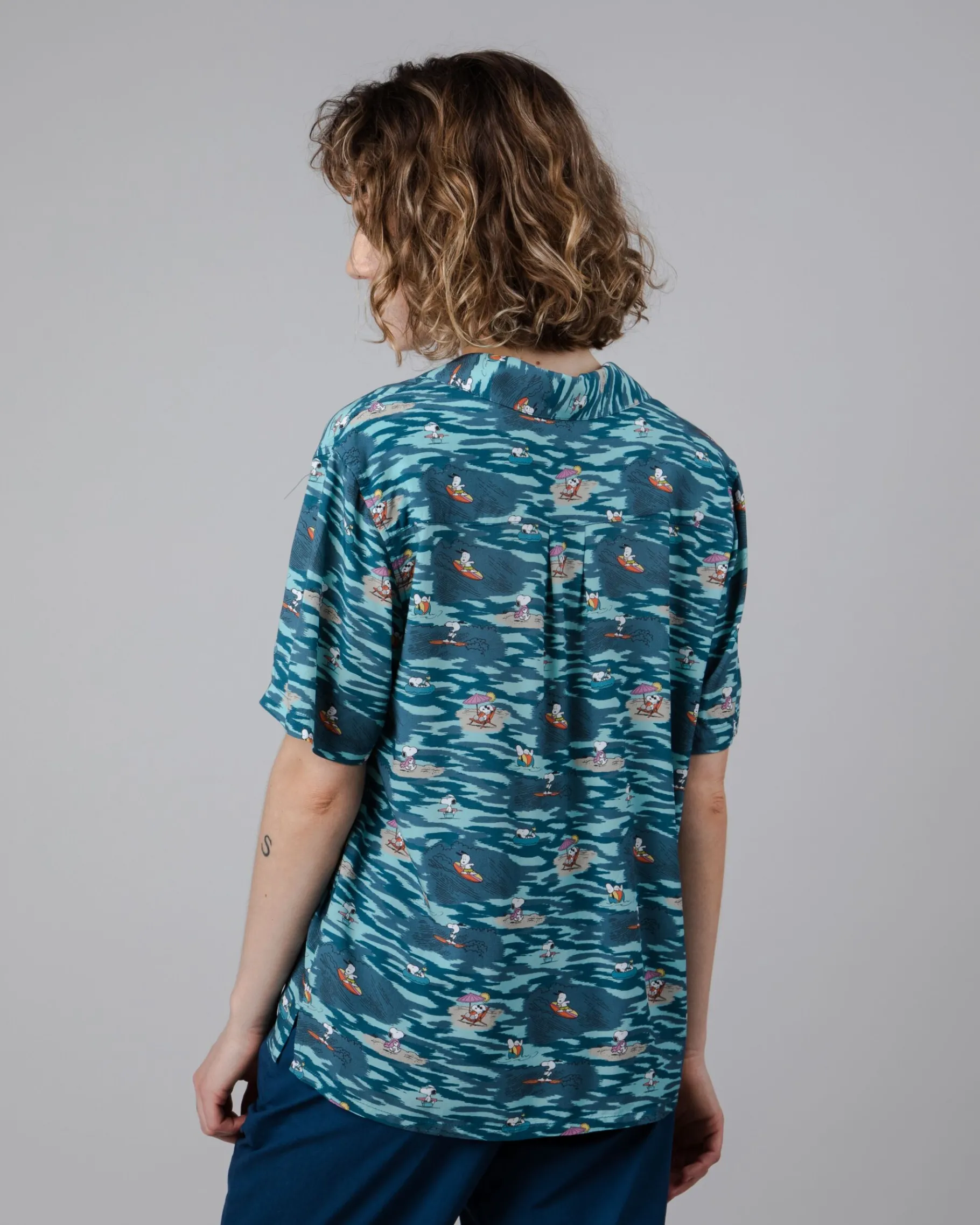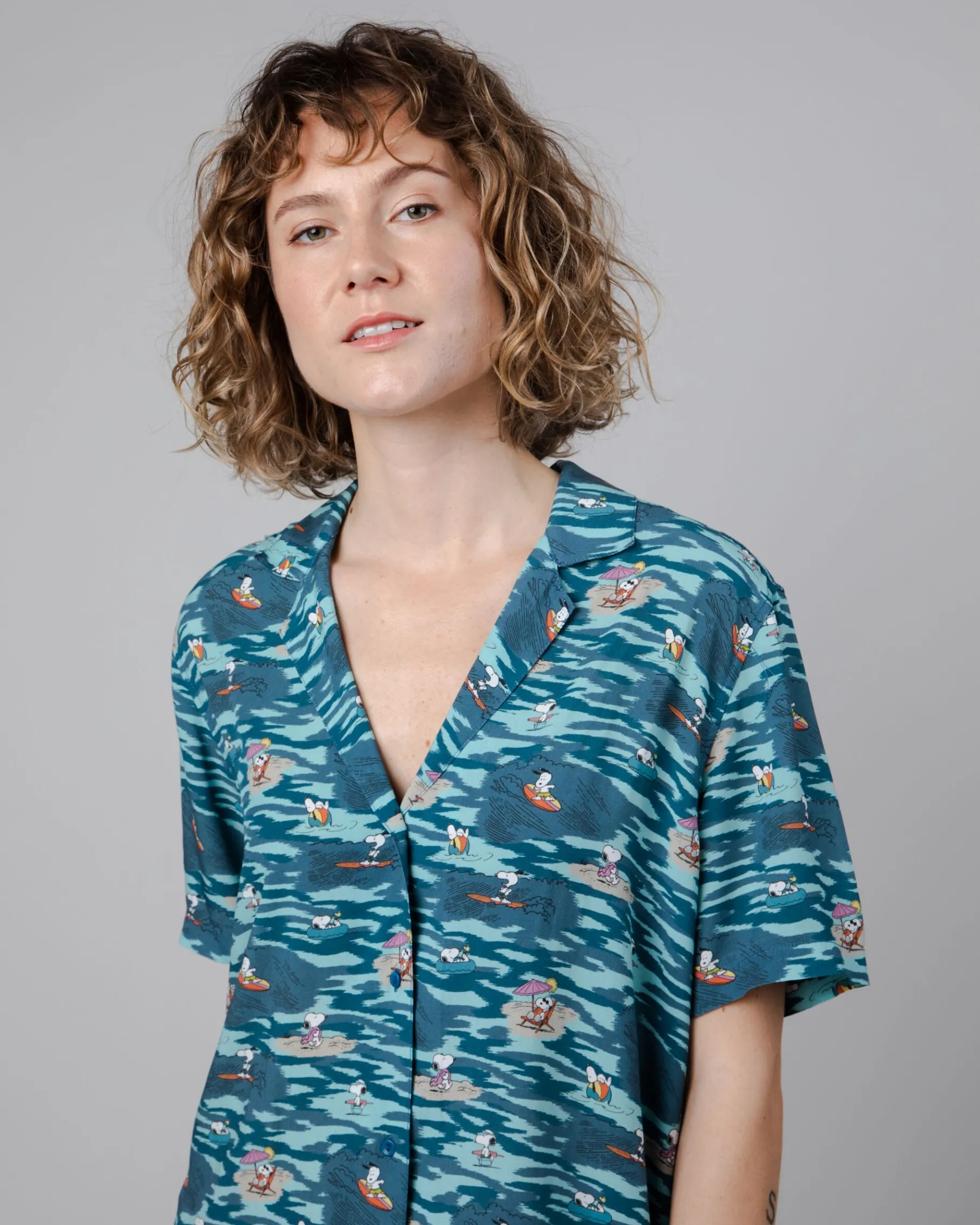 Locker geschnittene kurzärmelige Aloha-Bluse mit Peanuts-Aufdruck. Es hat eine leicht überschnittene Schulter, einen geraden Saum, einen Reverskragen und einen Knopfverschluss. Ethisch hergestellt aus nachhaltiger Viskose.| Waschhinweise