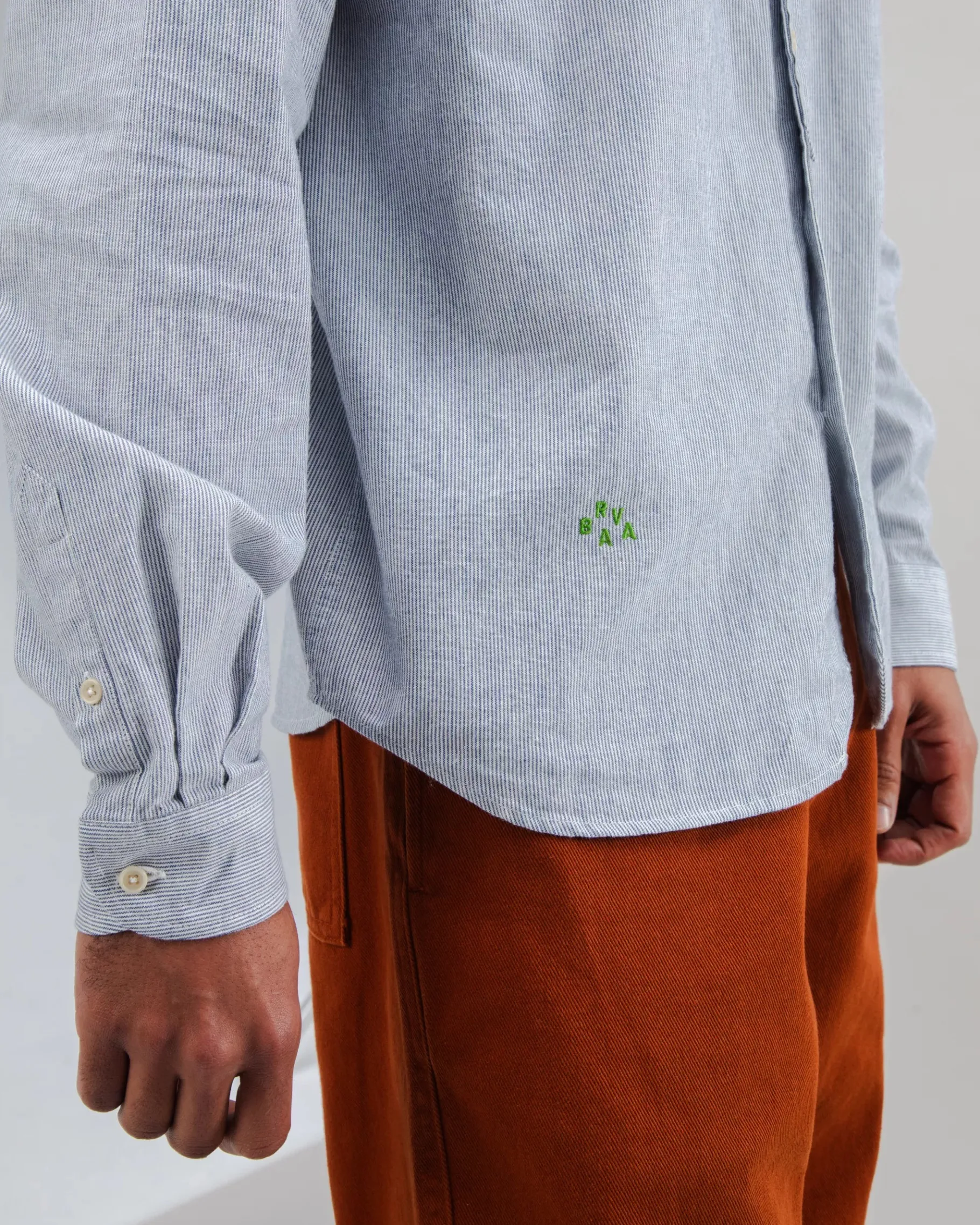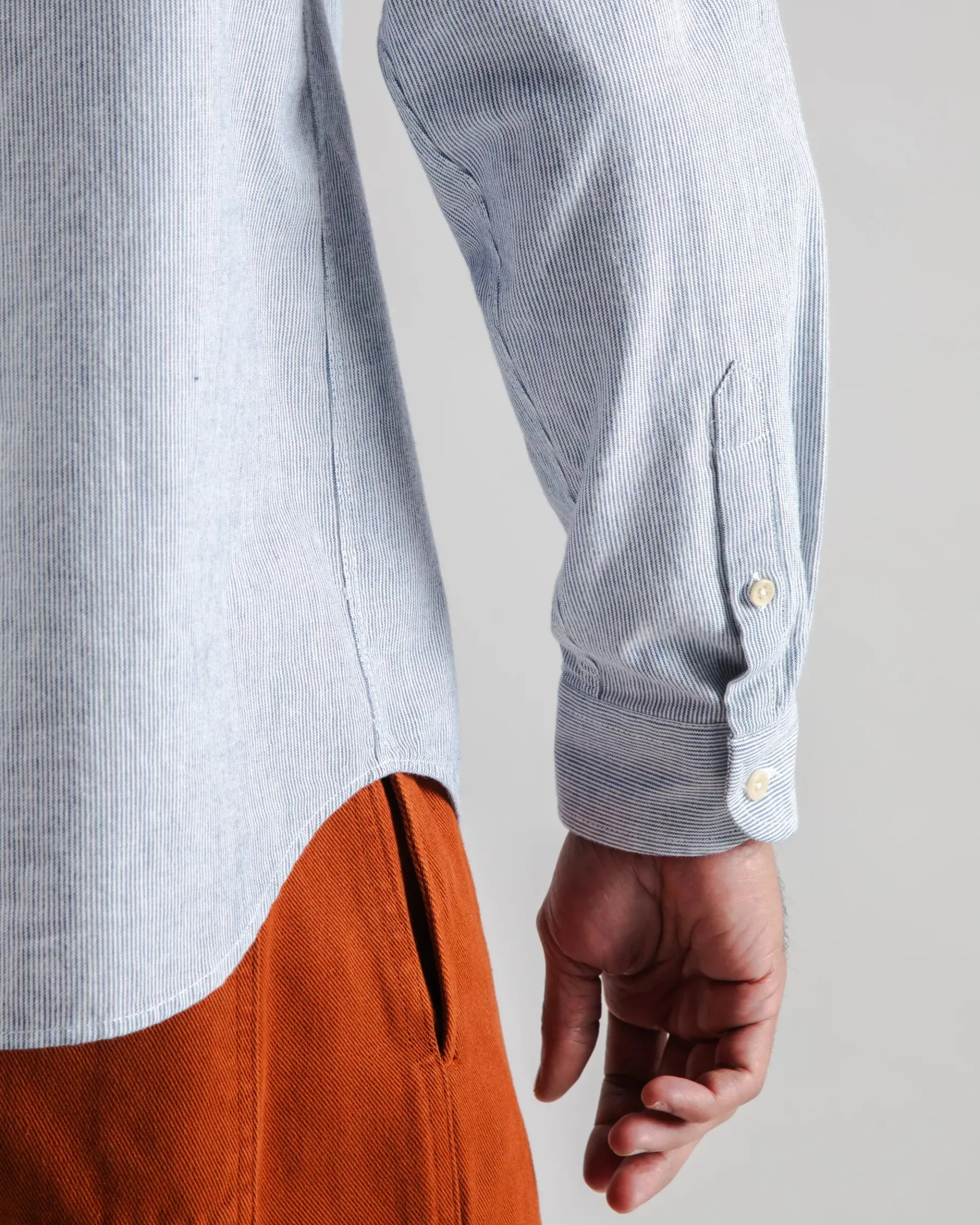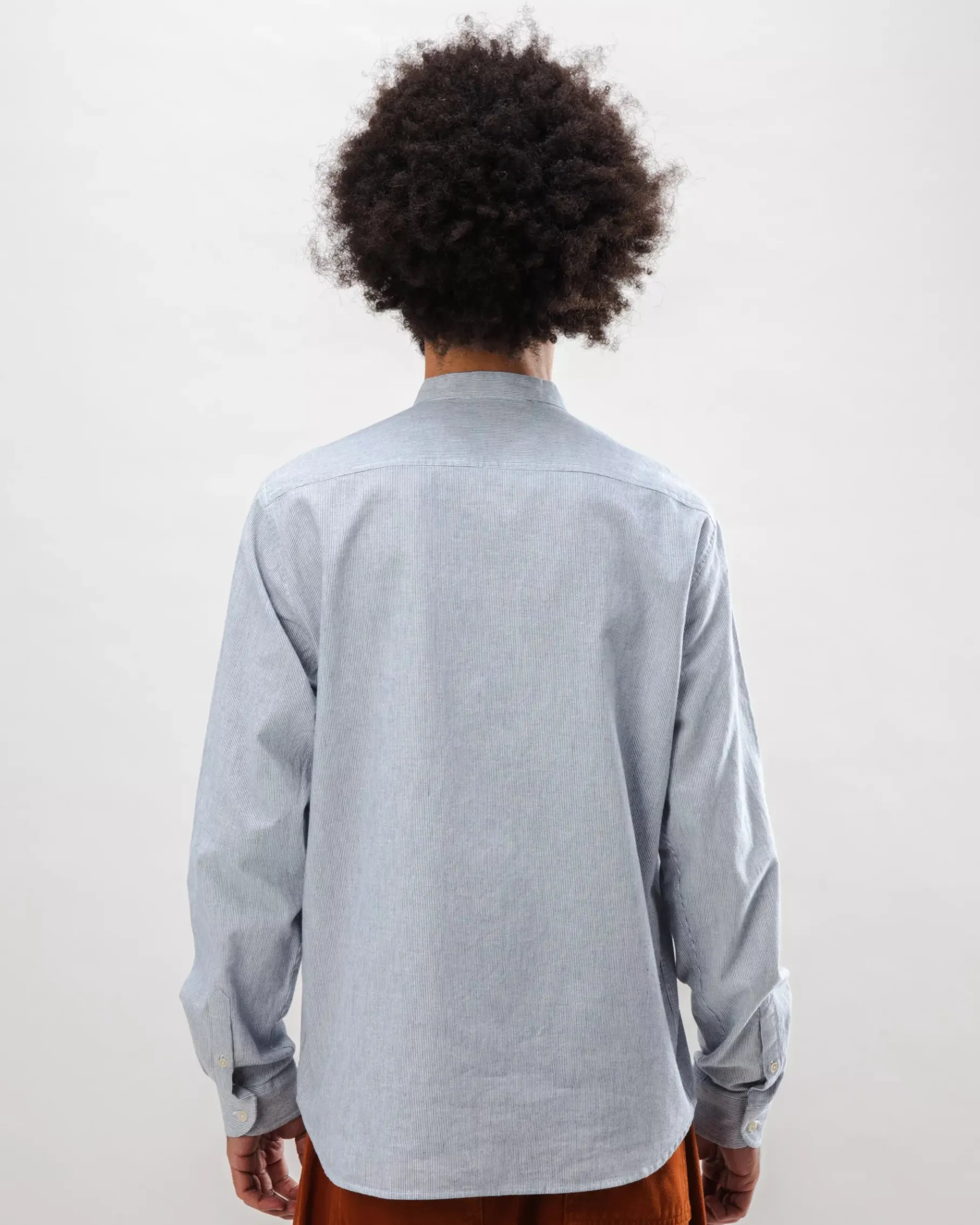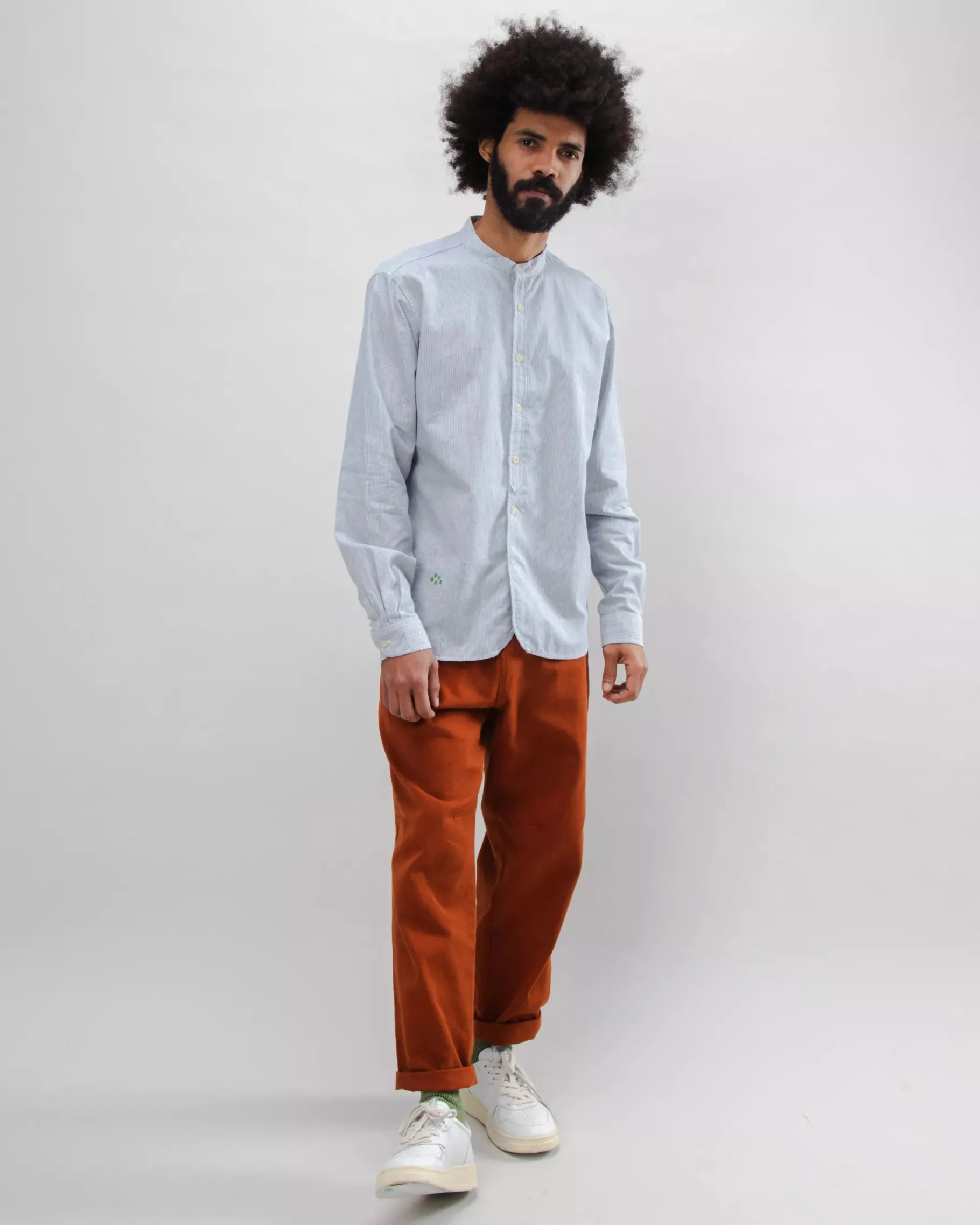 Long-sleeved mao shirt, with a regular fit and straight cut, featuring a decorative detail on the sleeve hem. It has a dropped armhole, shirt collar, and front closure with buttons. Ethically made from organic cotton.| Washing instructions