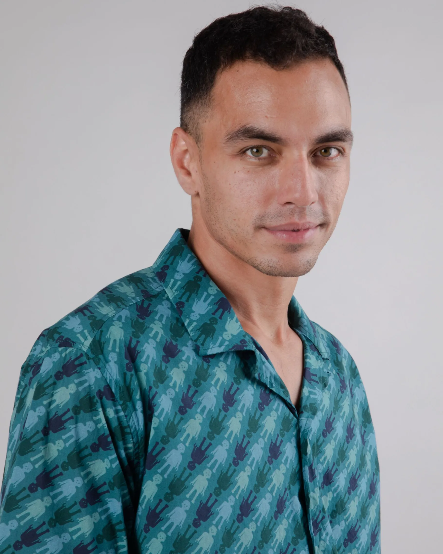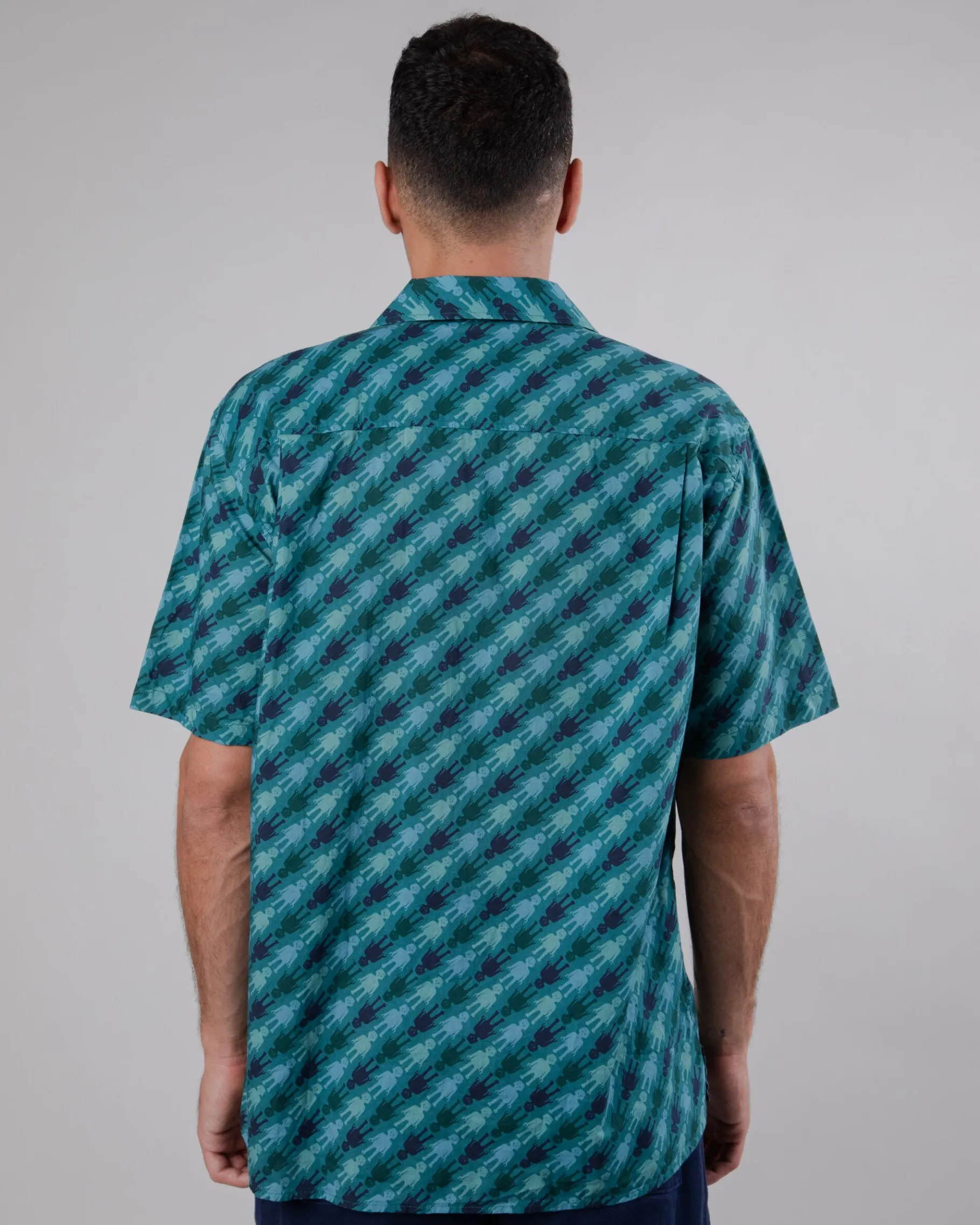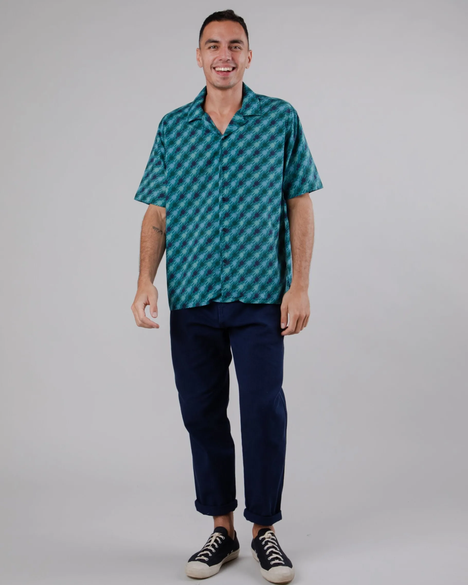 Locker geschnittenes, kurzärmeliges Aloha-Shirt mit Playmobil-Aufdruck. Es hat eine leicht überschnittene Schulter, einen geraden Saum, einen Reverskragen und einen Knopfverschluss. Ethisch hergestellt aus biologischer Baumwolle.| Waschhinweise