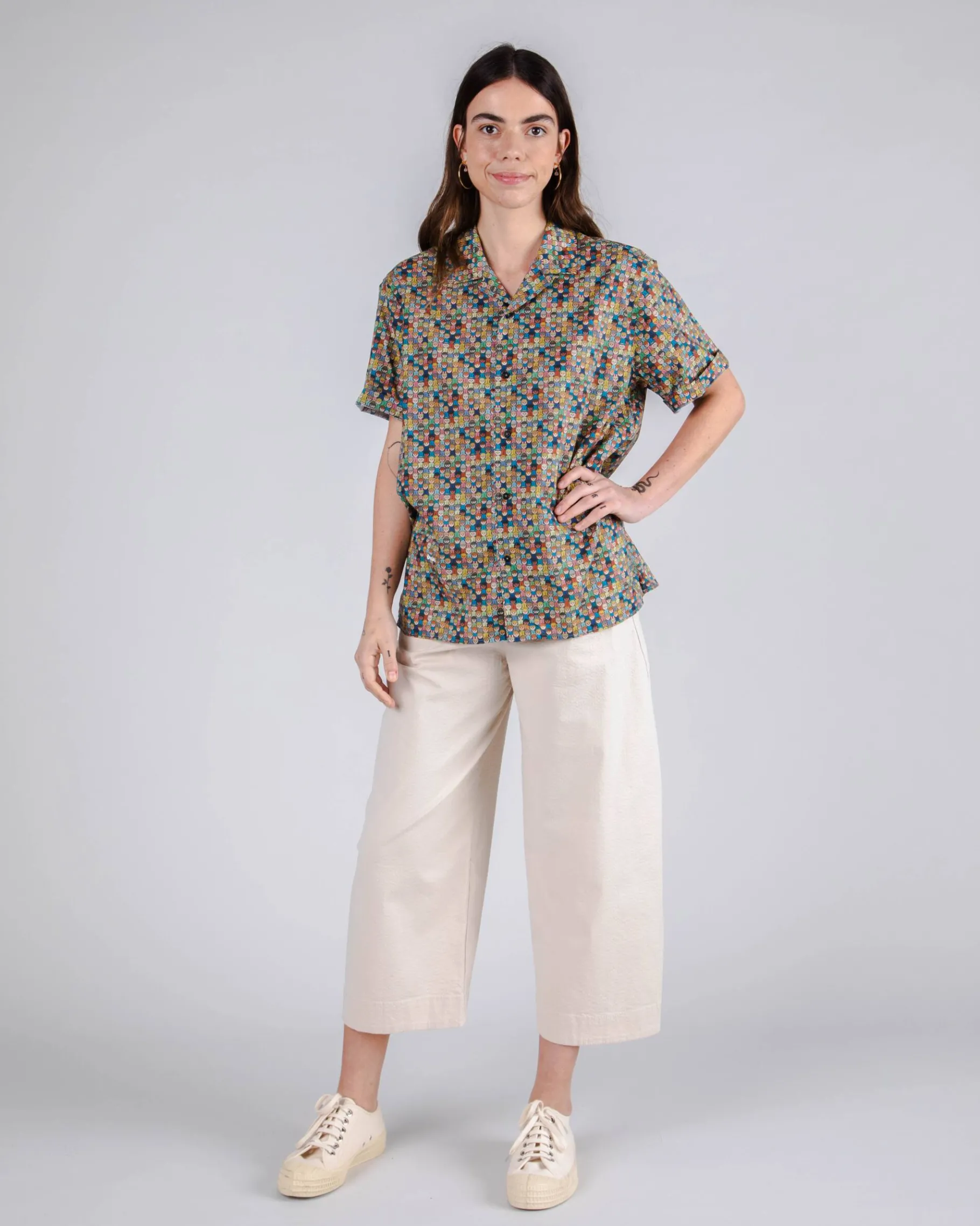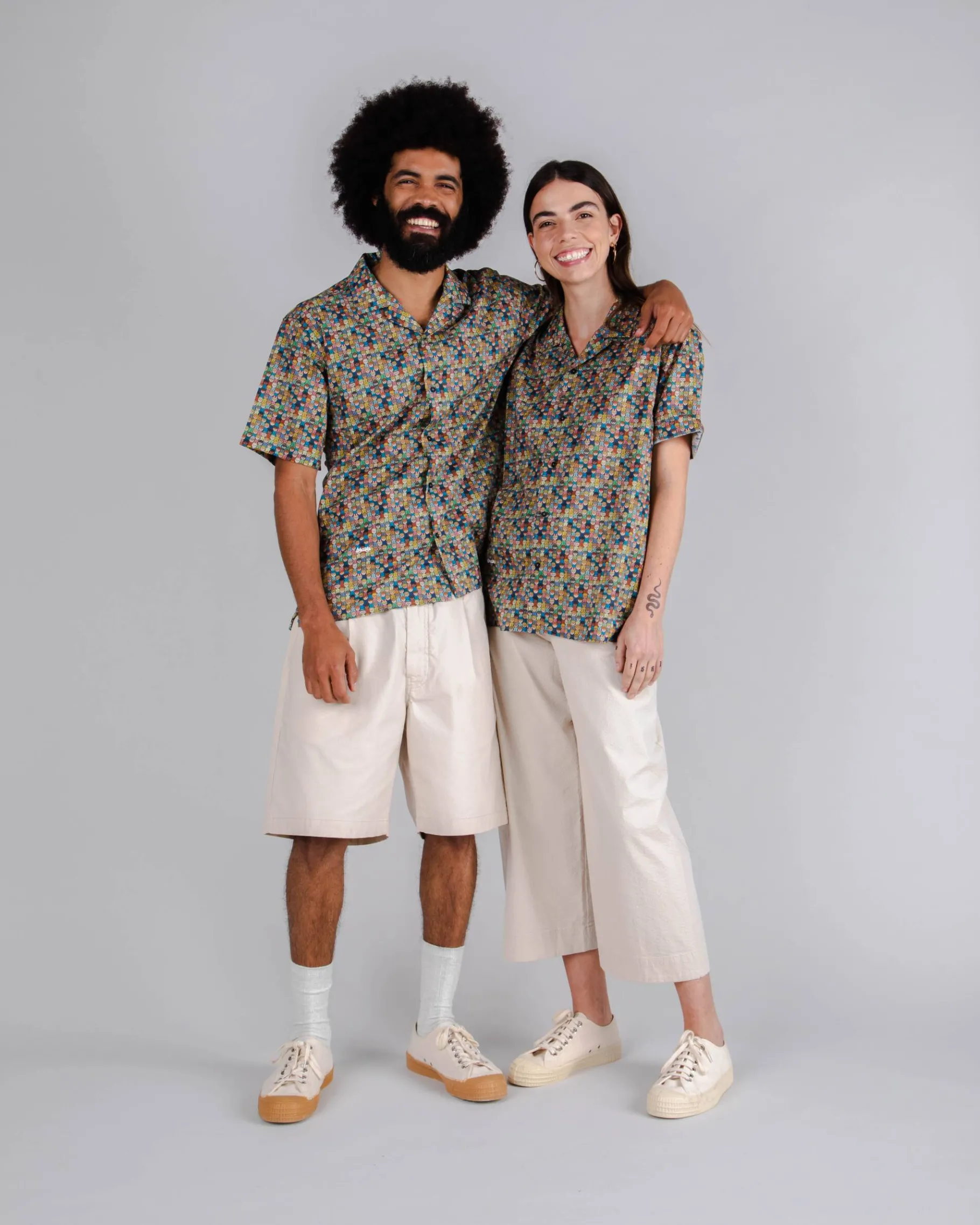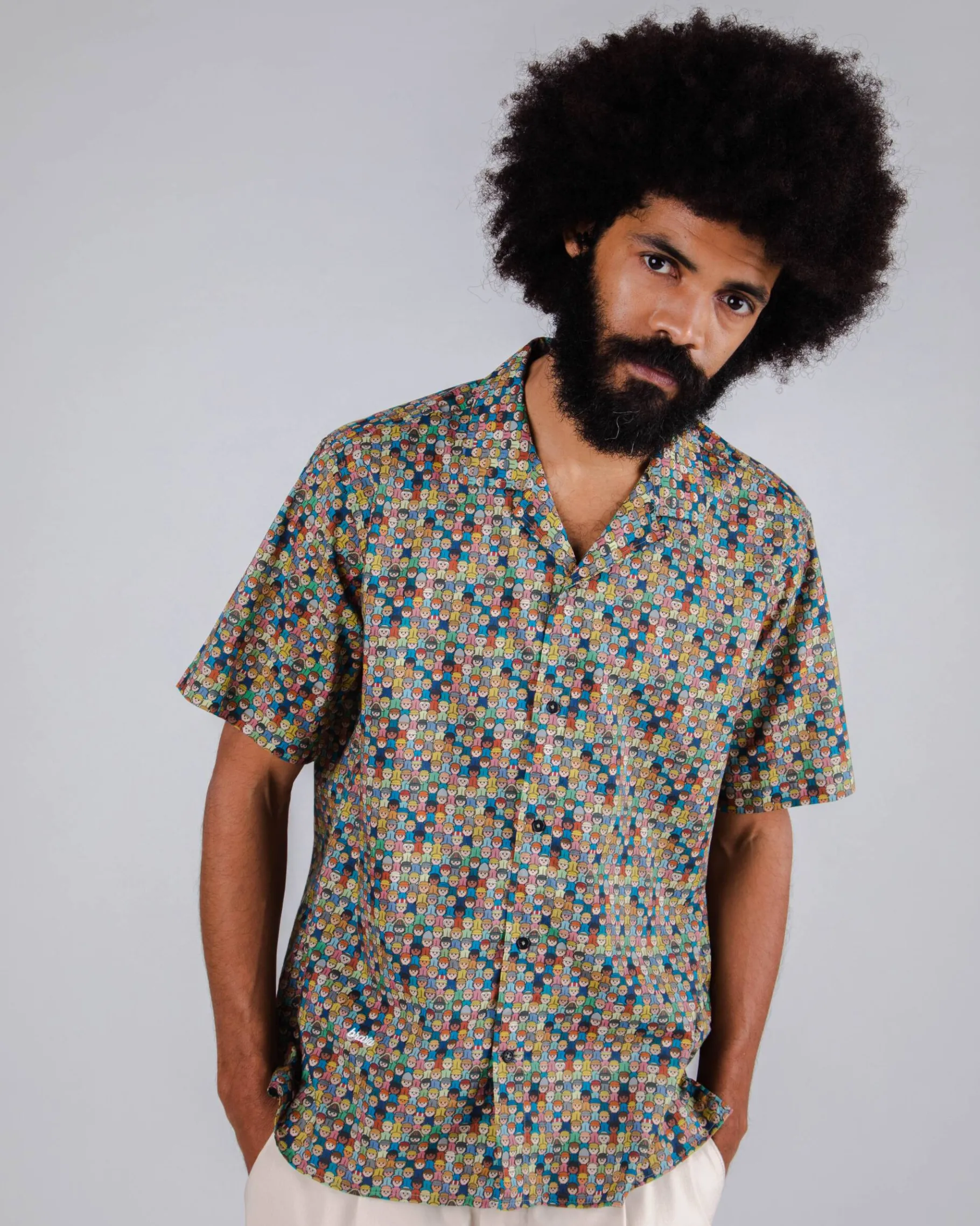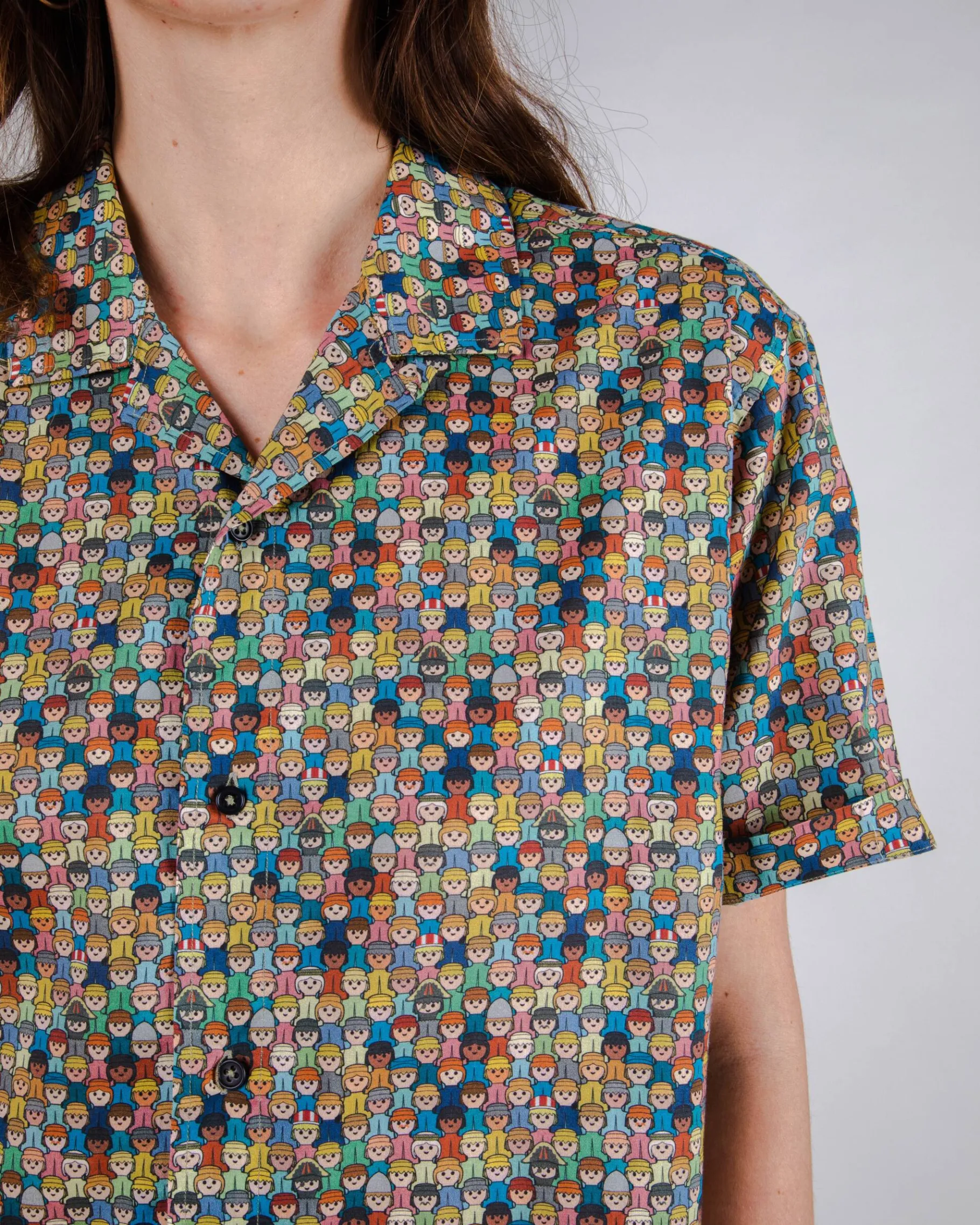 Locker geschnittenes, kurzärmeliges Aloha-Shirt mit Playmobil-Aufdruck. Es hat eine leicht überschnittene Schulter, einen geraden Saum, einen Reverskragen und einen Knopfverschluss. Ethisch hergestellt aus biologischer Baumwolle.| Waschhinweise