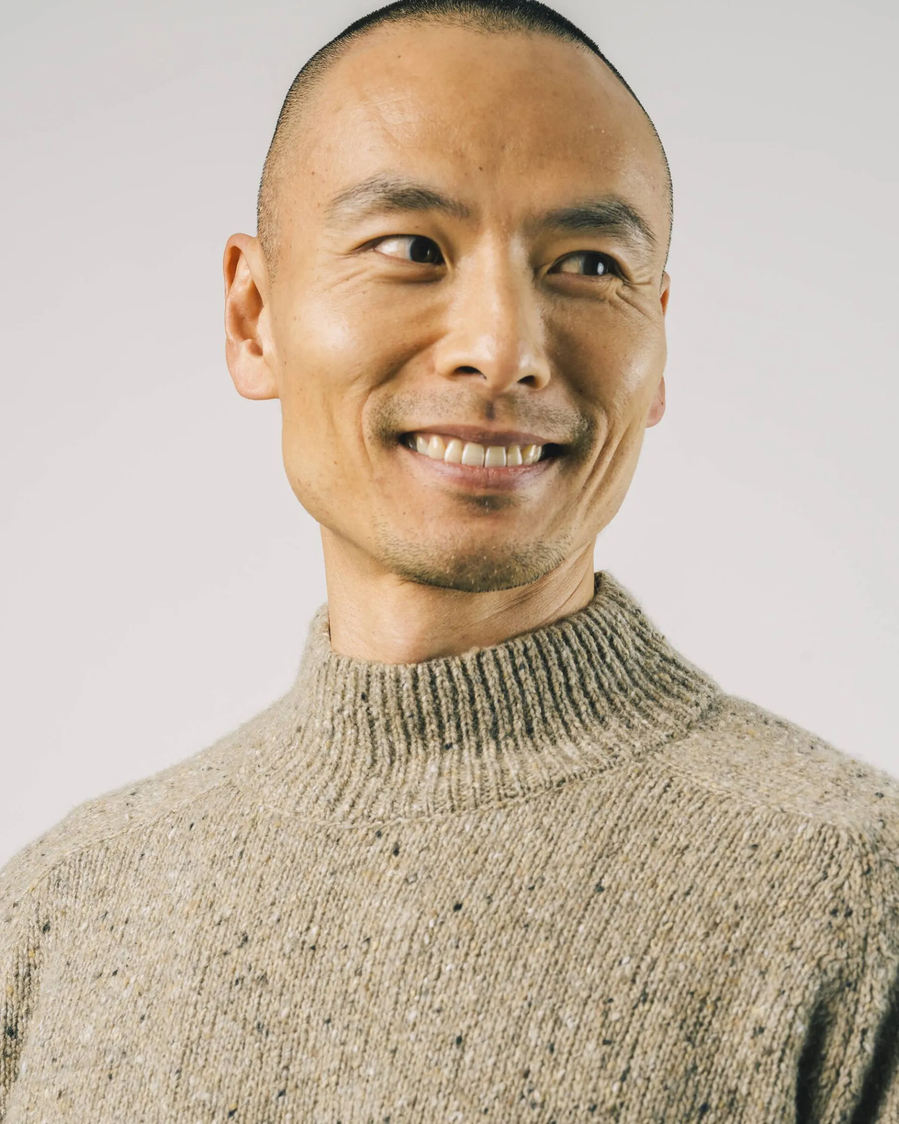 - Vincent ist 1,82m groß und trägt Größe M – Dieser Pullover ist Small Fit