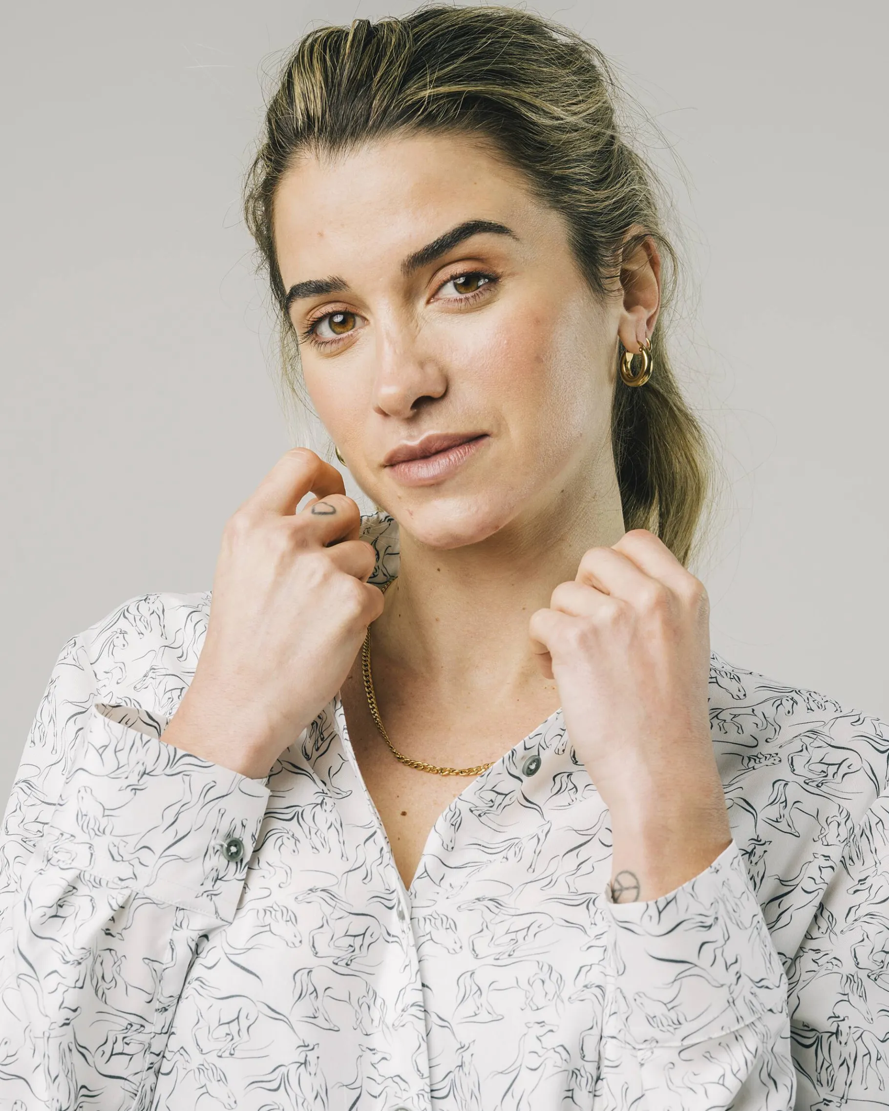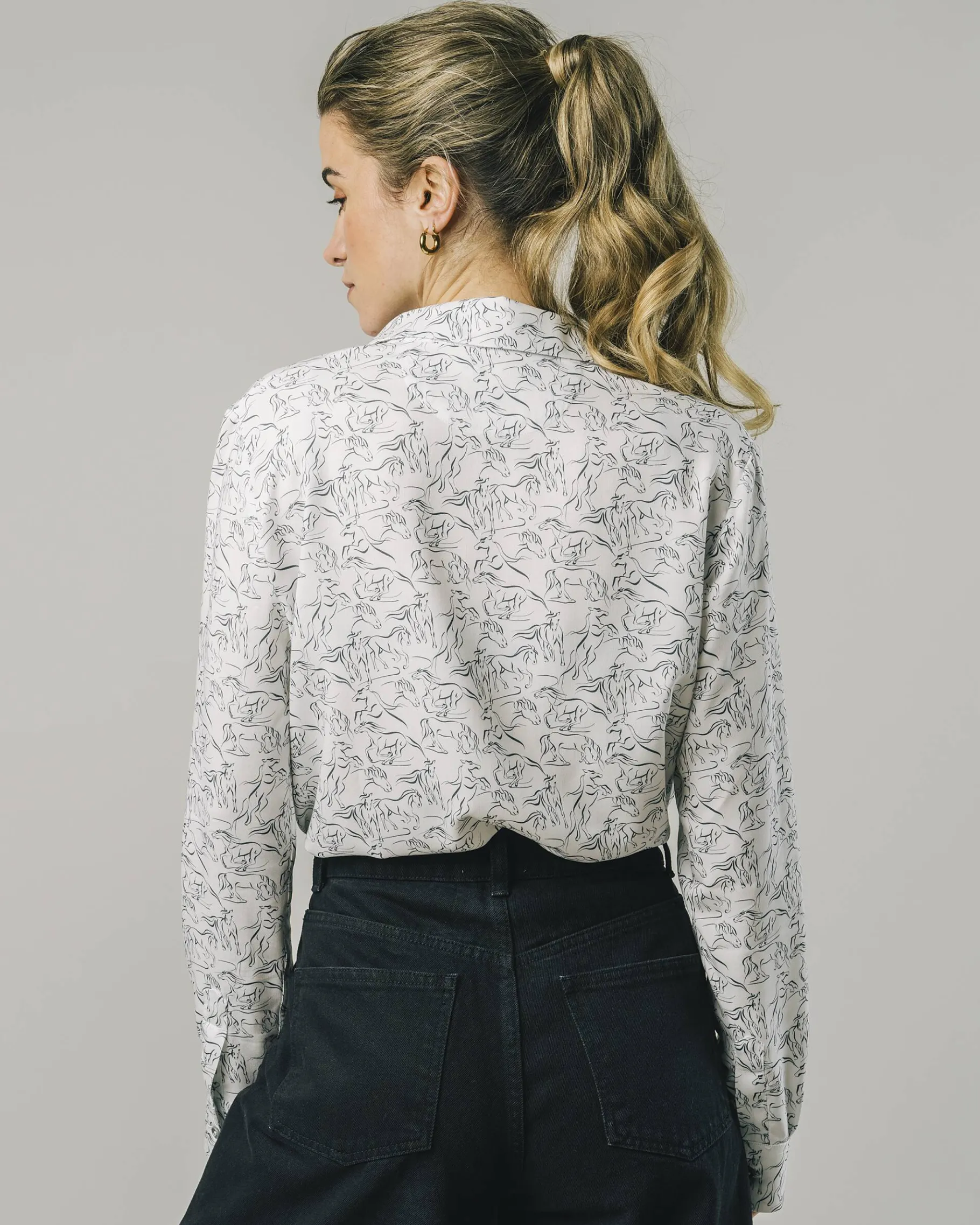 Vielleicht sind uns bei diesem Design die Pferde durchgegangen, doch das seidig weiche Material in zeitlosem Ecru verleiht der Bluse im Nu eine zurückhaltende Eleganz.