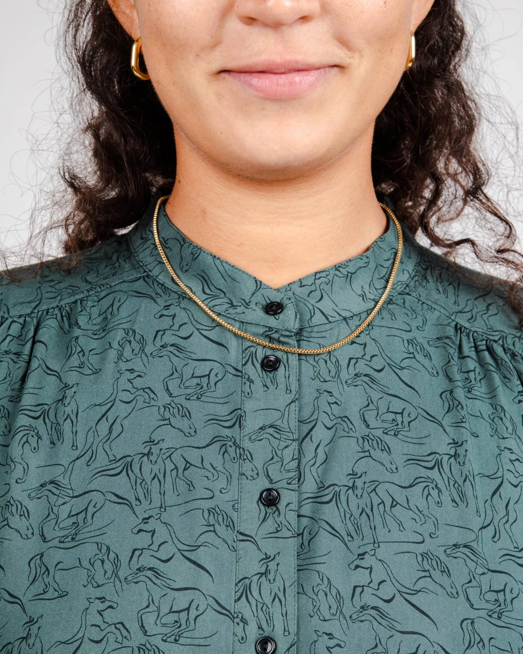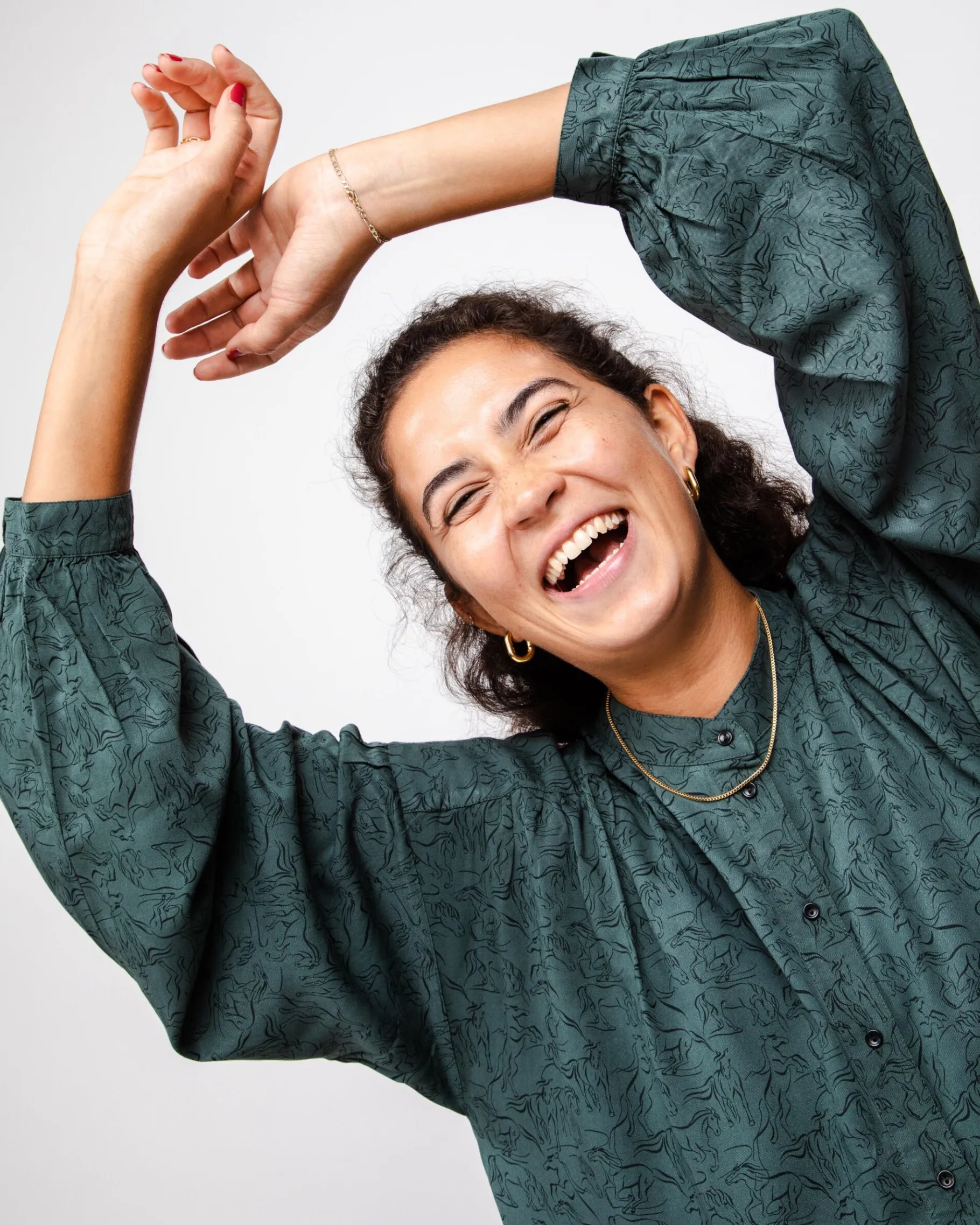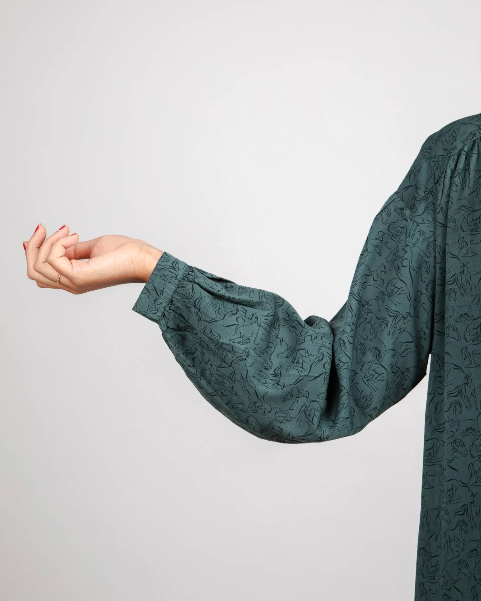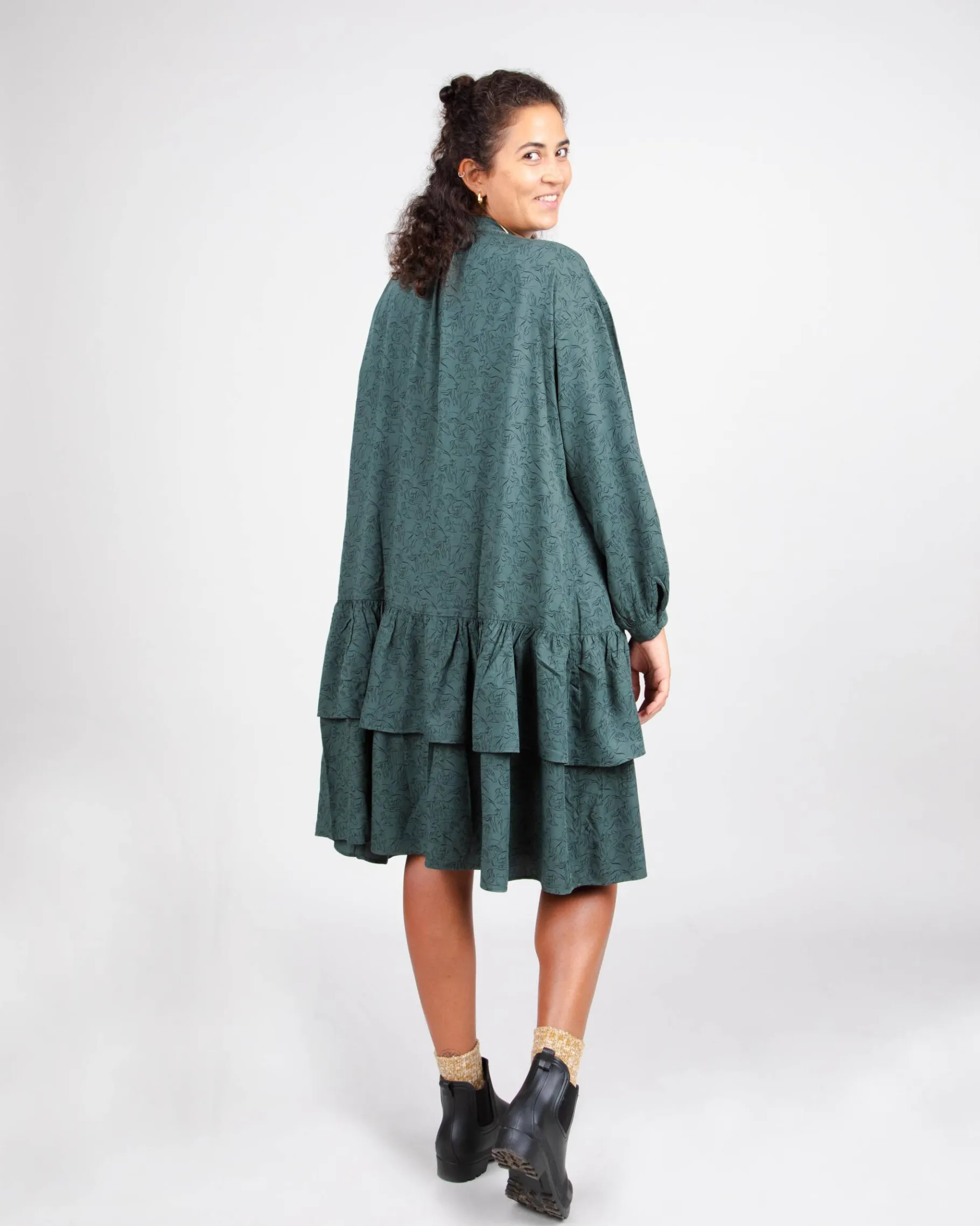 Dieses Blusenkleid in Midi-Länge und Oversized-Schnitt lässt Träume wahr werden! Aus seidigweicher Ecovero-Viskose gefertigt, kombiniert es ein filigranes Muster, ein zeitloses Flaschengrün und einen Boho-inspiriertem Volant.