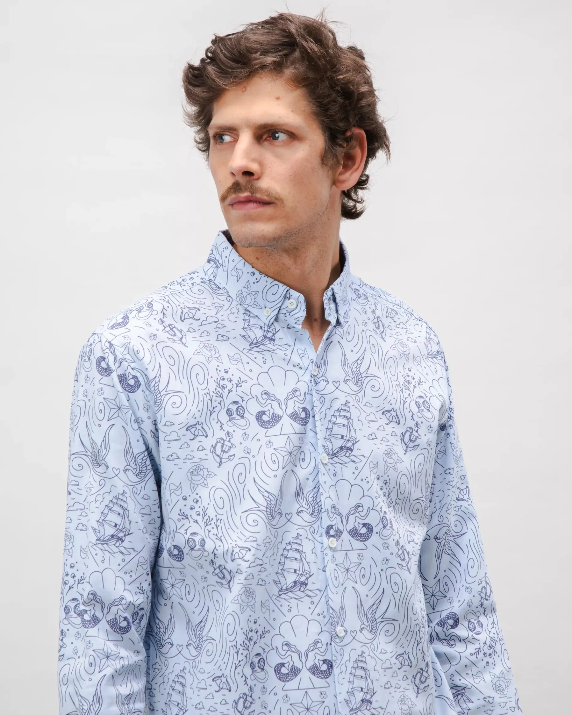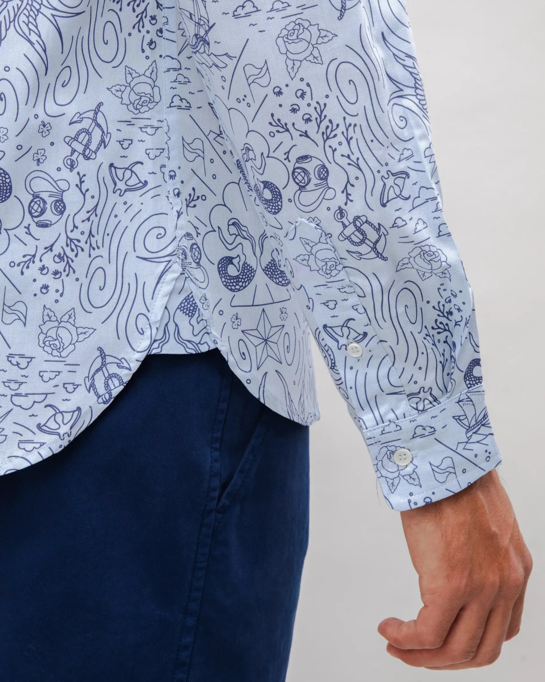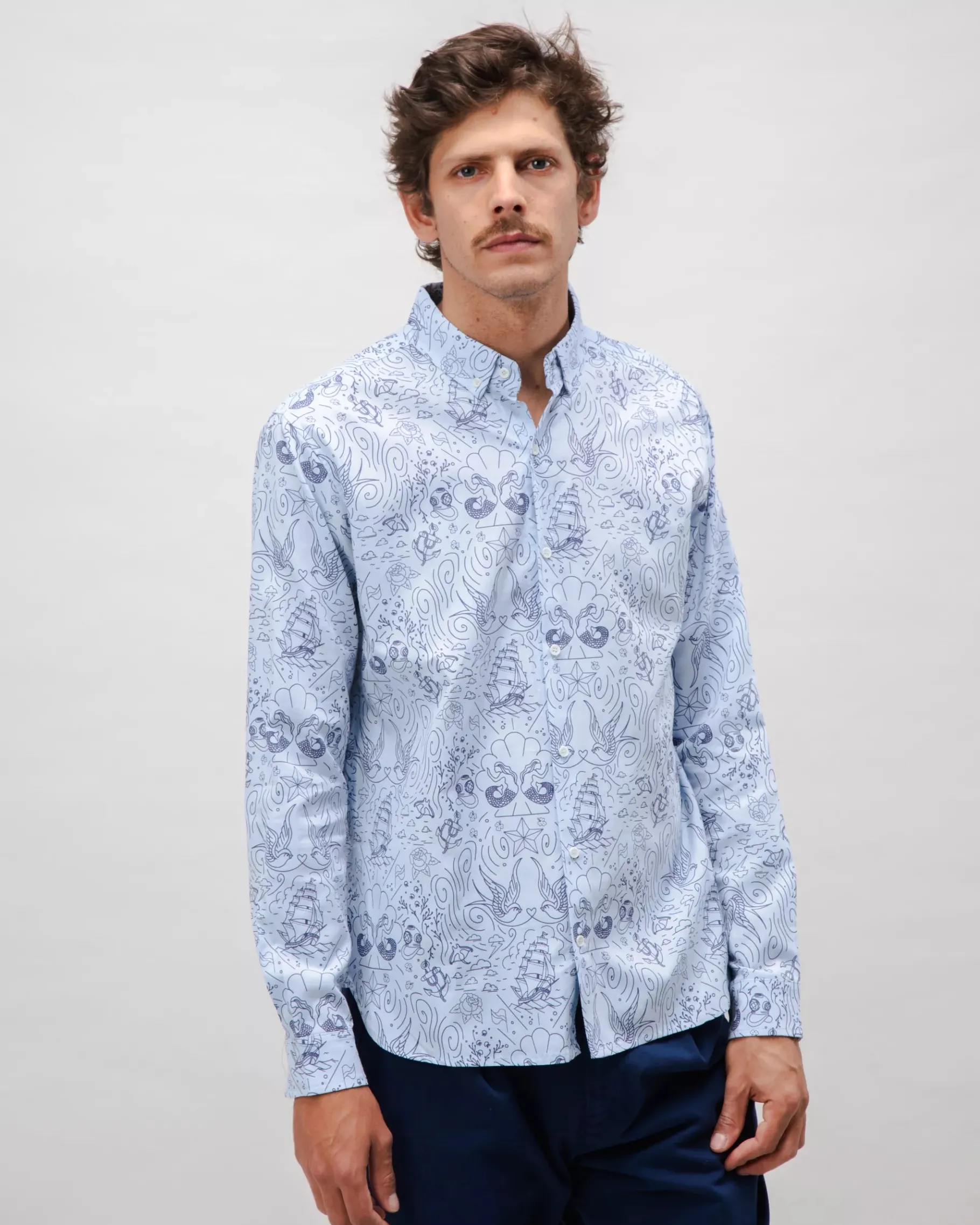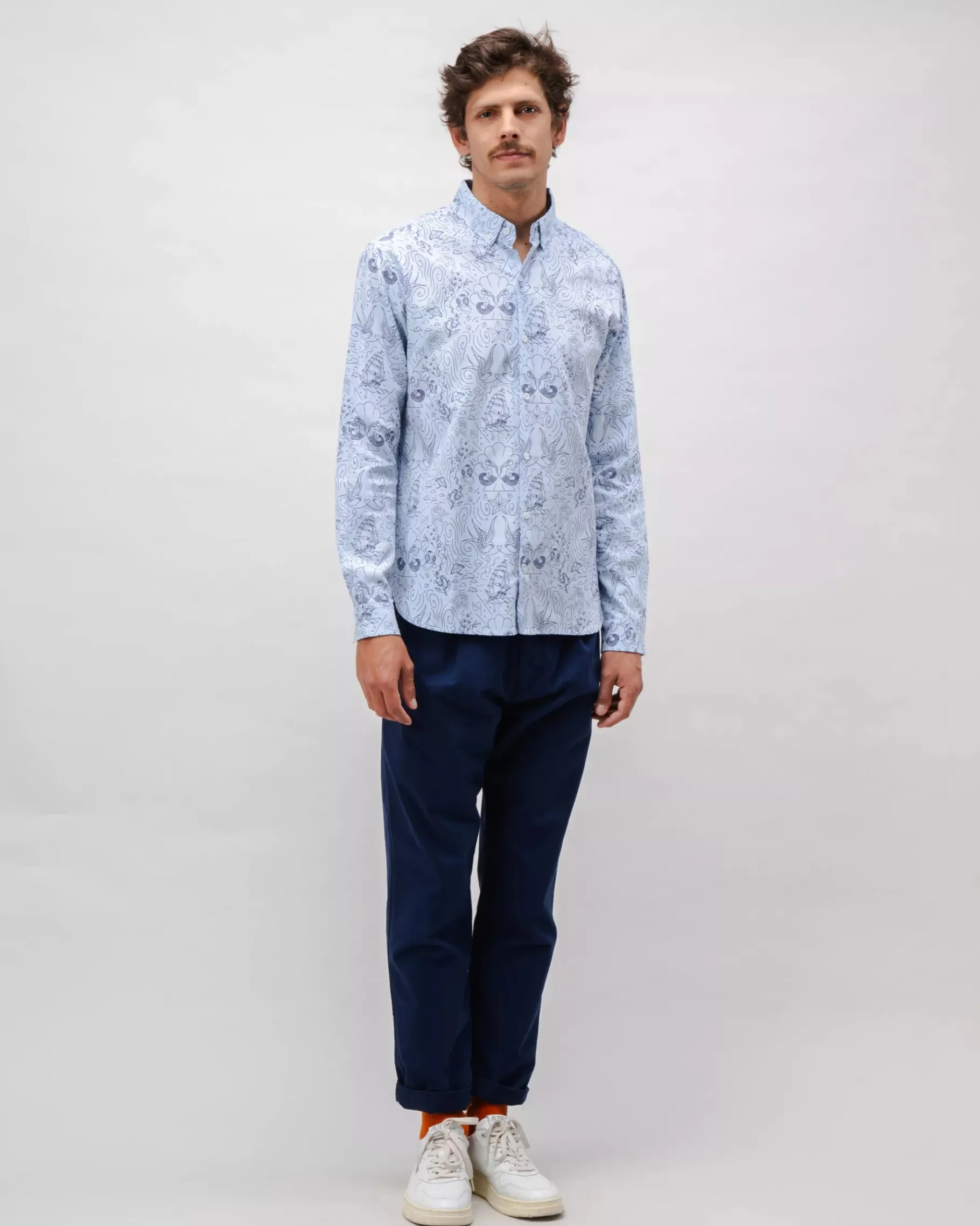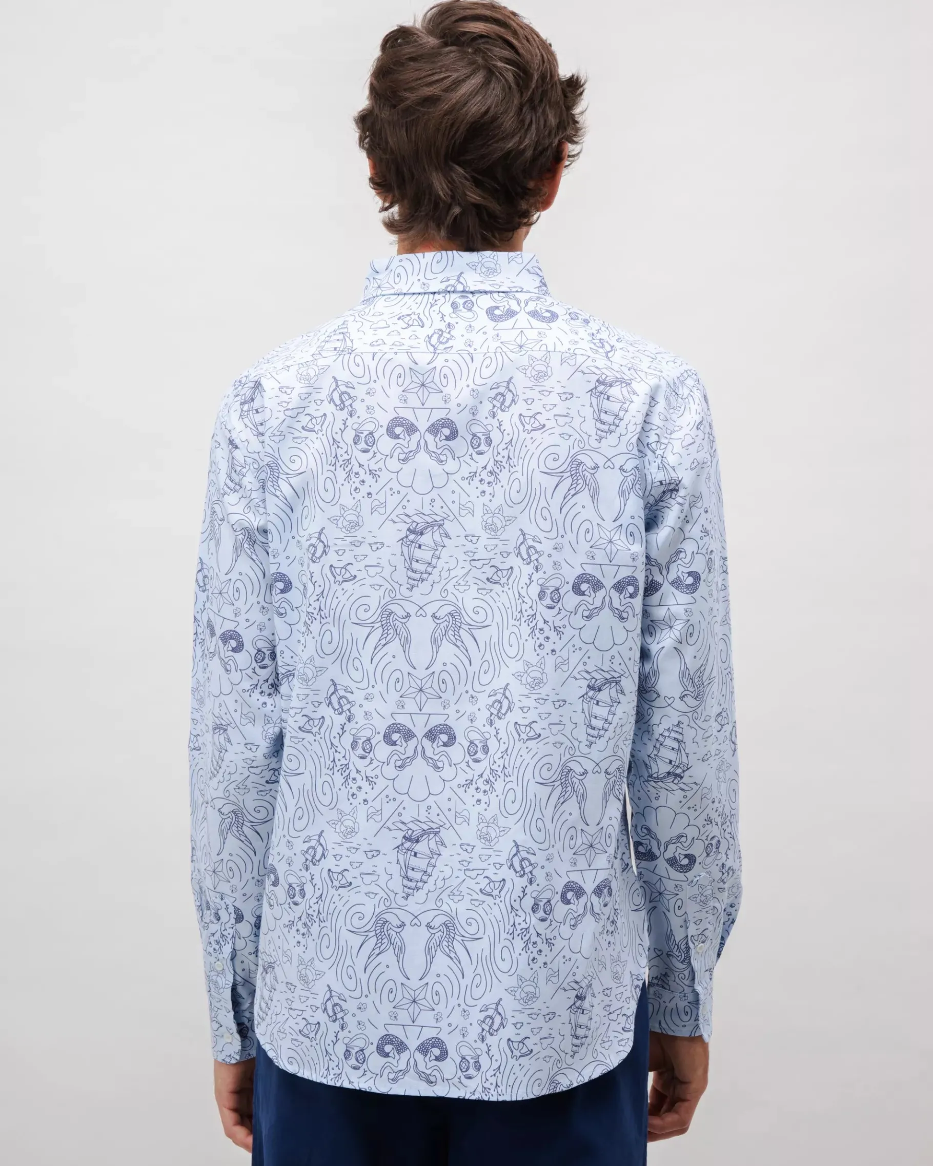 Long-sleeved printed shirt, with a regular fit and straight cut, featuring a decorative detail on the sleeve hem. It has a dropped armhole, shirt collar, and front closure with buttons. Ethically made from organic cotton.| Washing instructions