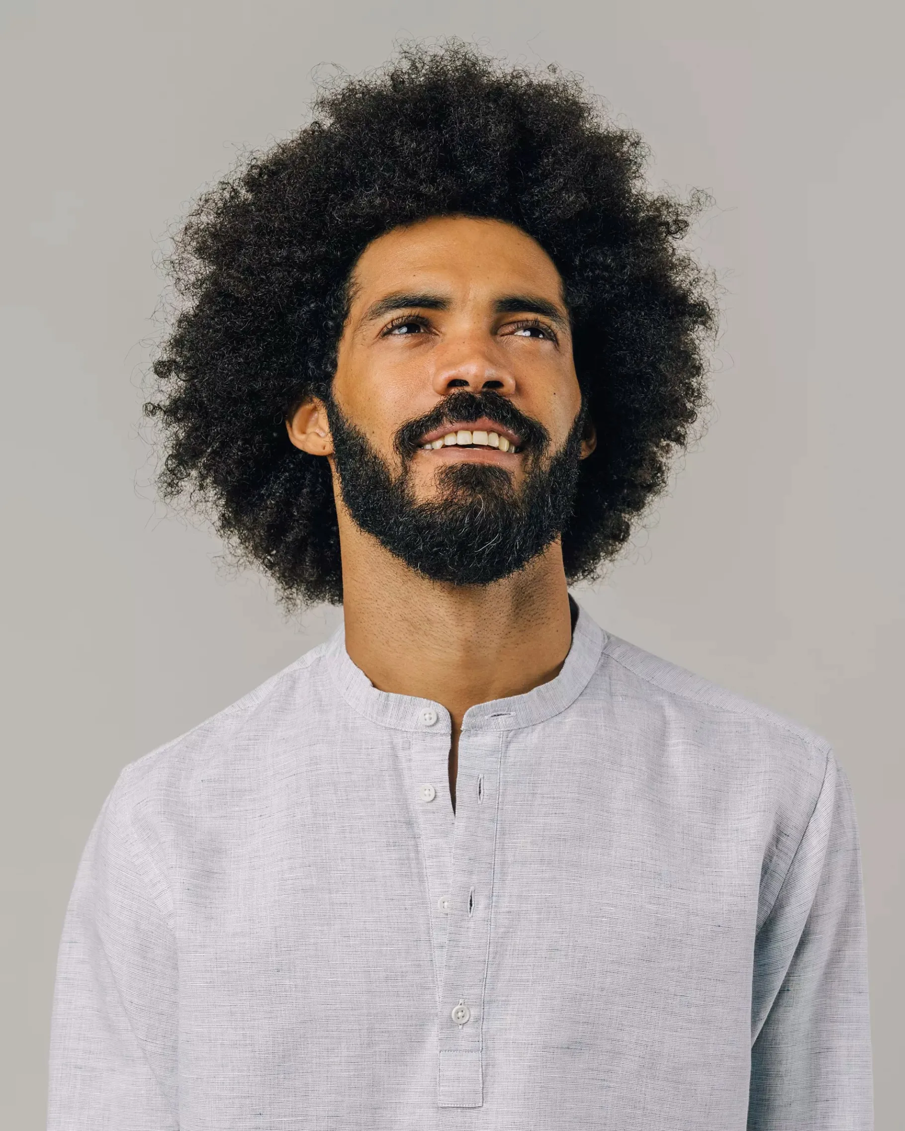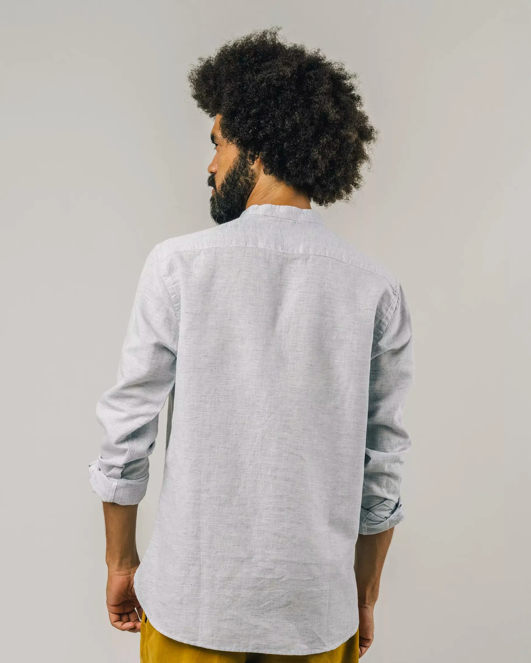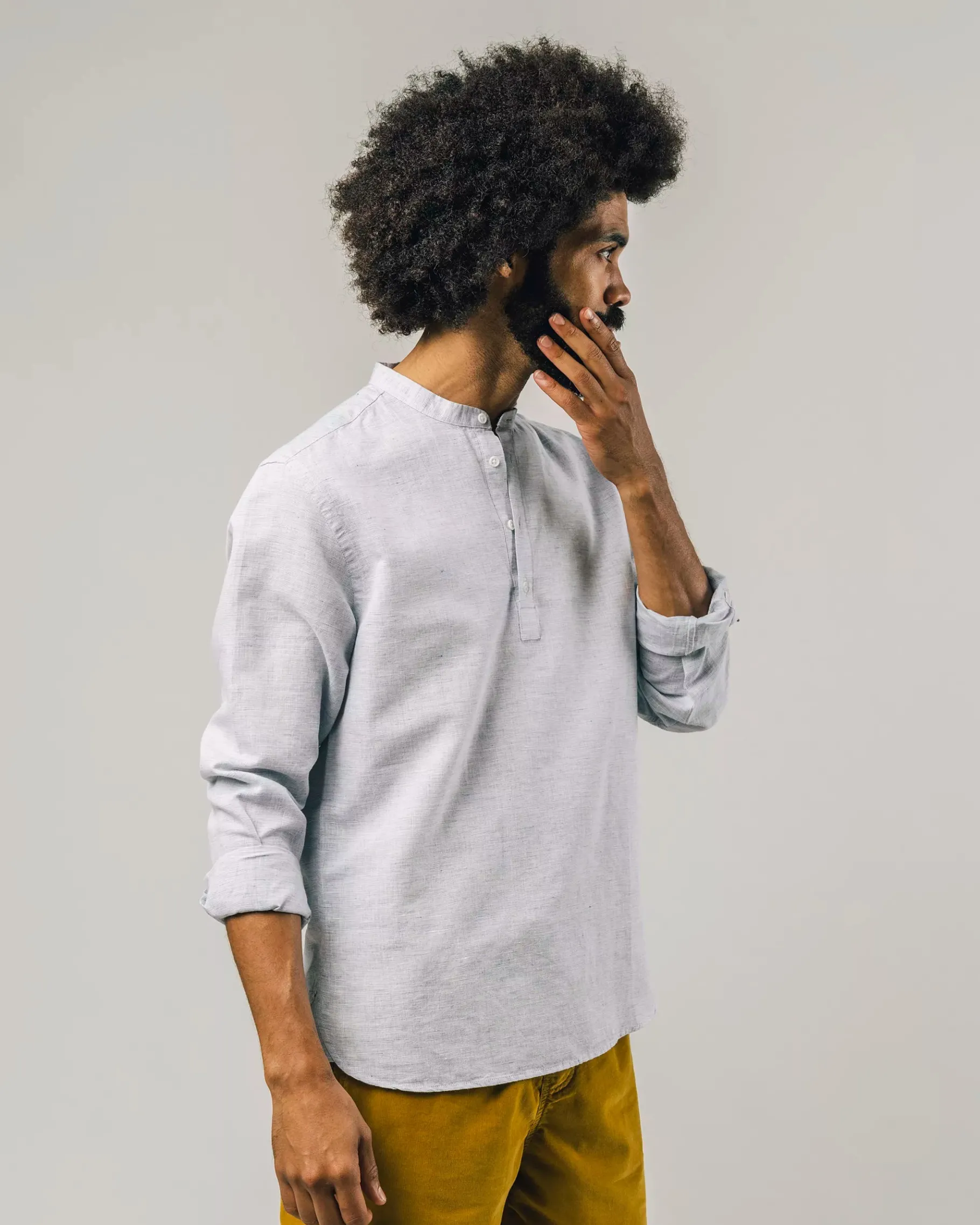 Regular fit long sleeve shirt with an embroidered detail. It features a straight hem, and a mao collar. It features a polo button closure, sleeves with cuffs, and a button-down collar. Ethically made from organic cotton and linen.| Washing instructions