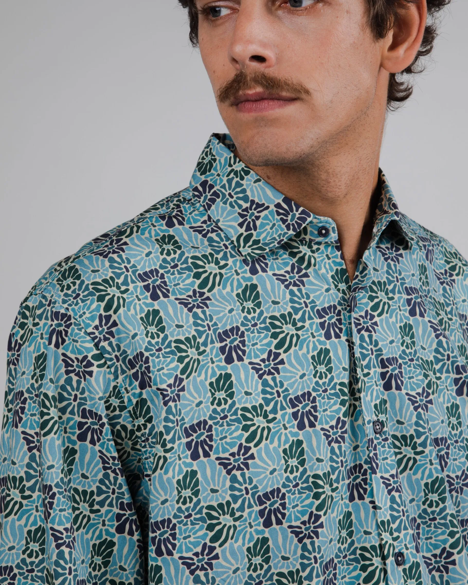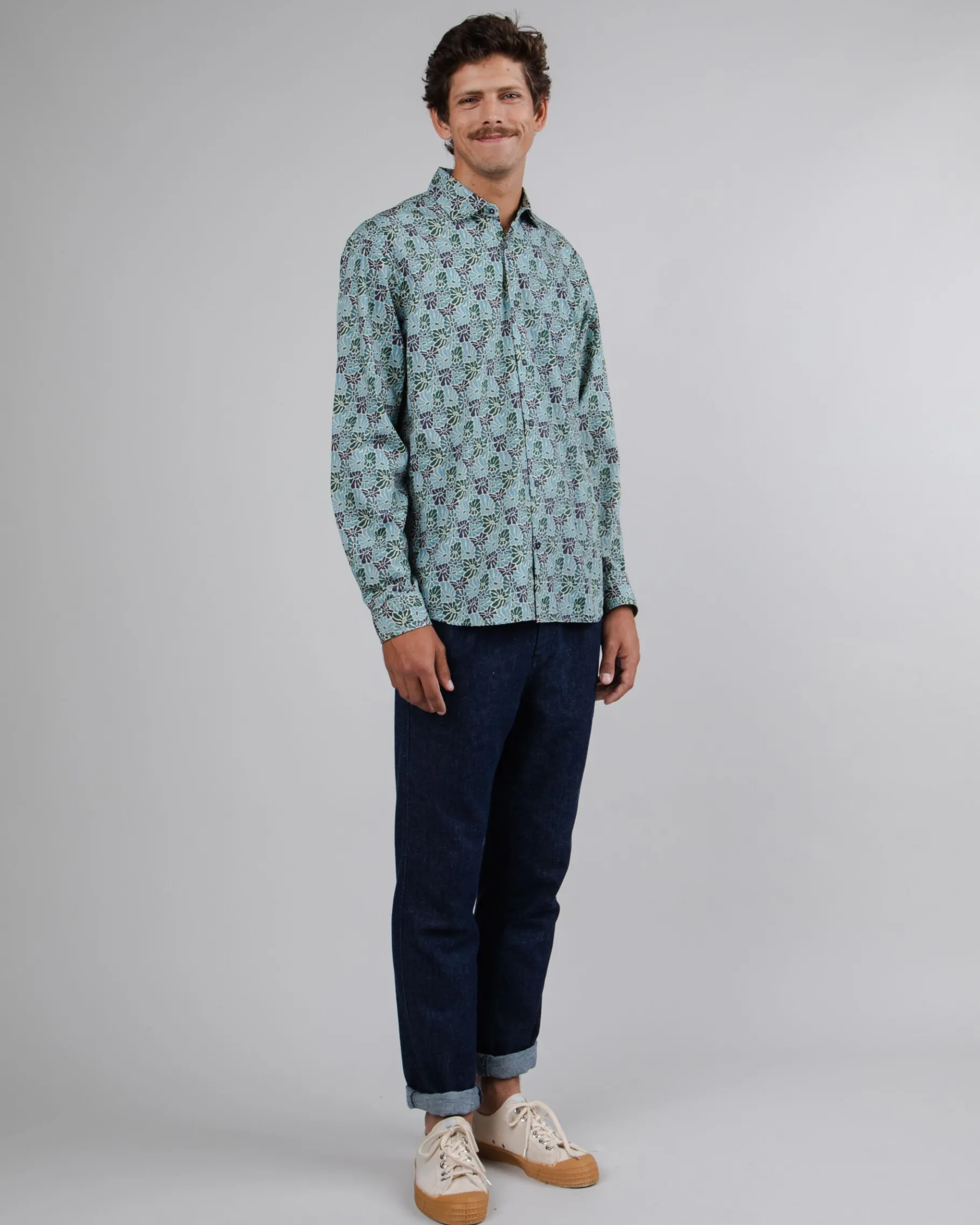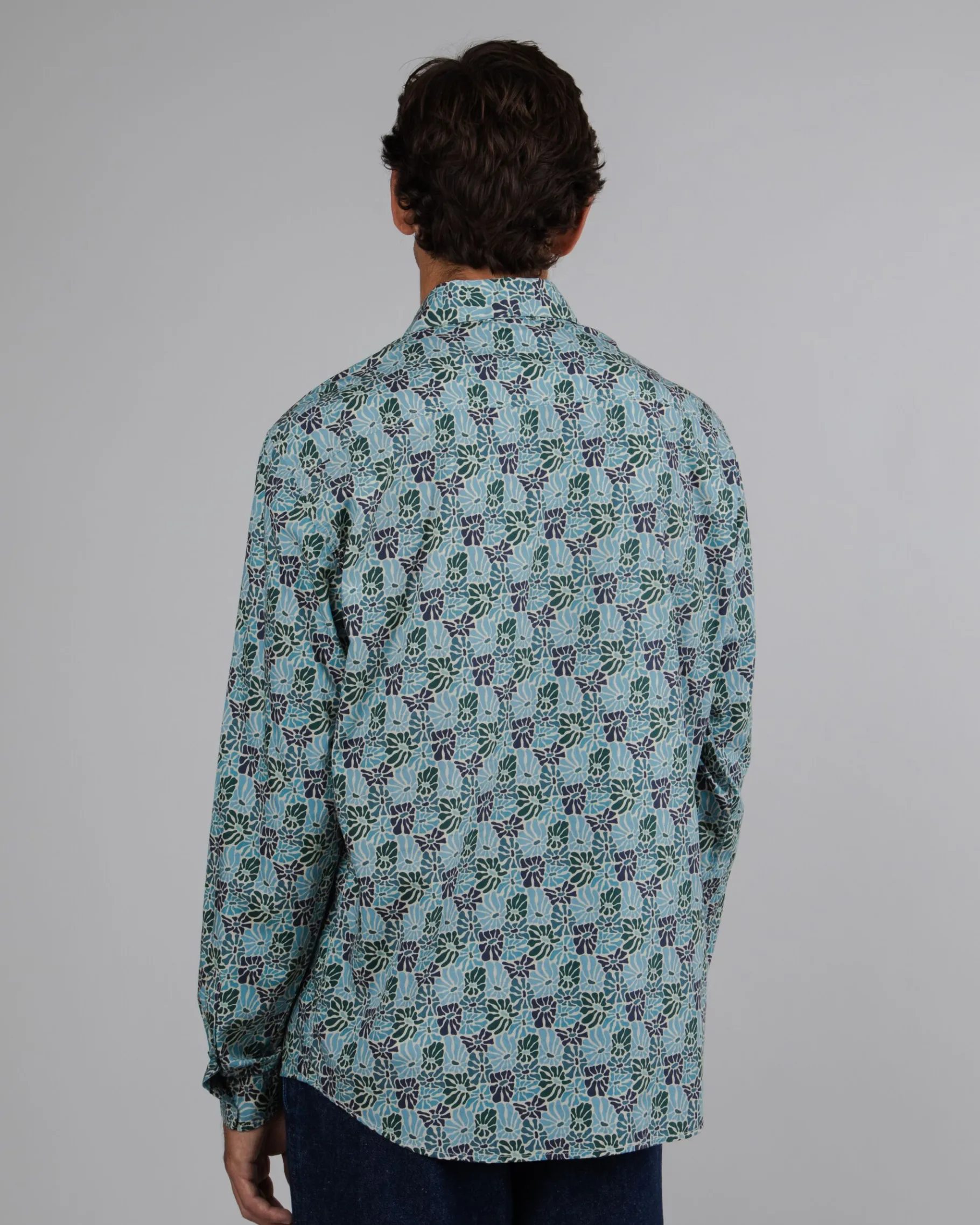 Long-sleeved printed shirt, with a regular fit and straight cut, featuring a decorative detail on the sleeve hem. It has a dropped armhole, shirt collar, and front closure with buttons. Ethically made from organic cotton.| Washing instructions