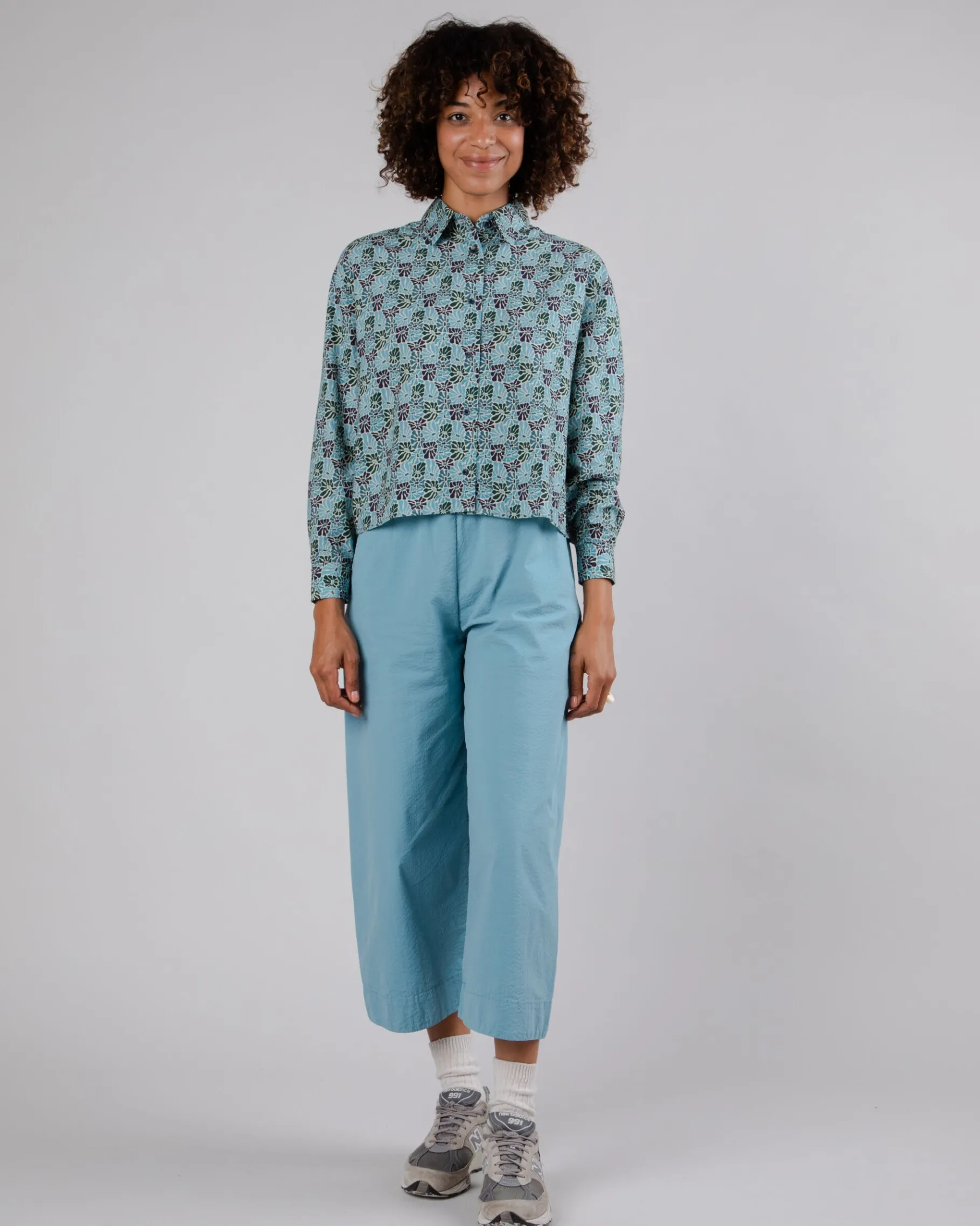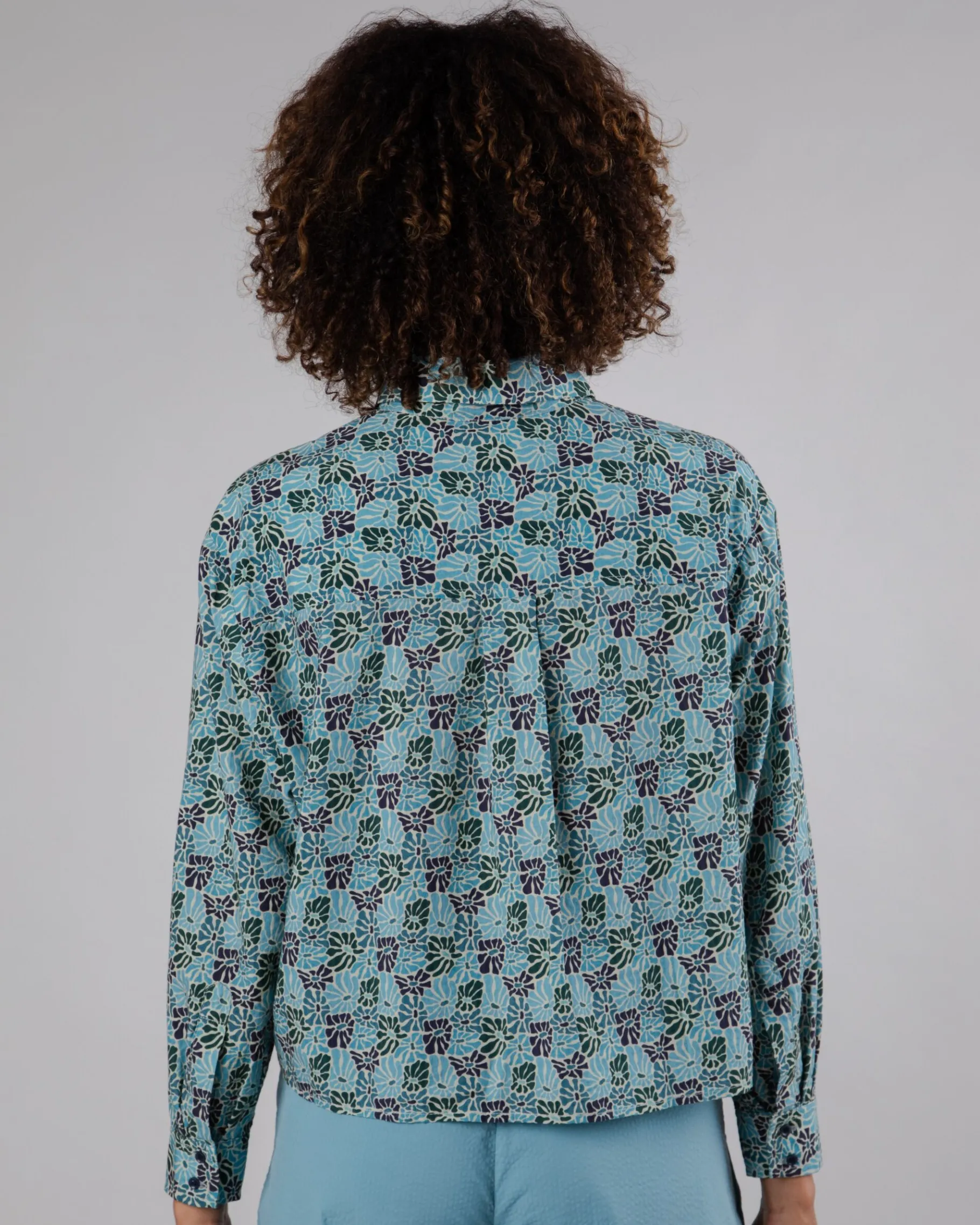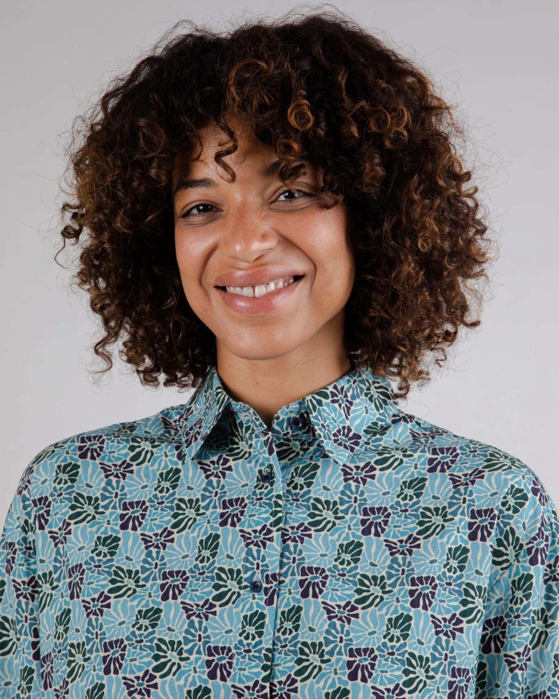Kurzärmelige Bluse in normaler Passform mit geradem Schnitt, normalem Kragen und leicht überschnittener Schulter. Sie hat einen dekorativen Ärmelsaum und keinen Ärmelausschnitt. Ethisch hergestellt aus Bio-Baumwolle und nachhaltiger Viskose.| Waschhinweise