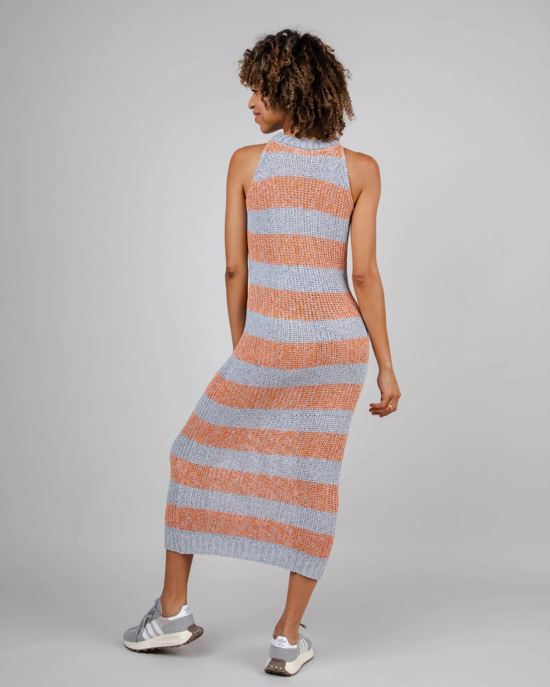 Langes Strick-Kleid mit breiten Trägern aus besonders weichem Stoff. Etwas weiterer Kragen und seitlichem Beinschlitz für besonders viel Komfort. Aus Bio-Baumwoll Mix und unter fairen Bedingungen hergestellt.| Waschhinweise