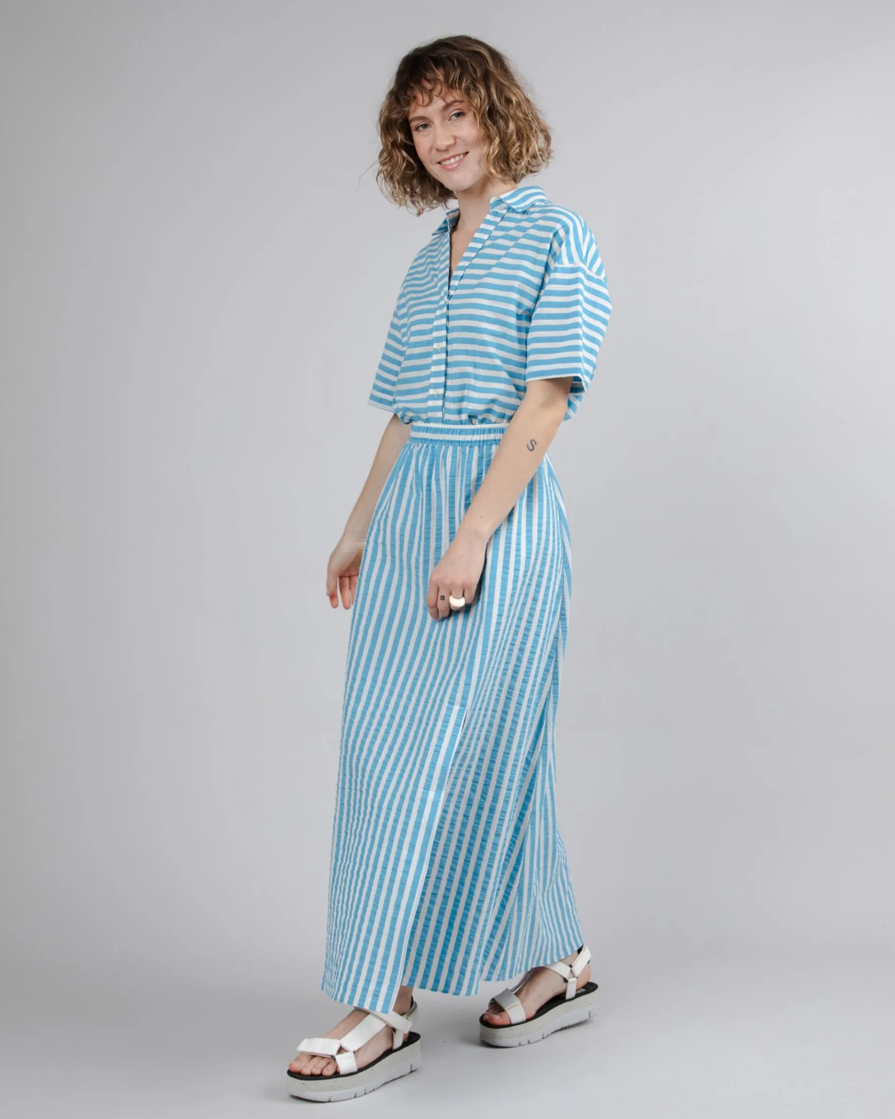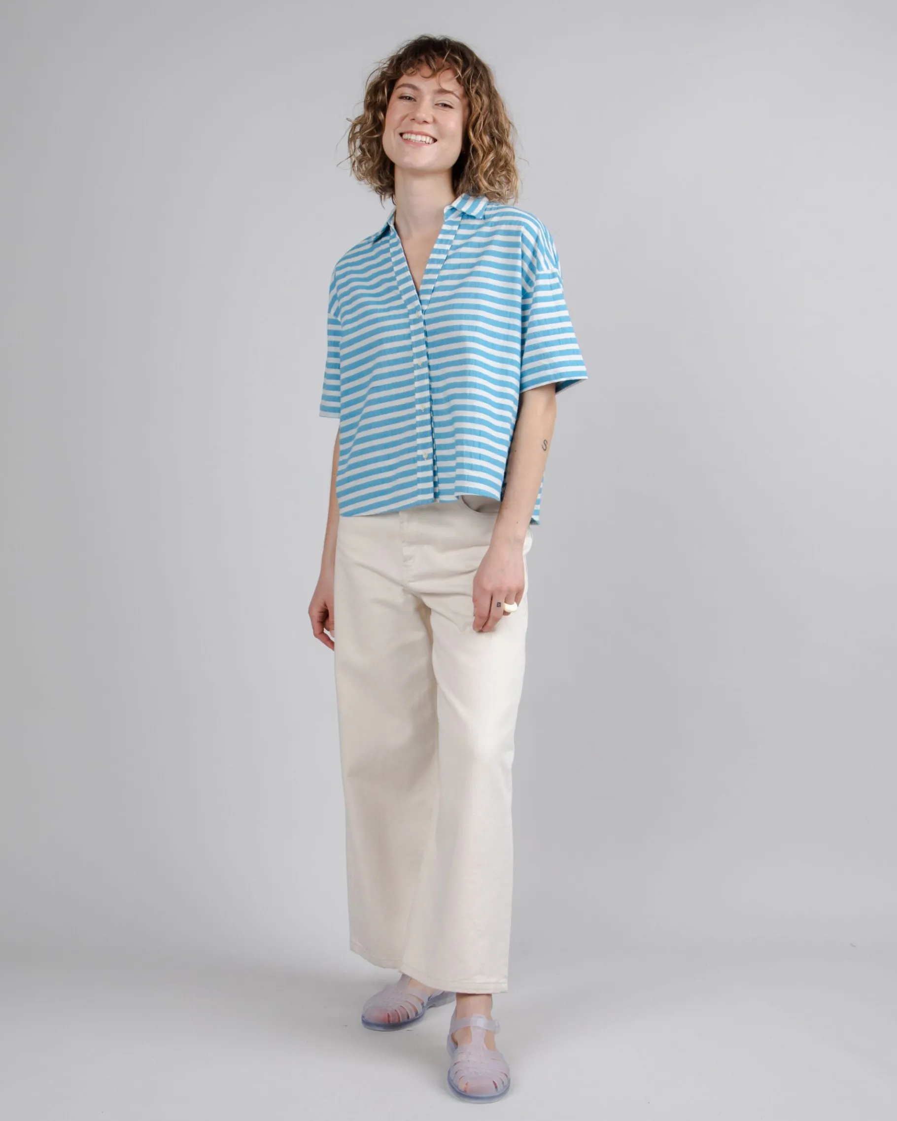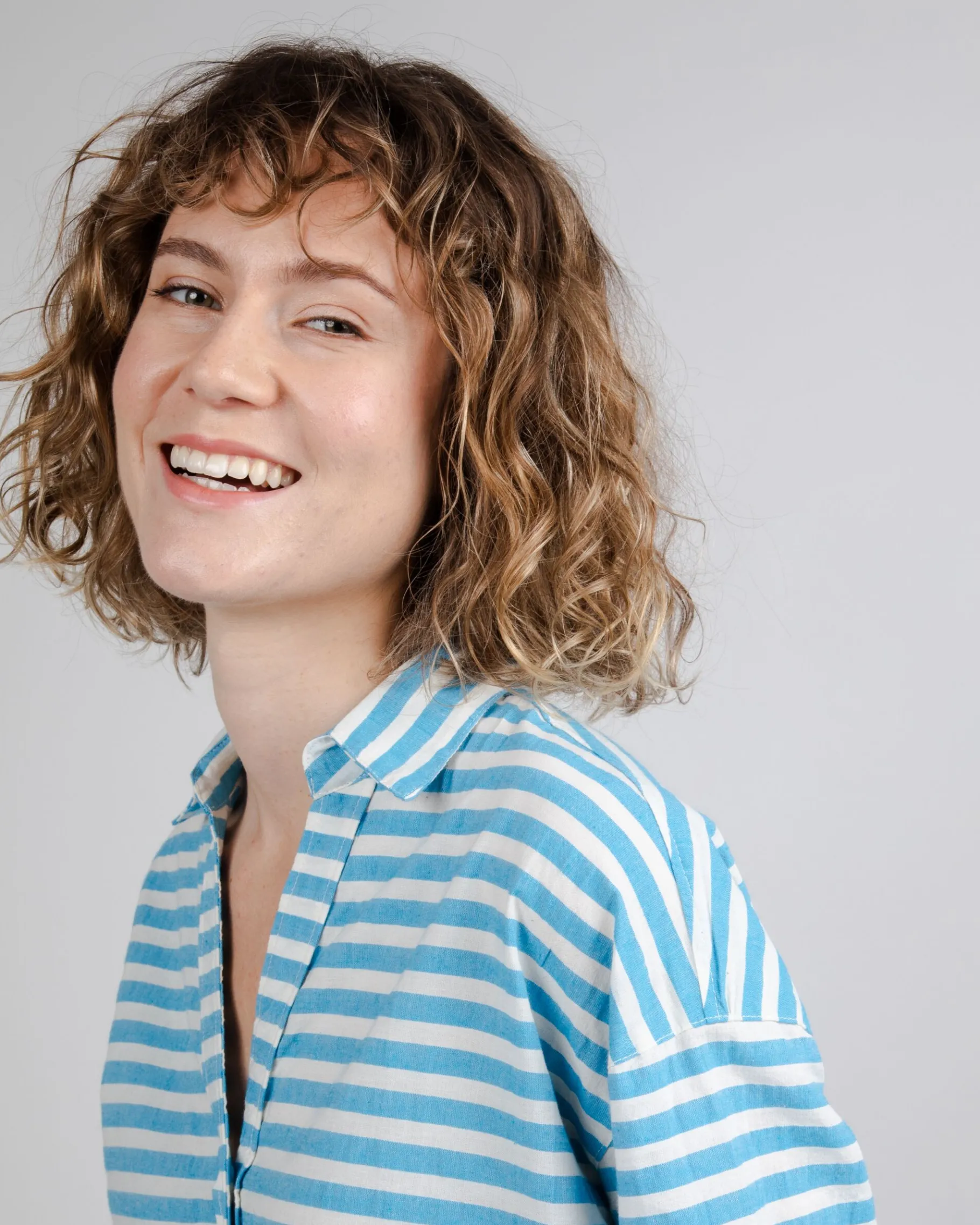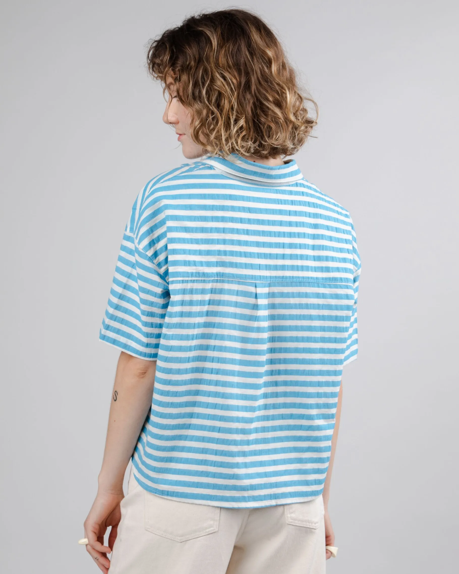 Übergroße, gestreifte Kurzarmbluse mit V-Ausschnitt, leicht überschnittener Schulter und Knopfverschluss.Ethisch hergestellt aus Bio-Baumwolle, recycelter Baumwolle und recyceltem Polyester.| Waschhinweise