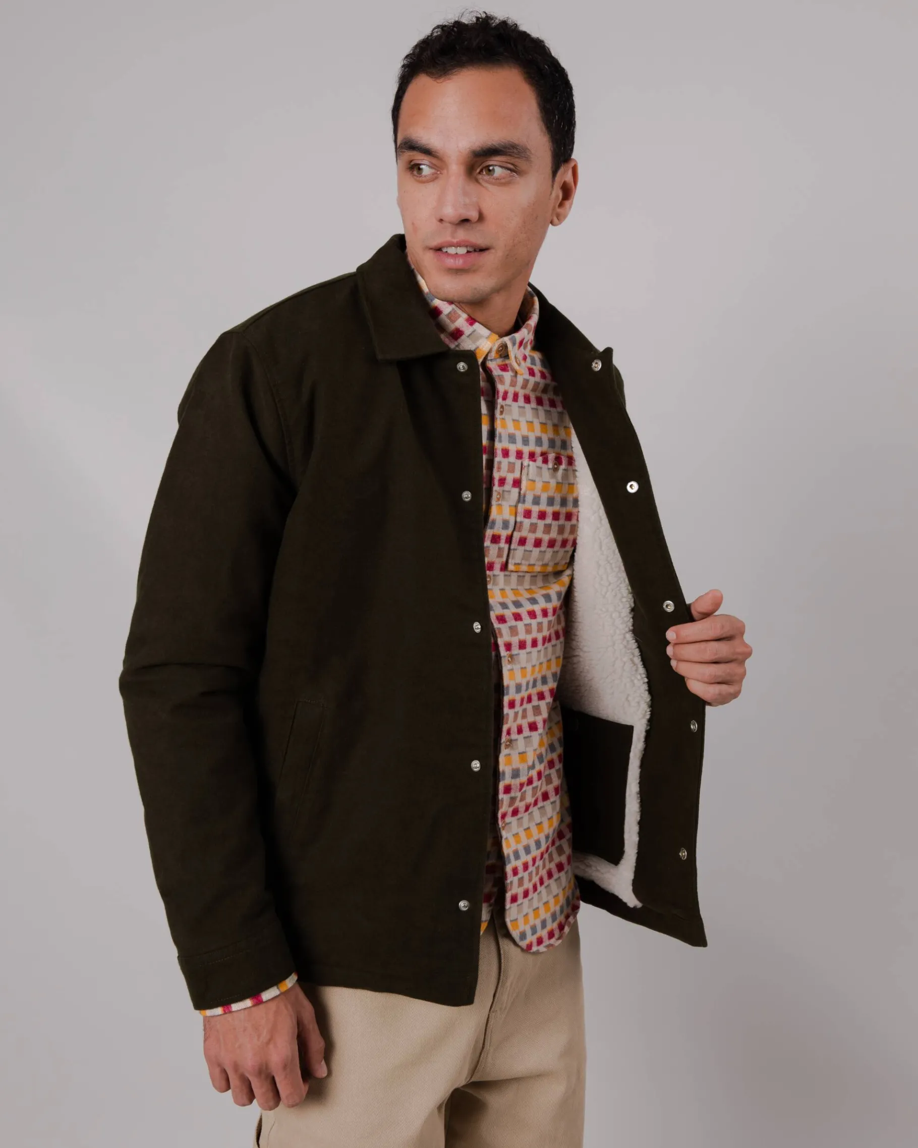 Gefütterte Teddy-Jacke in normaler Passform mit hemdartigen Kragen, Innentasche, gerippten Ärmeln und Druckknopfverschluss. Die perfekte Übergangsjacke, ethisch hergestellt aus Bio-Baumwolle, sowie recyceltes Polyester und Acryl für das Innenfutter.| Waschhinweise