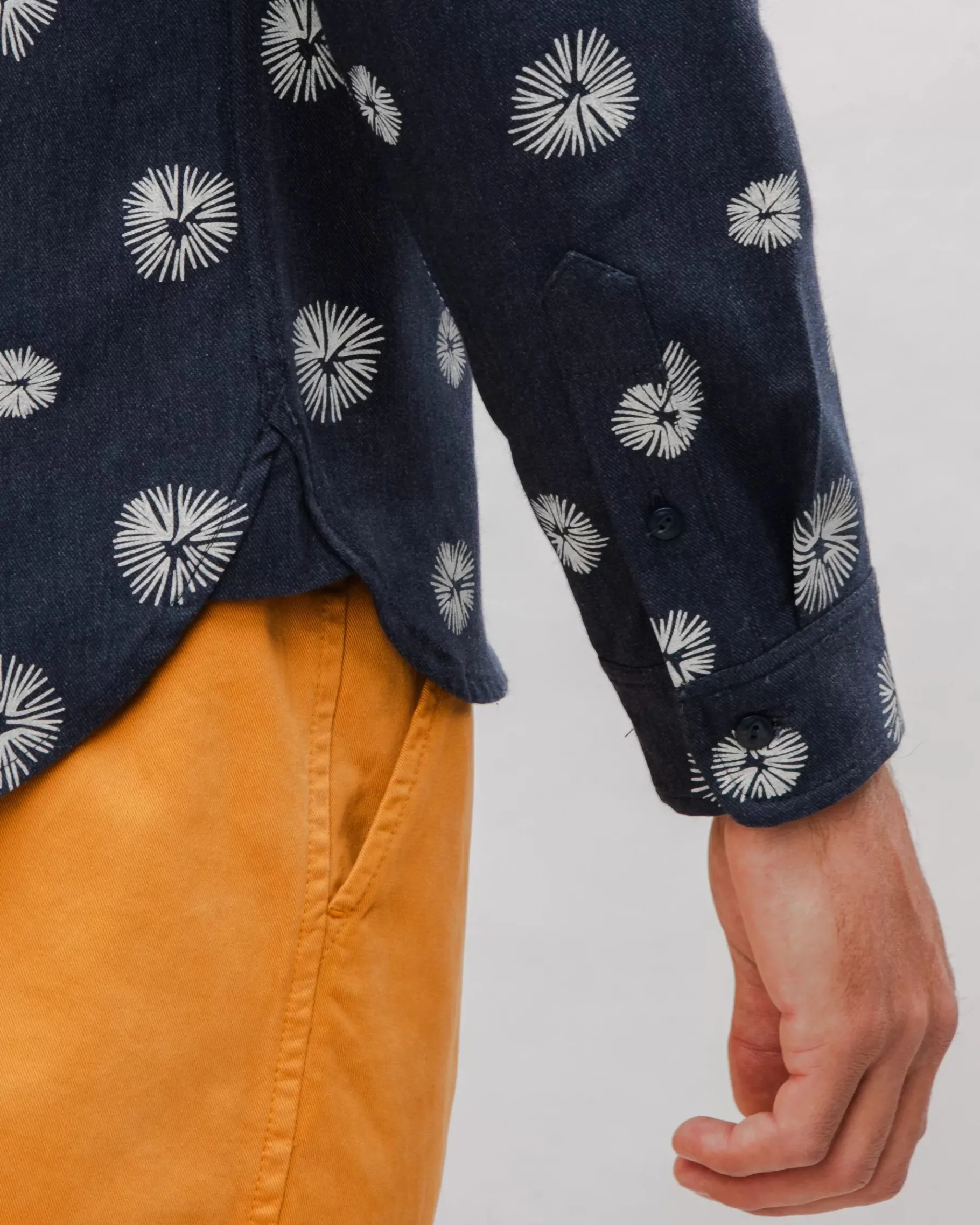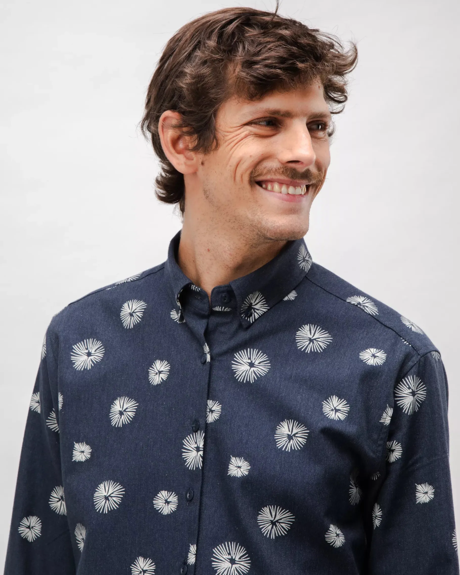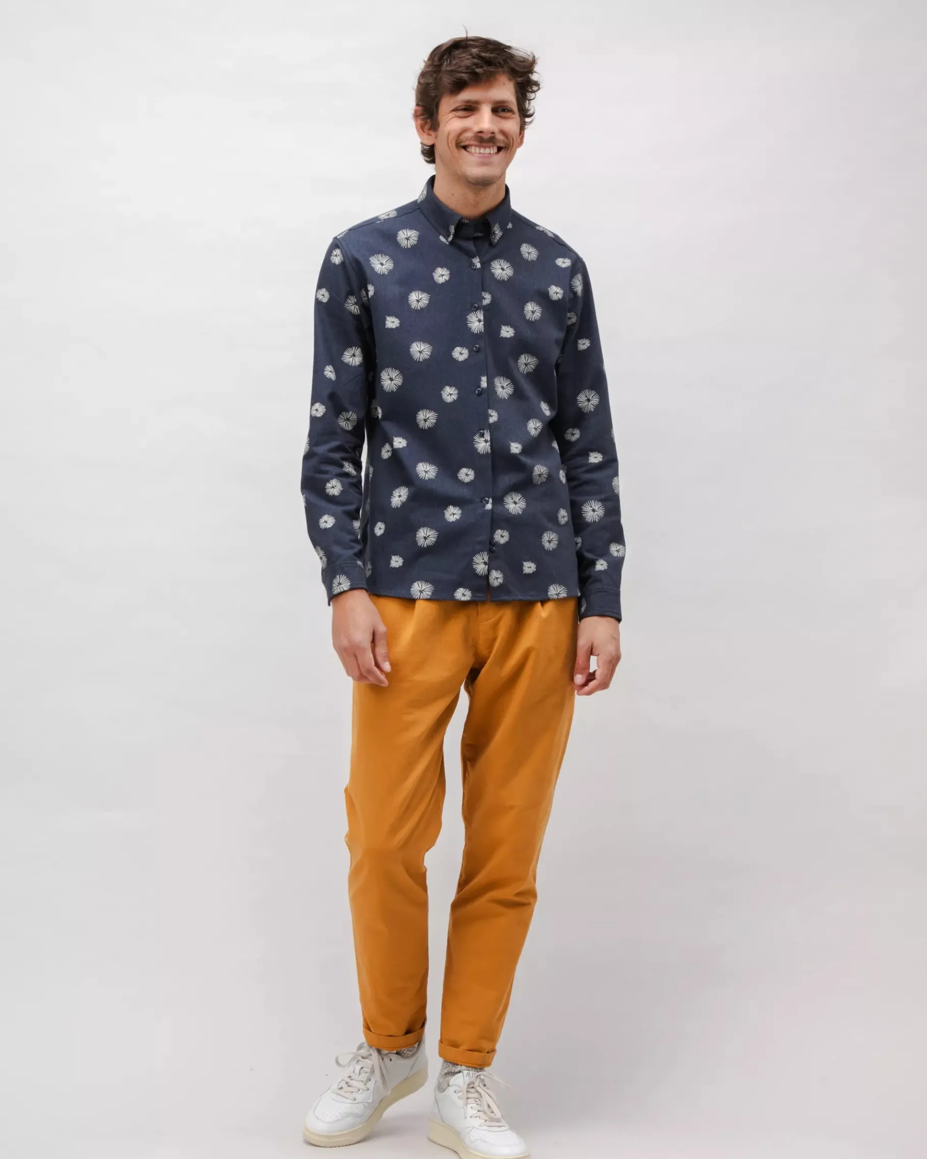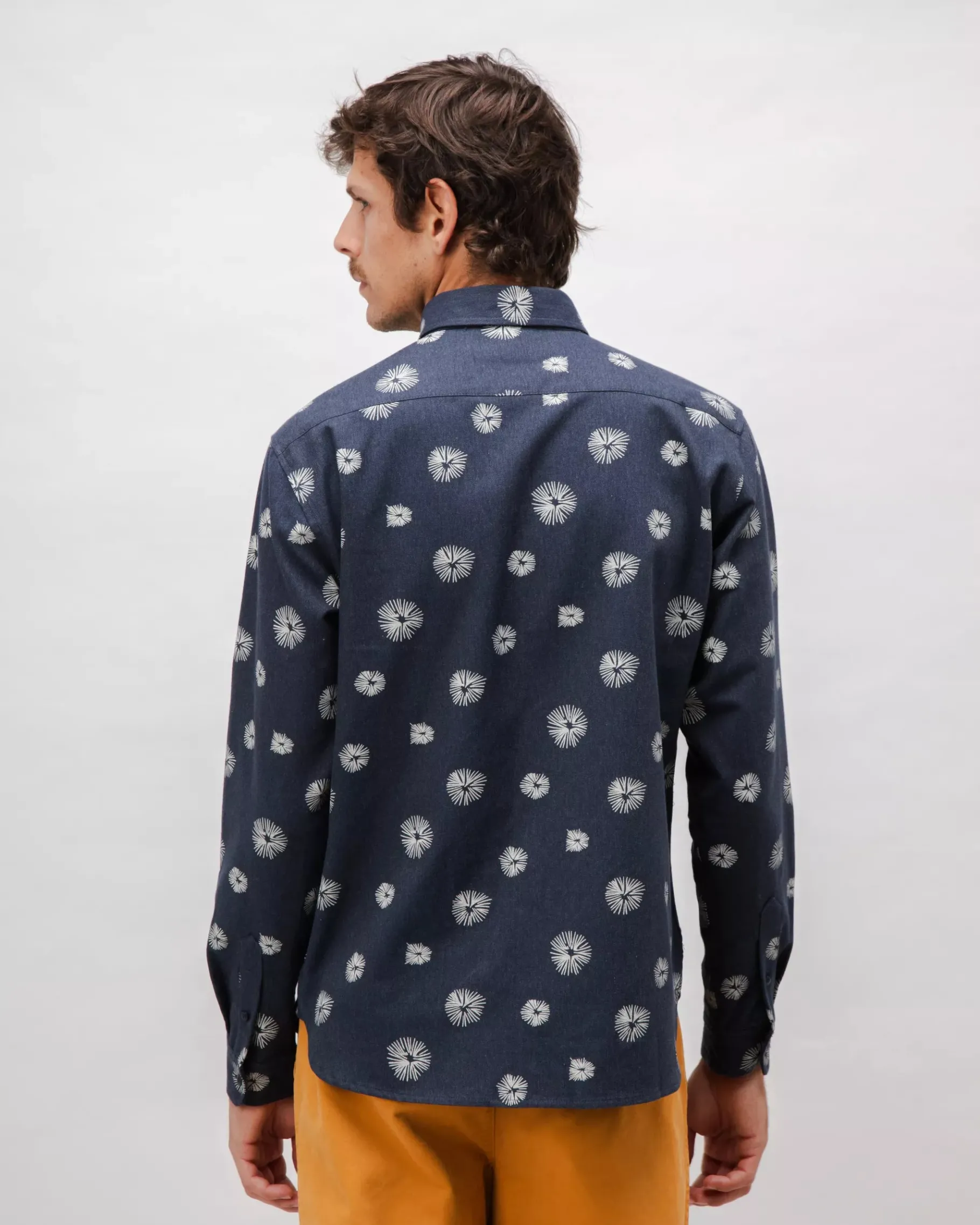 Long-sleeved printed shirt, with a regular fit and straight cut, featuring a decorative detail on the sleeve hem. It has a dropped armhole, shirt collar, and front closure with buttons. Ethically made from organic cotton.| Washing instructions