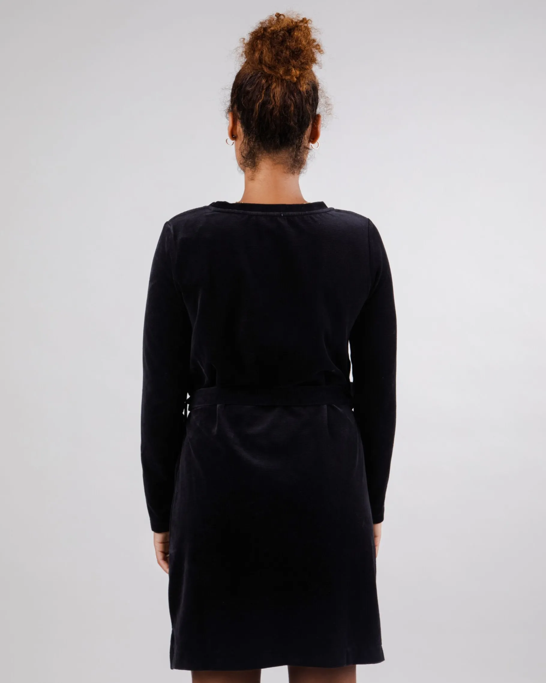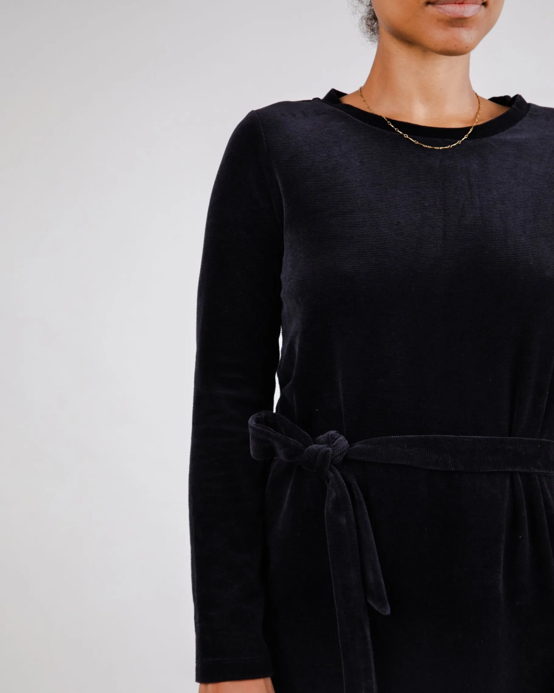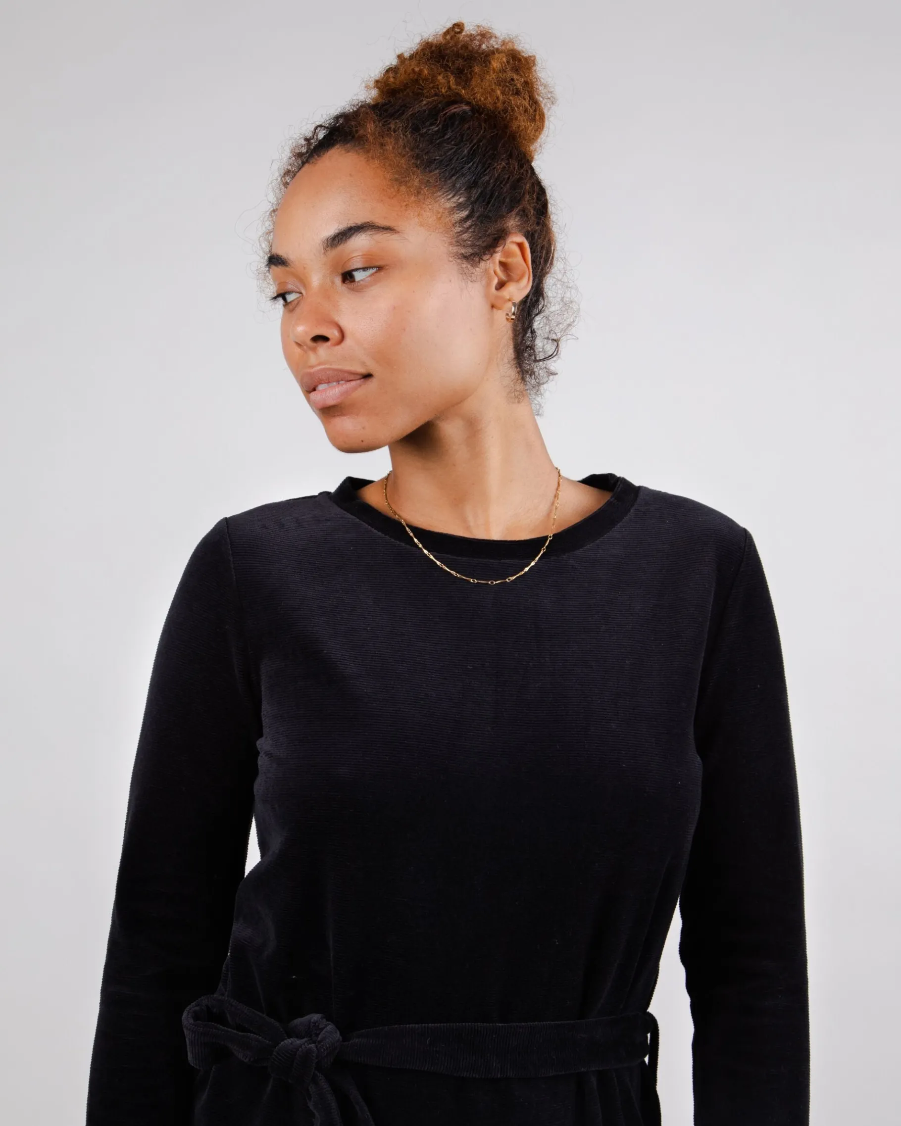 Kurzes Samtkleid mit Gürtel und rundem Kragen in normaler Passform. Ethisch hergestellt aus Bio-Baumwolle, Polyester und Elastan.| Waschhinweise