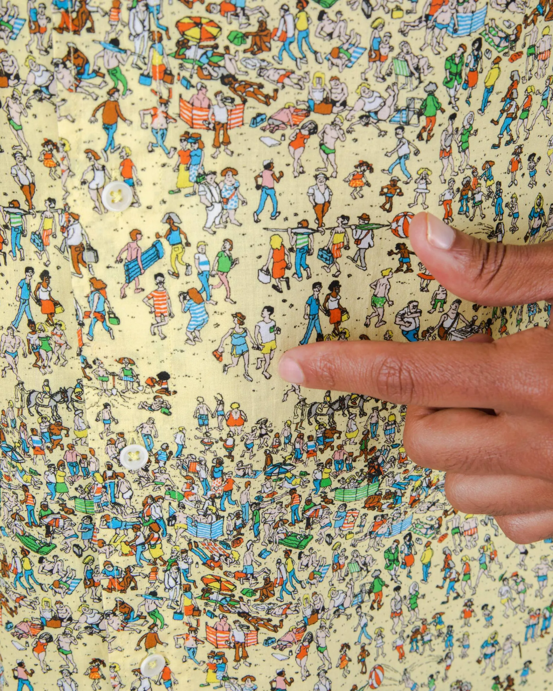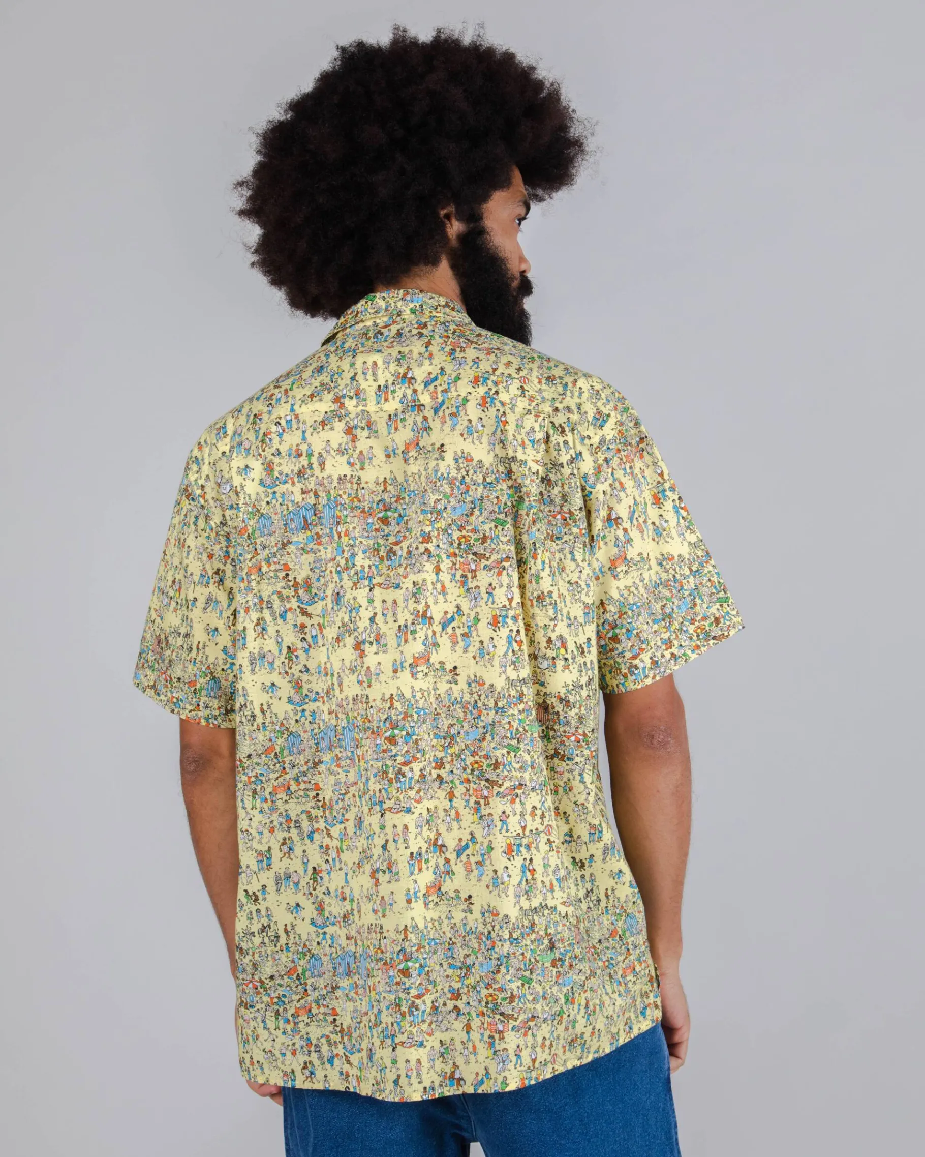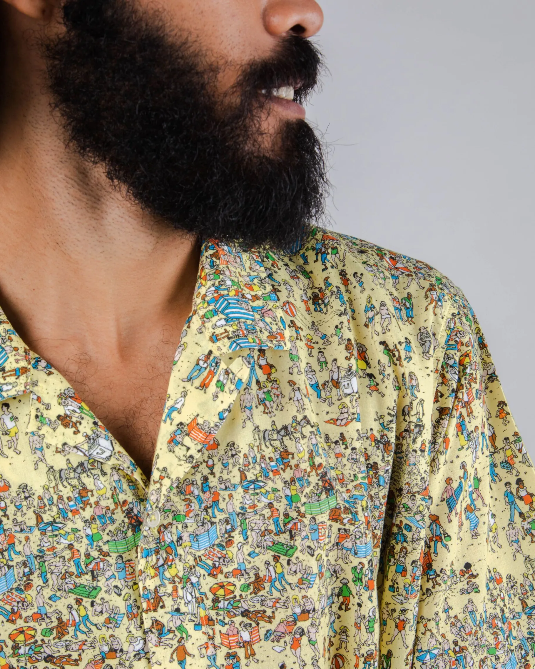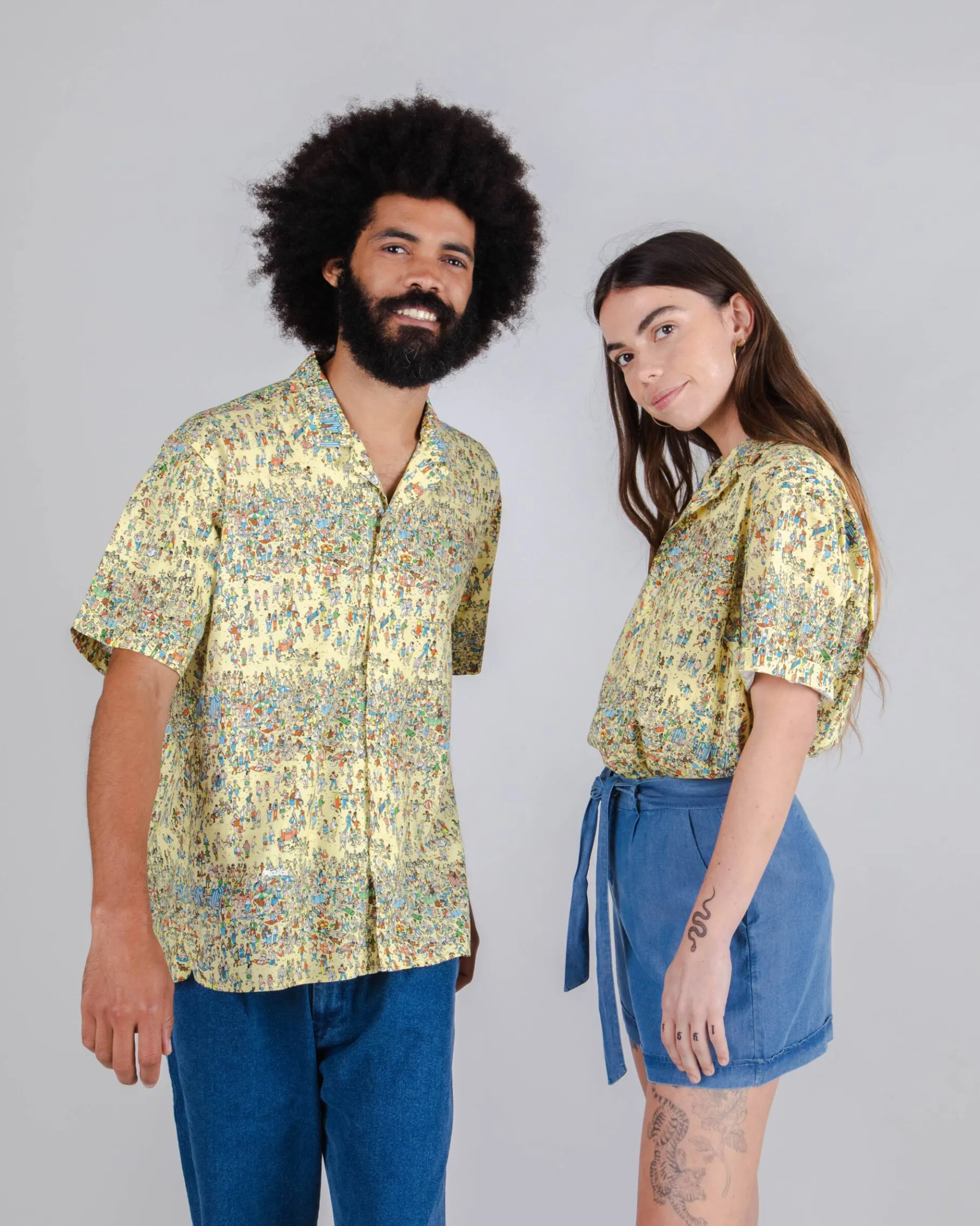 Locker geschnittenes, kurzärmeliges Aloha-Shirt mit Where’s Wally-Aufdruck. Es hat eine leicht überschnittene Schulter, einen geraden Saum, einen Reverskragen und einen Knopfverschluss. Ethisch hergestellt aus biologischer Baumwolle.| Waschhinweise