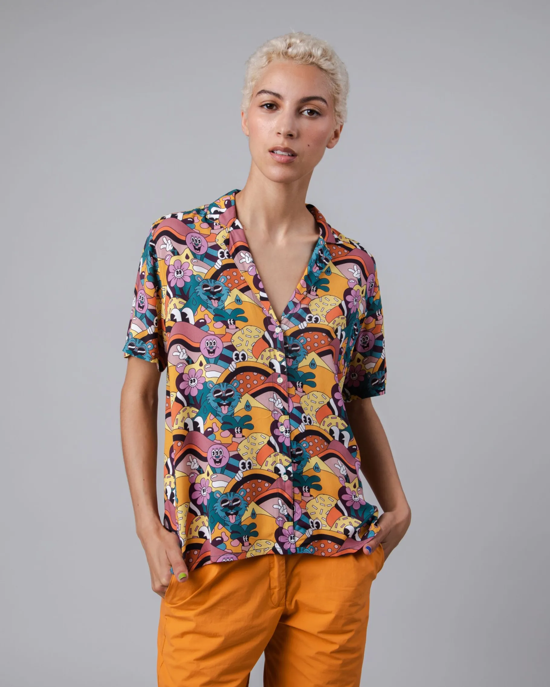 Locker geschnittene, kurzärmelige Aloha-Bluse mit einer Illustration in Zusammenarbeit mit dem Künstler Yeye Weller. Sie hat eine leicht überschnittene Schulter, einen geraden Saum, einen Lagerkragen und einen Knopfverschluss. Ethisch hergestellt aus nachhaltiger Viskose.| Waschhinweise